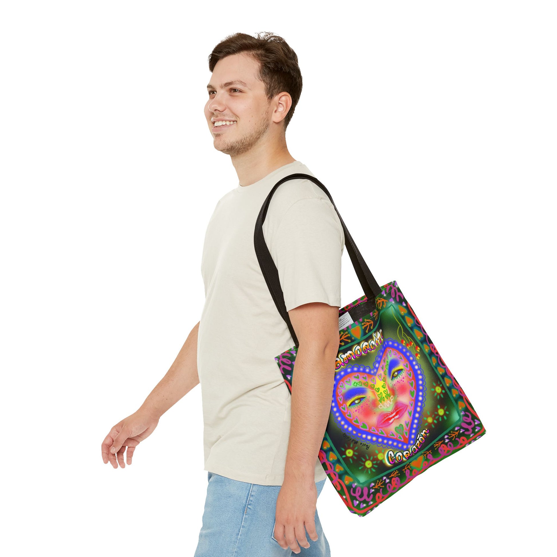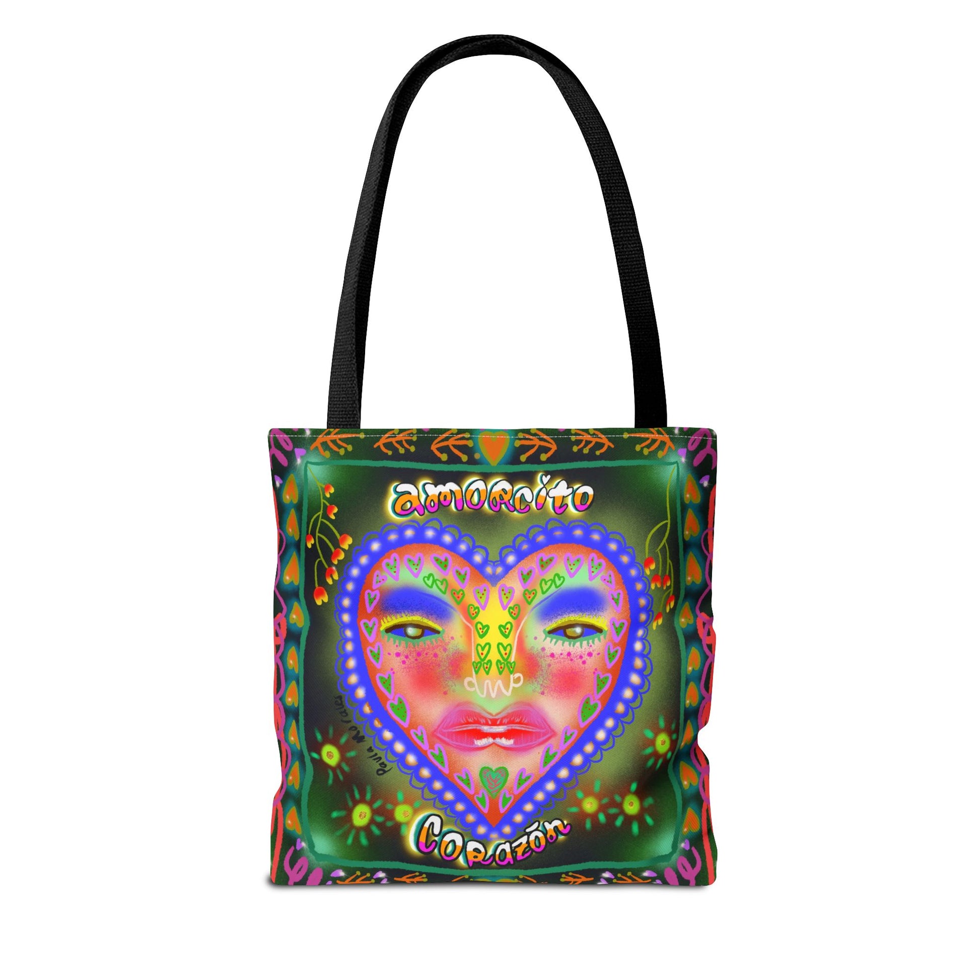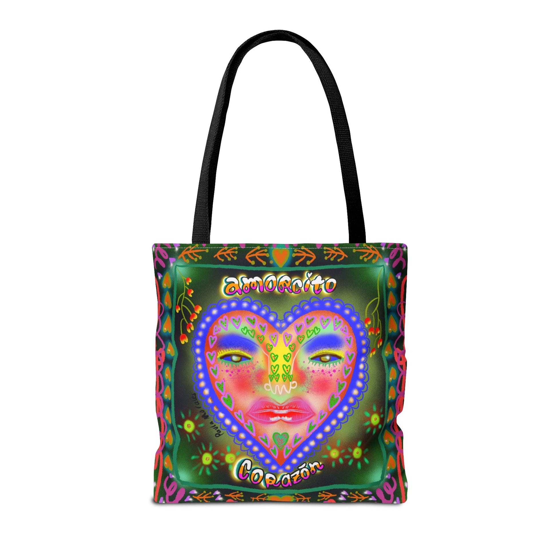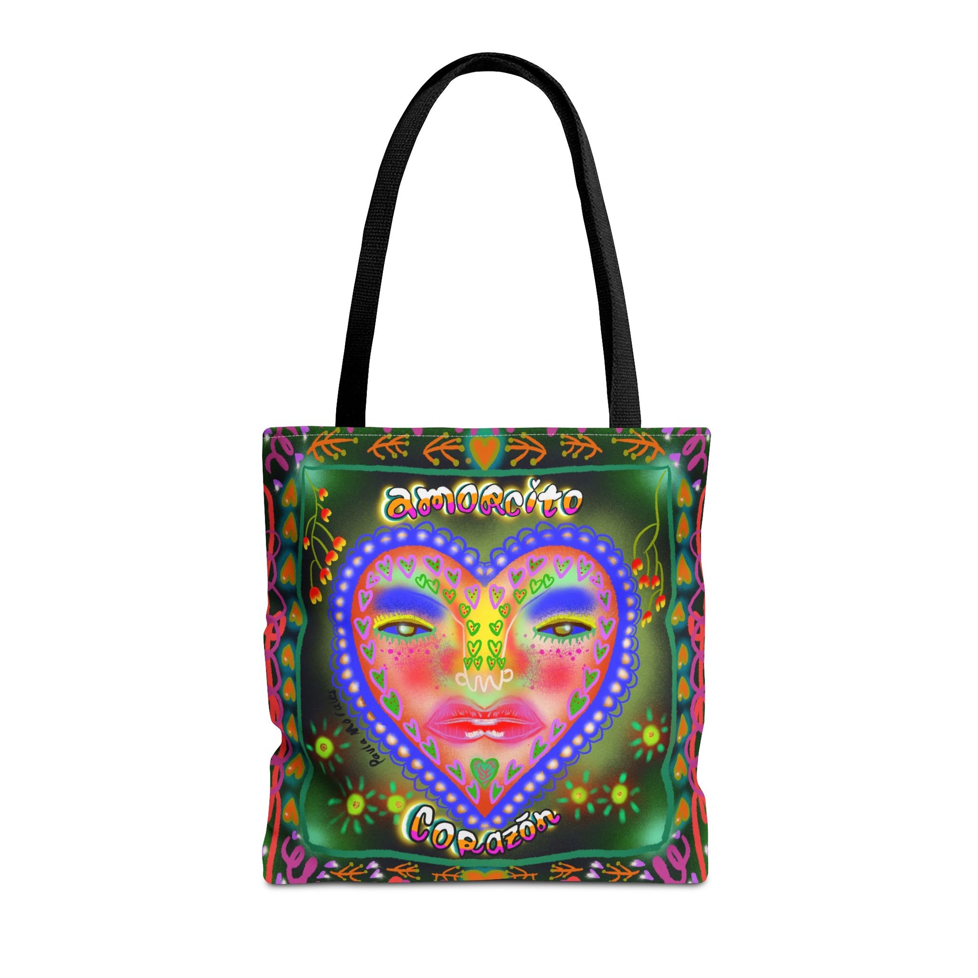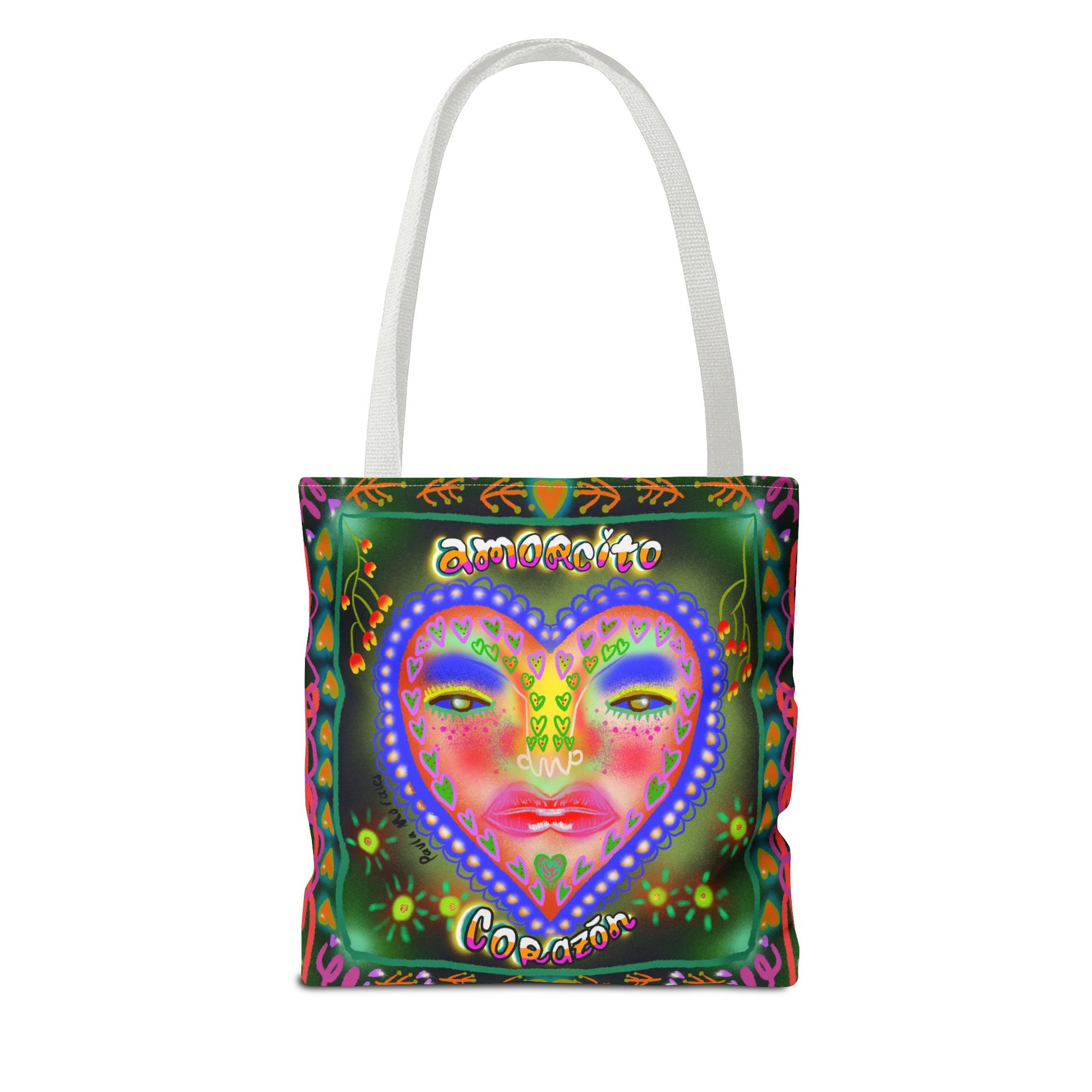 A colorful and uplifting tote bag featuring the message "Amorcito Corazón" with vibrant, abstract patterns designed by Paula Morales. This playful and energetic design is perfect for reminding you of your worth while adding a splash of color to your daily routine. Ideal for carrying essentials with style and purpose.