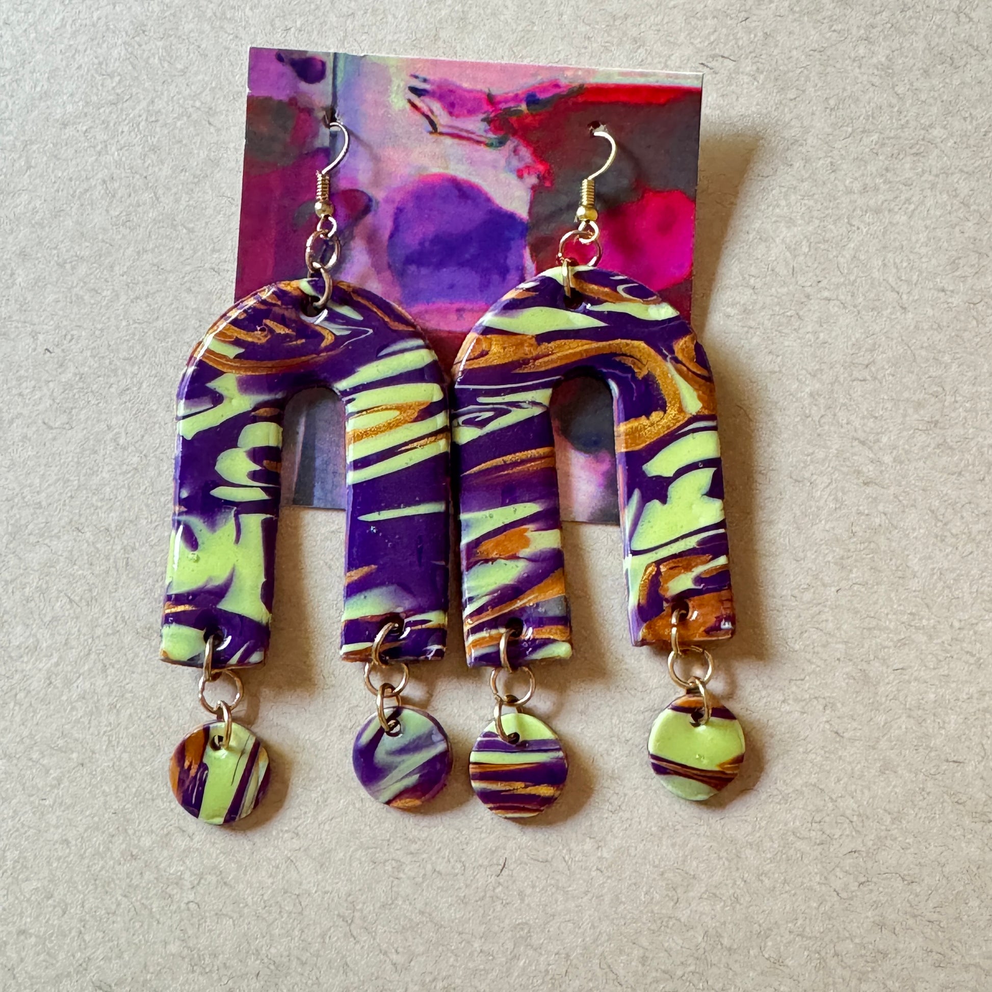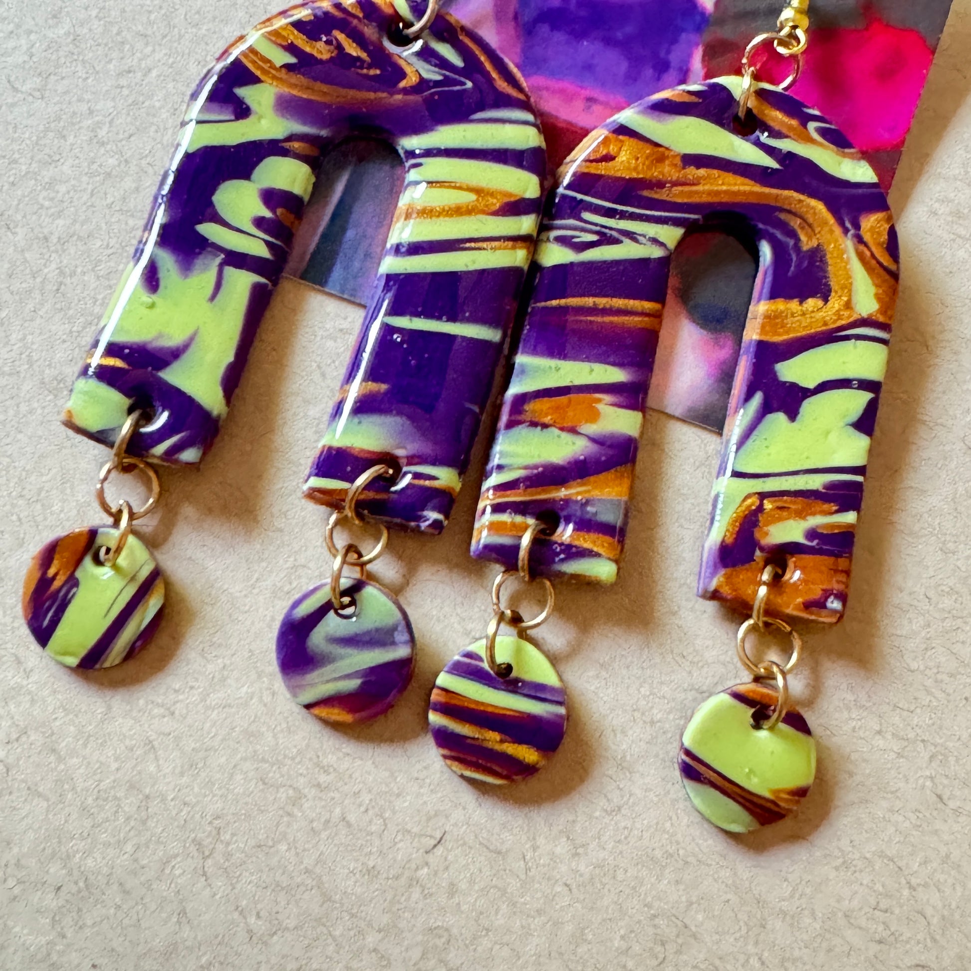 🧿 Material: Hand-marbled polymer clay in ultraviolet purple, citrus green, and metallic copper