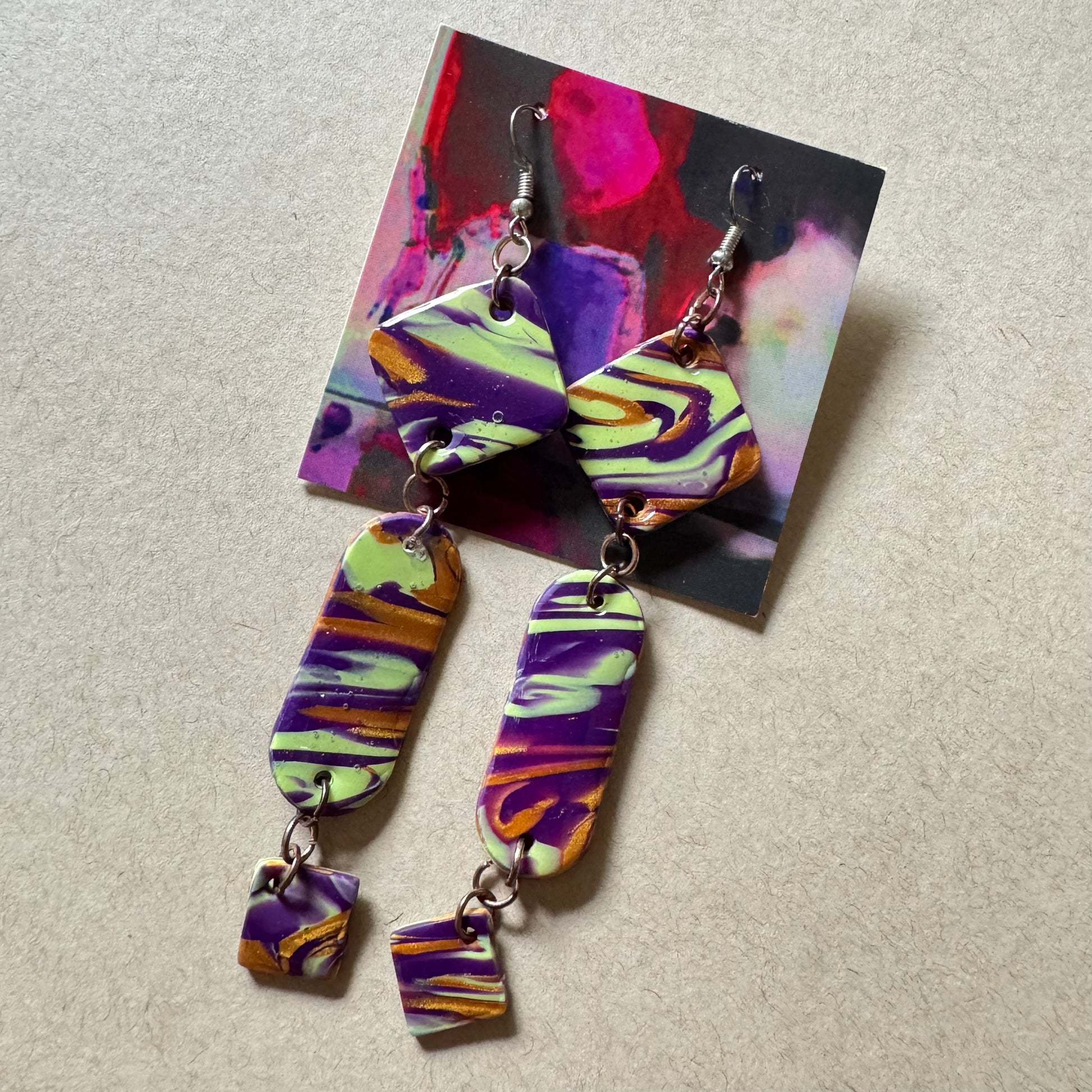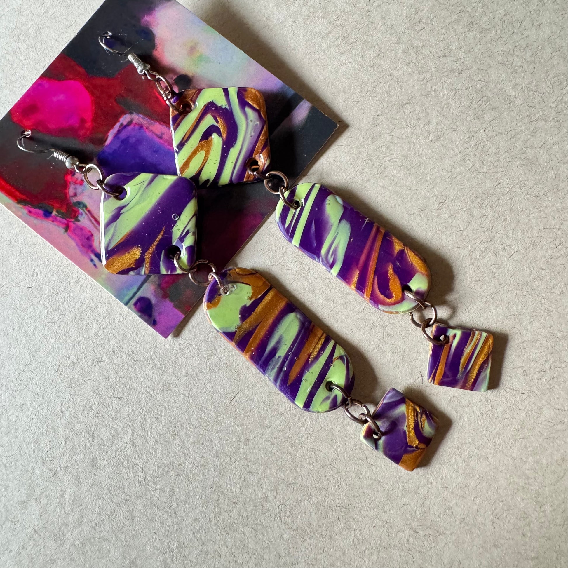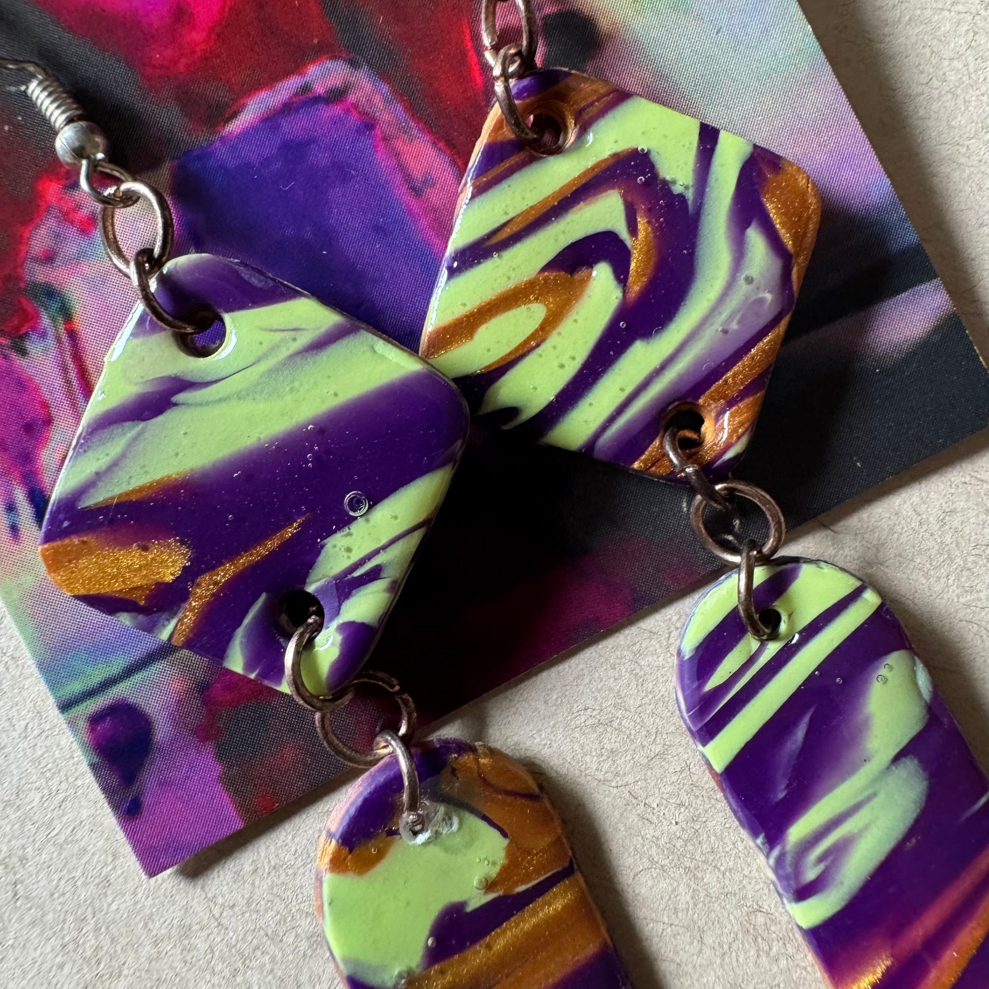 Bosque Torcido es como entrar a un bosque donde nada crece en línea recta. Estos aretes de 4.5 pulgadas se enroscan con fuerza—atrevidos, fluidos y salvajes. Marmoleados en verdes y ocres, evocan lianas buscando la luz, historias que brotan torcidas pero vivas.
