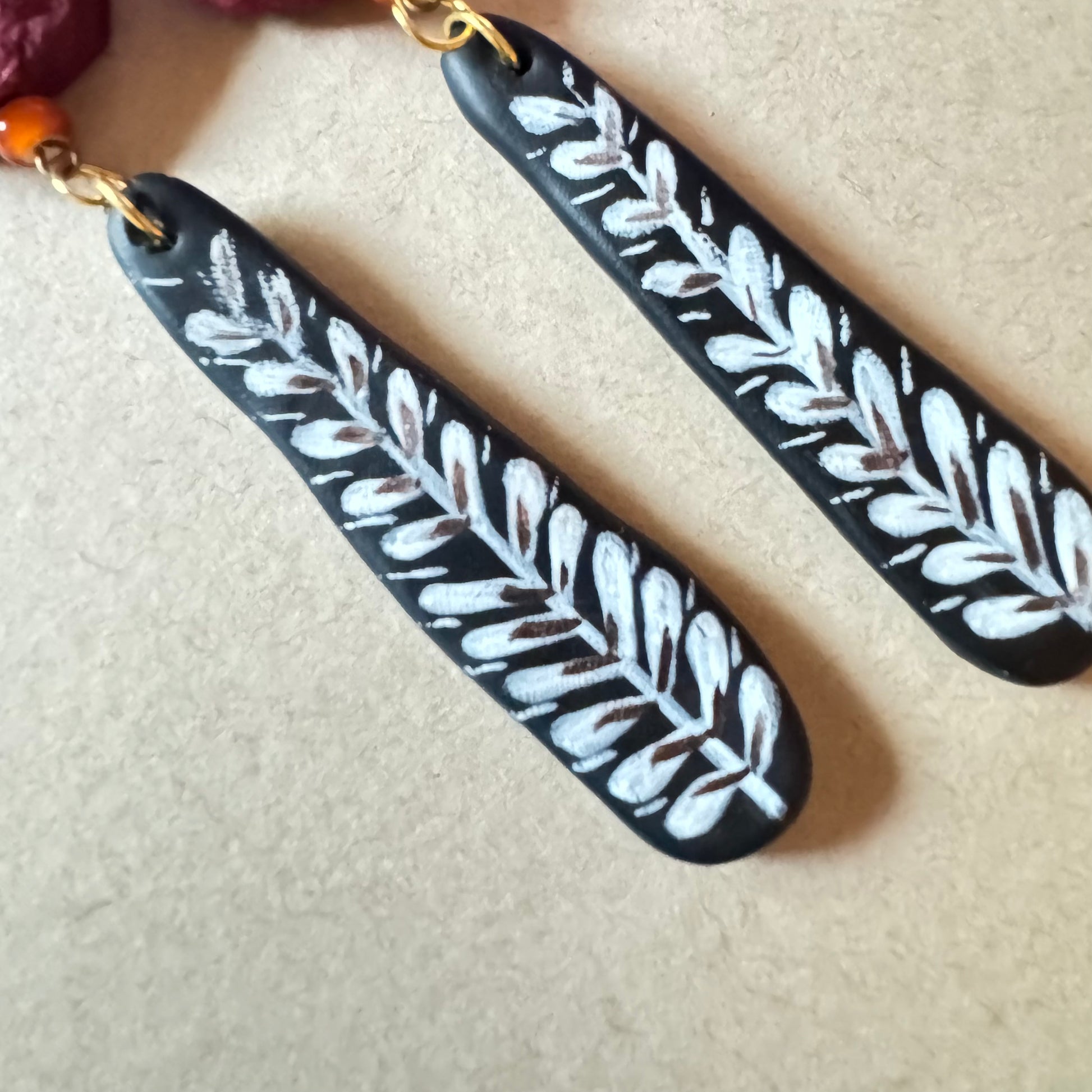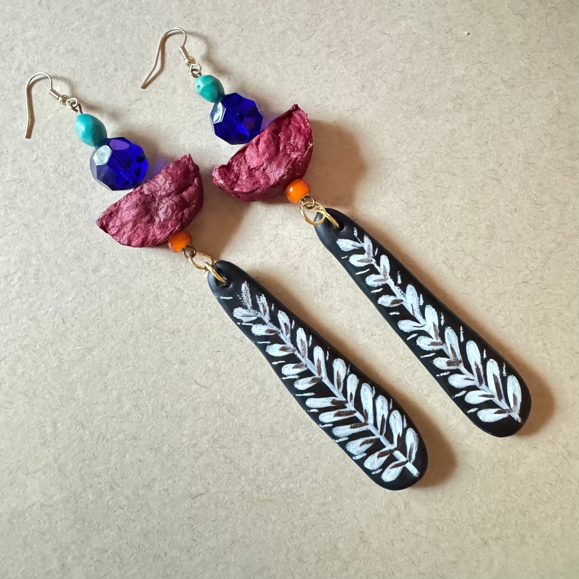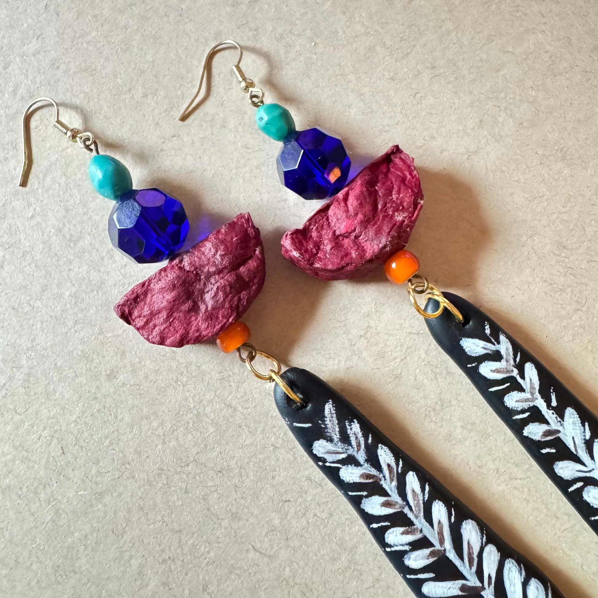 These sculptural earrings blend hand-painted polymer clay with deep red papier-mâché and glass bead accents in electric blue and turquoise. The black dangles are adorned with a white botanical motif—like a midnight sketch in motion.