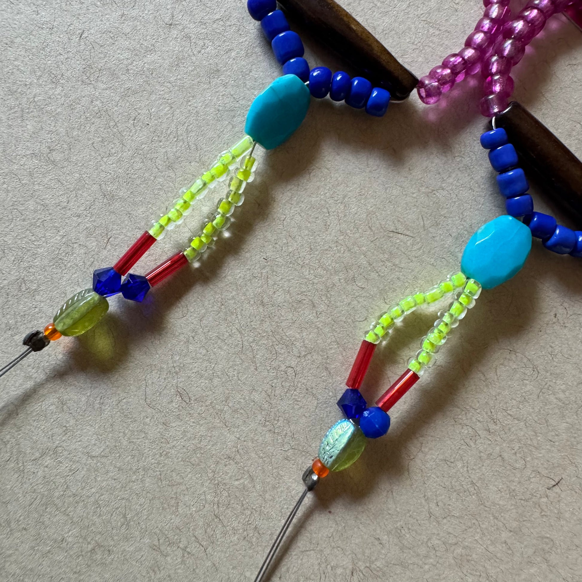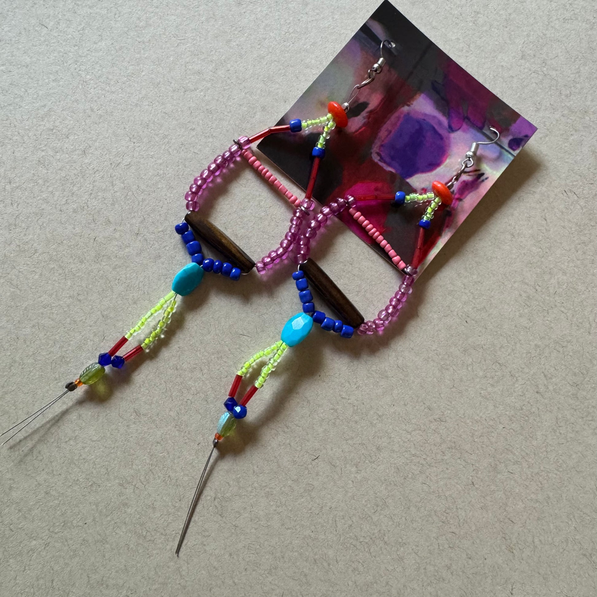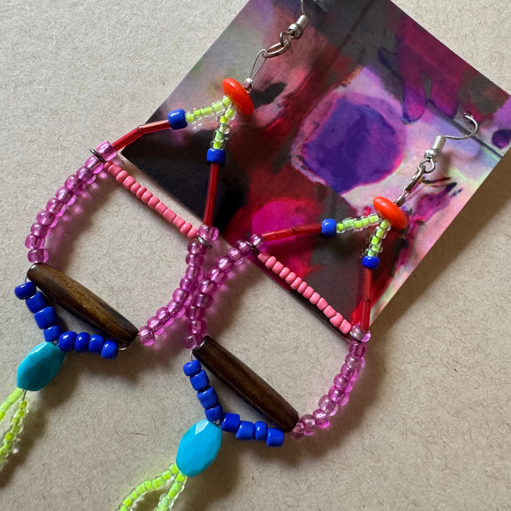These 6-inch earrings look like technicolor transmitters — beaded antennas receiving frequencies from joy itself. With wooden accents, neon greens, fuchsia loops, and bold blue details, they’re a statement of playful architecture and wearable movement.