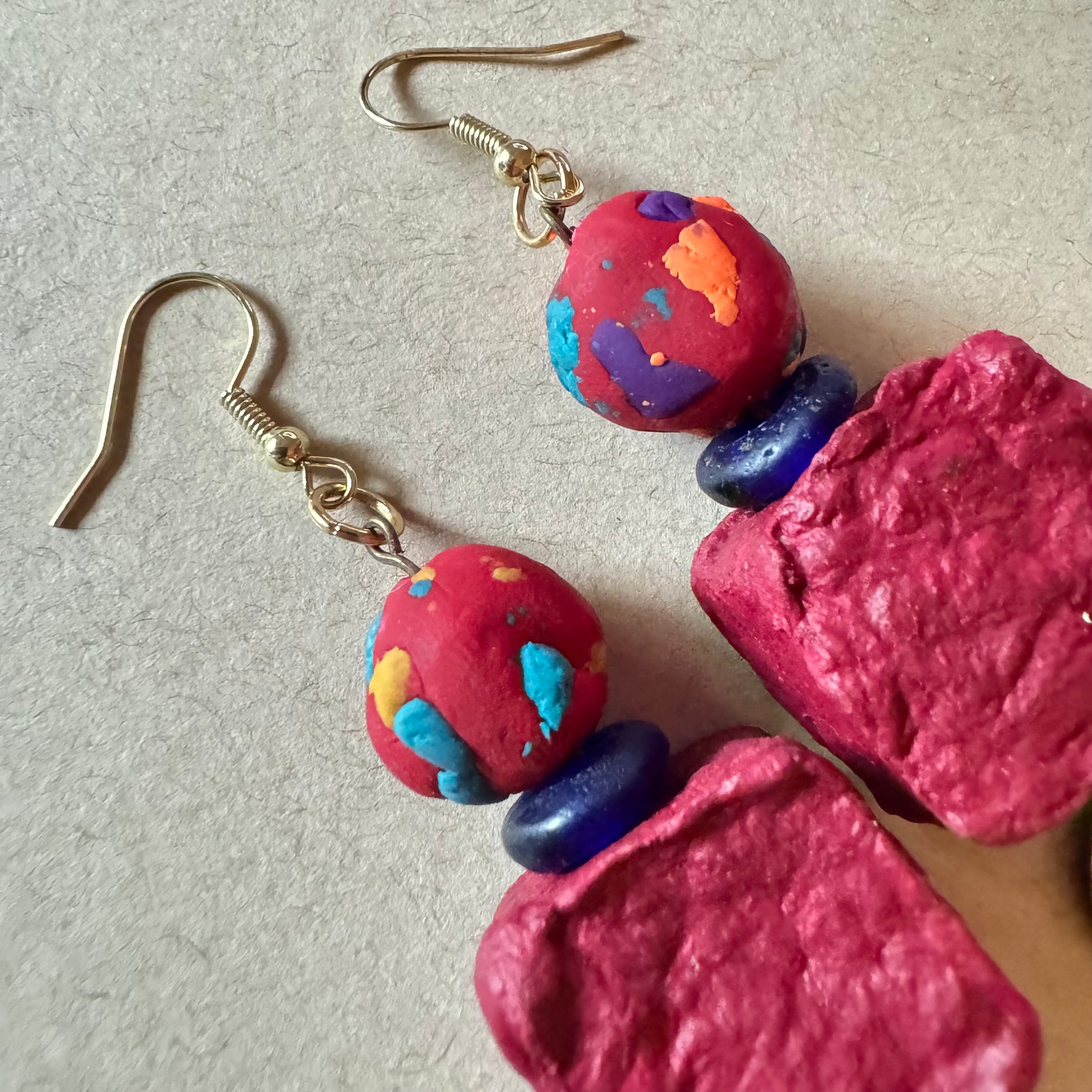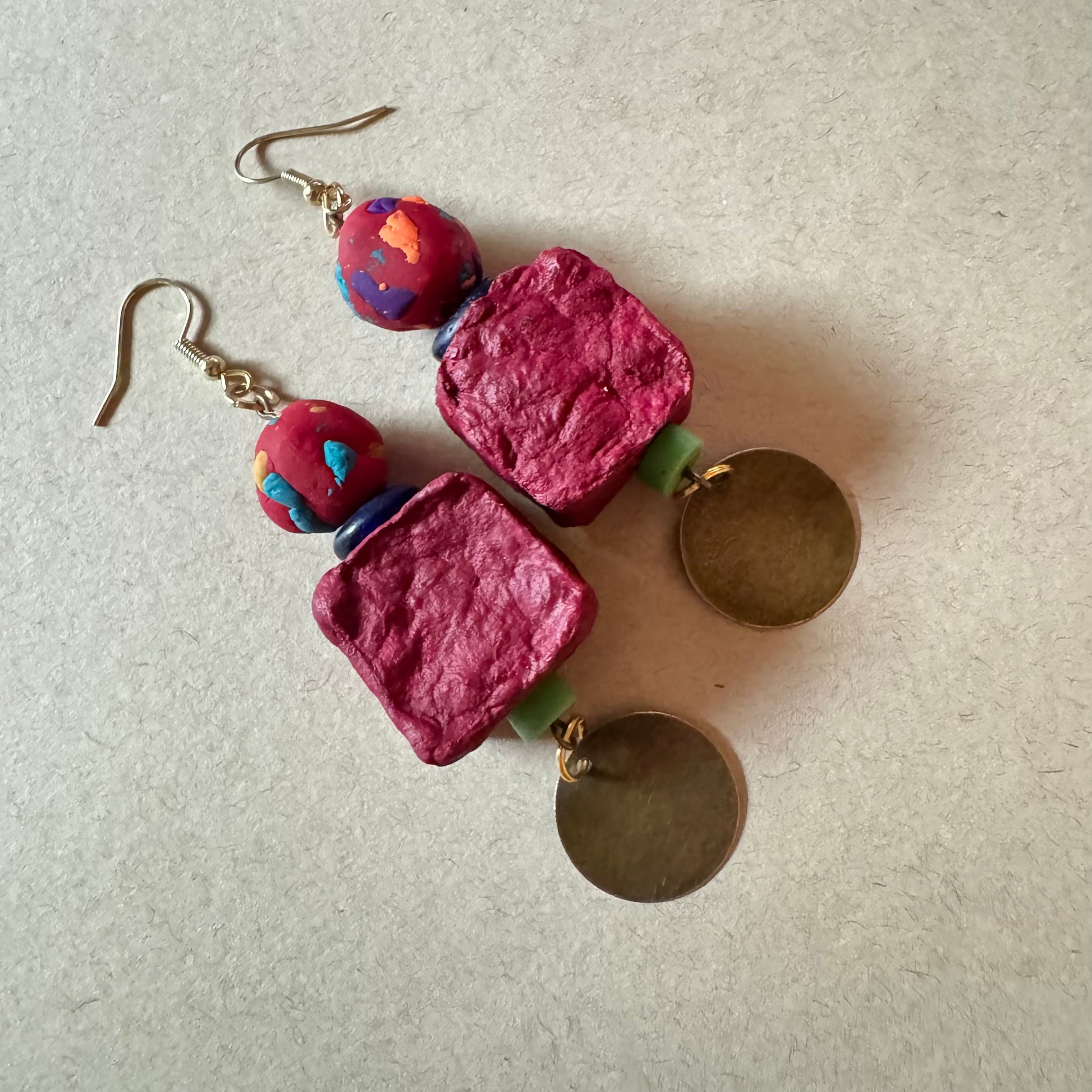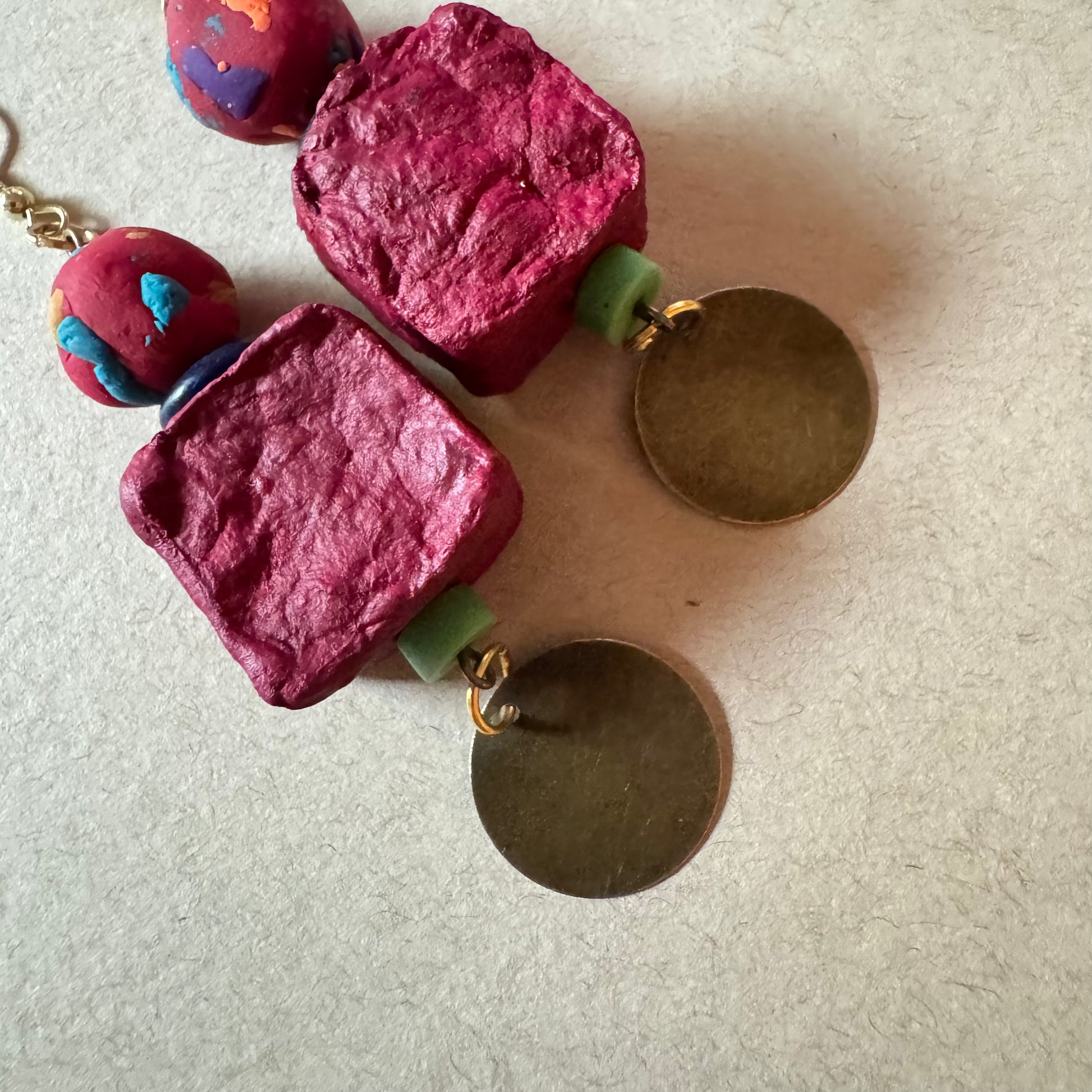 With polymer clay, vintage glass, and richly textured papier-mâché, these earrings are sculptural and sonorous—topped off with a soft clink of metal at the base. The chunky red squares feel almost architectural, while the colorful hand-formed beads add a playful tension.