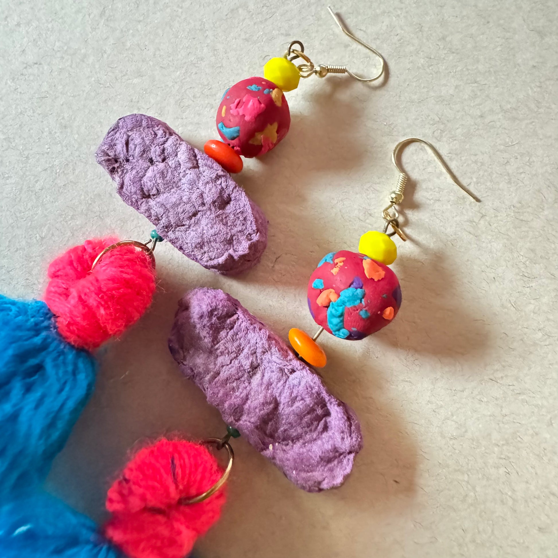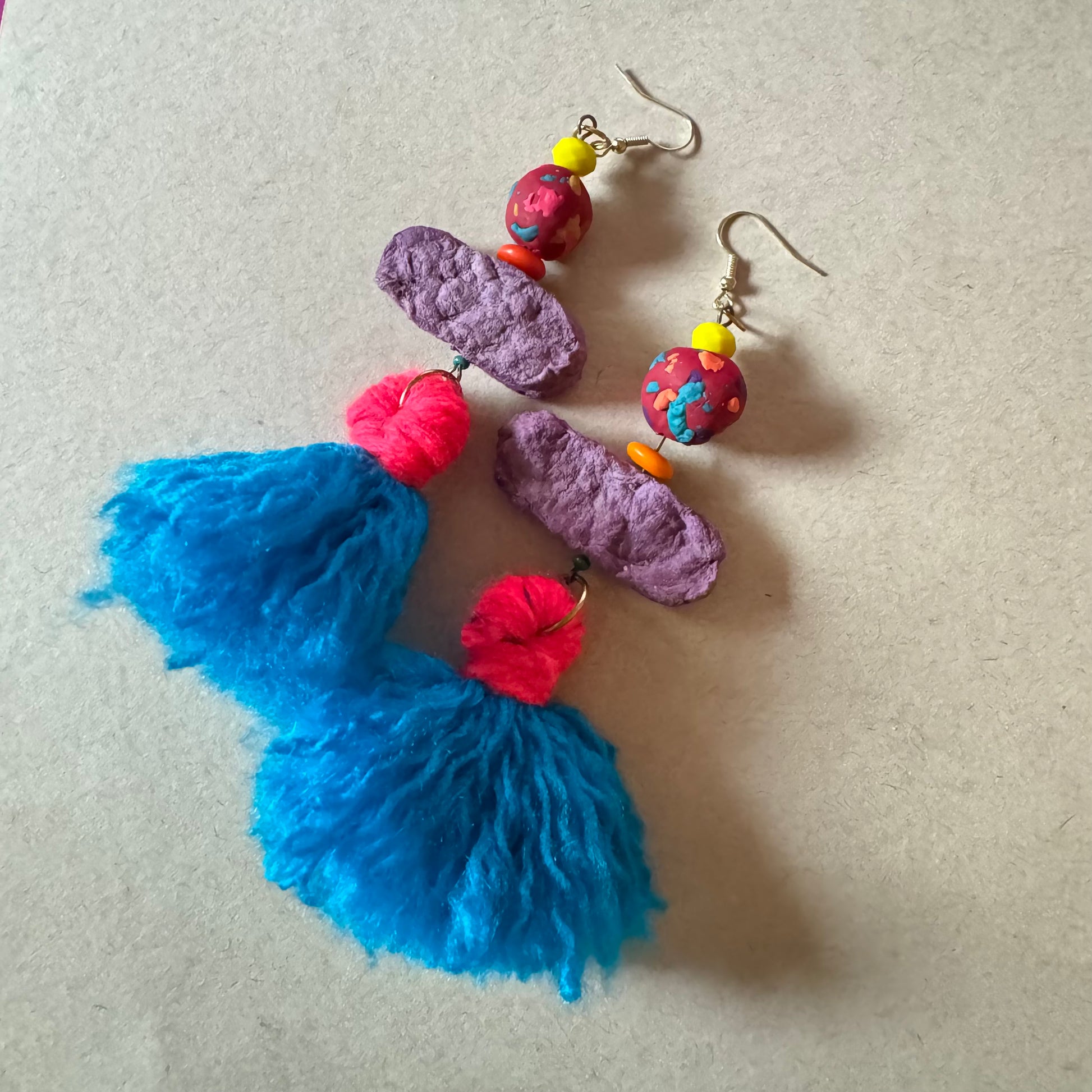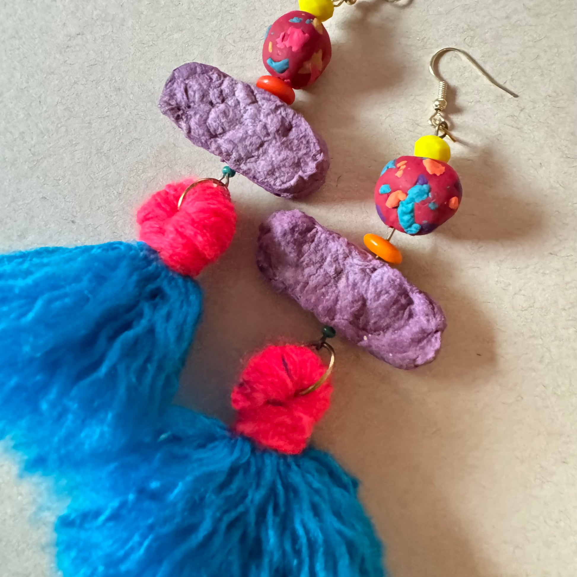 Bold, joyful, and unapologetically playful—these earrings are a celebration of movement and color. Made with hand-formed paper mache, polymer clay beads, hot pink pom-poms, and electric blue yarn tassels, they channel the energy of festival kites and firecrackers. Each piece is lightweight and entirely one-of-a-kind, perfect for adding a splash of wonder to your everyday orbit.