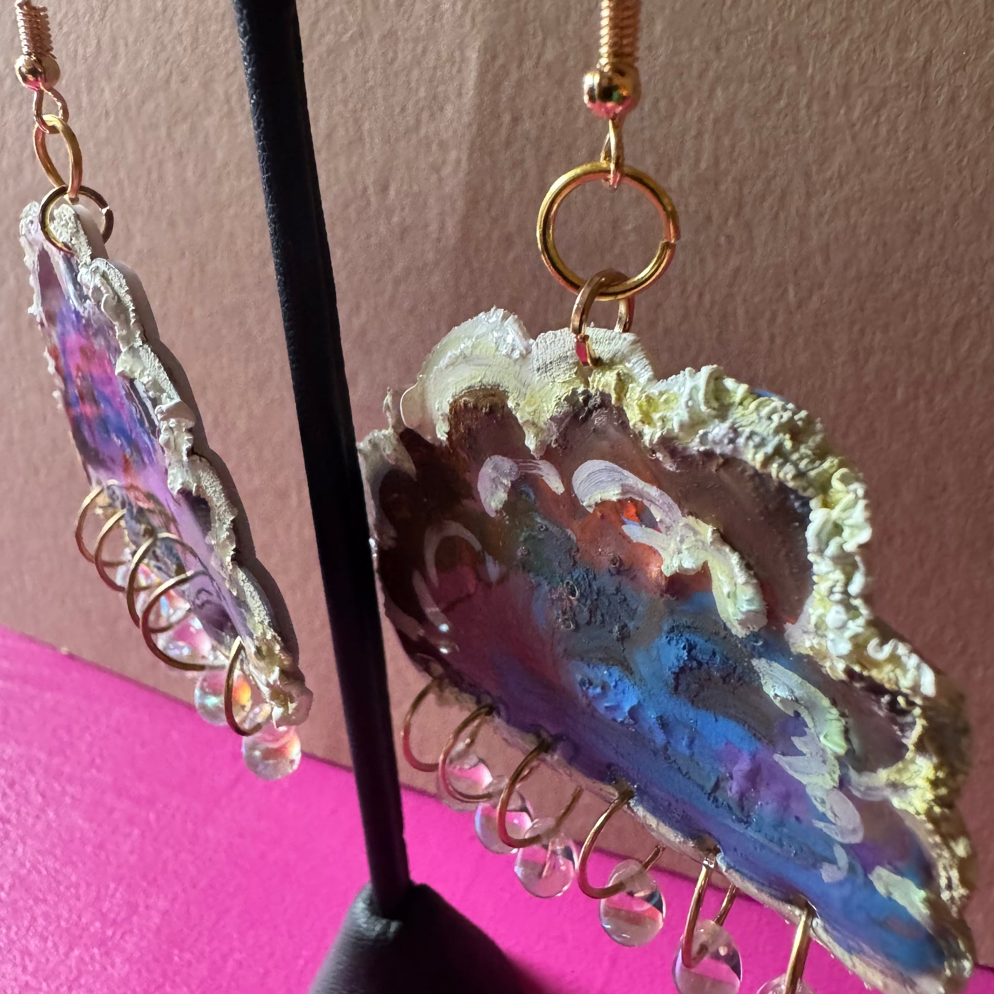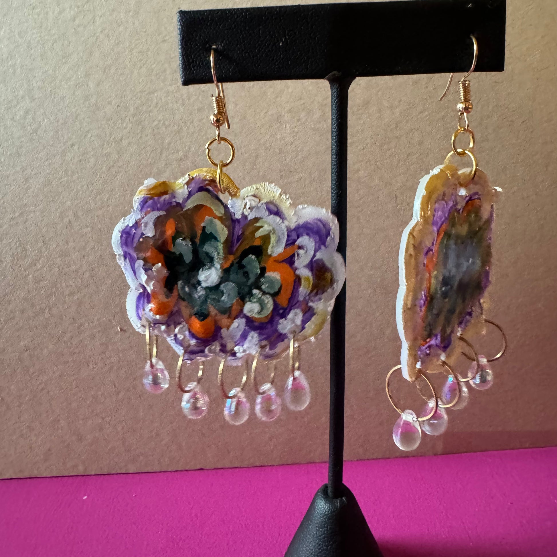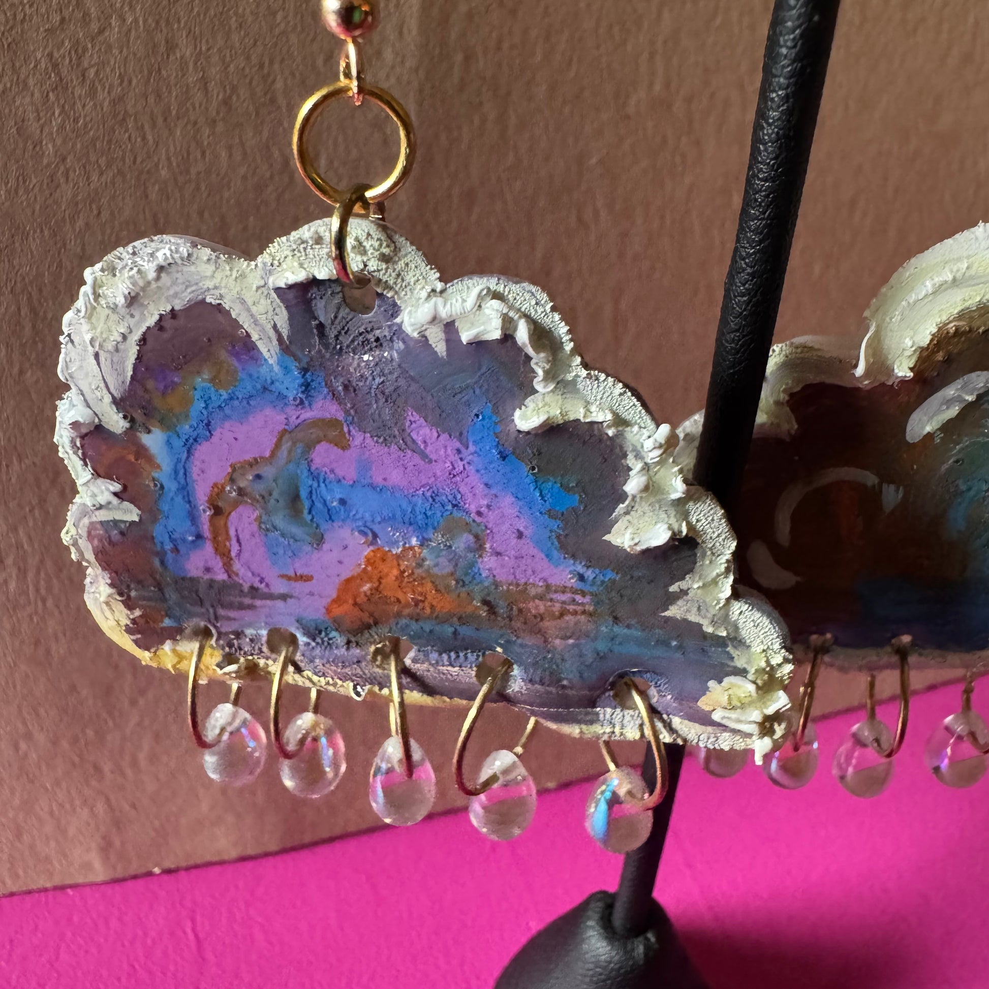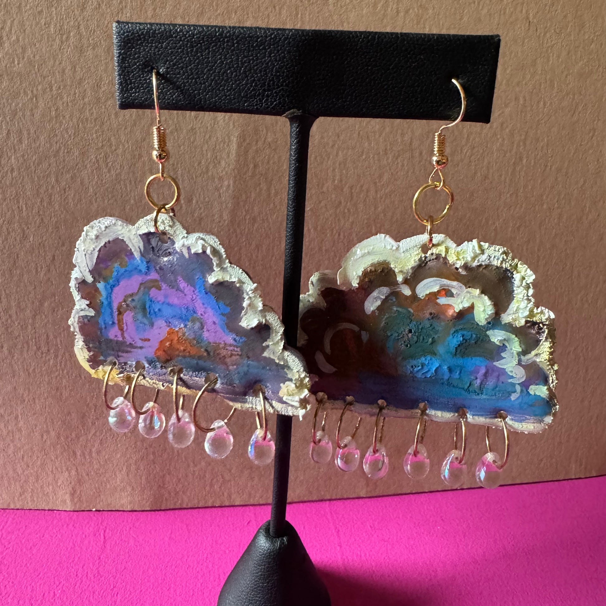 These earrings feature hand-painted clouds on shrinkable plastic, sealed with acrylic and adorned with glass teardrop beads. Lightweight and full of feeling, they celebrate all kinds of weather—internal and otherwise.