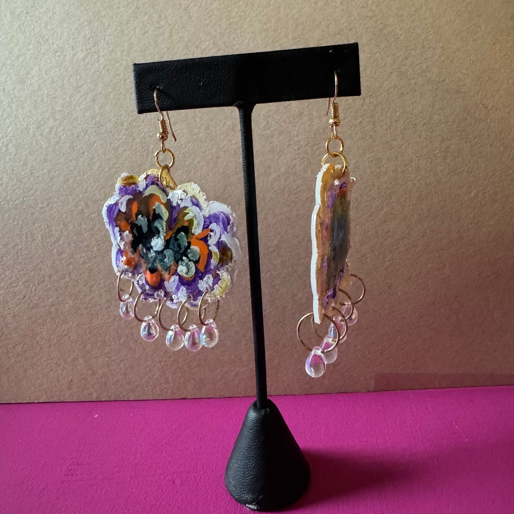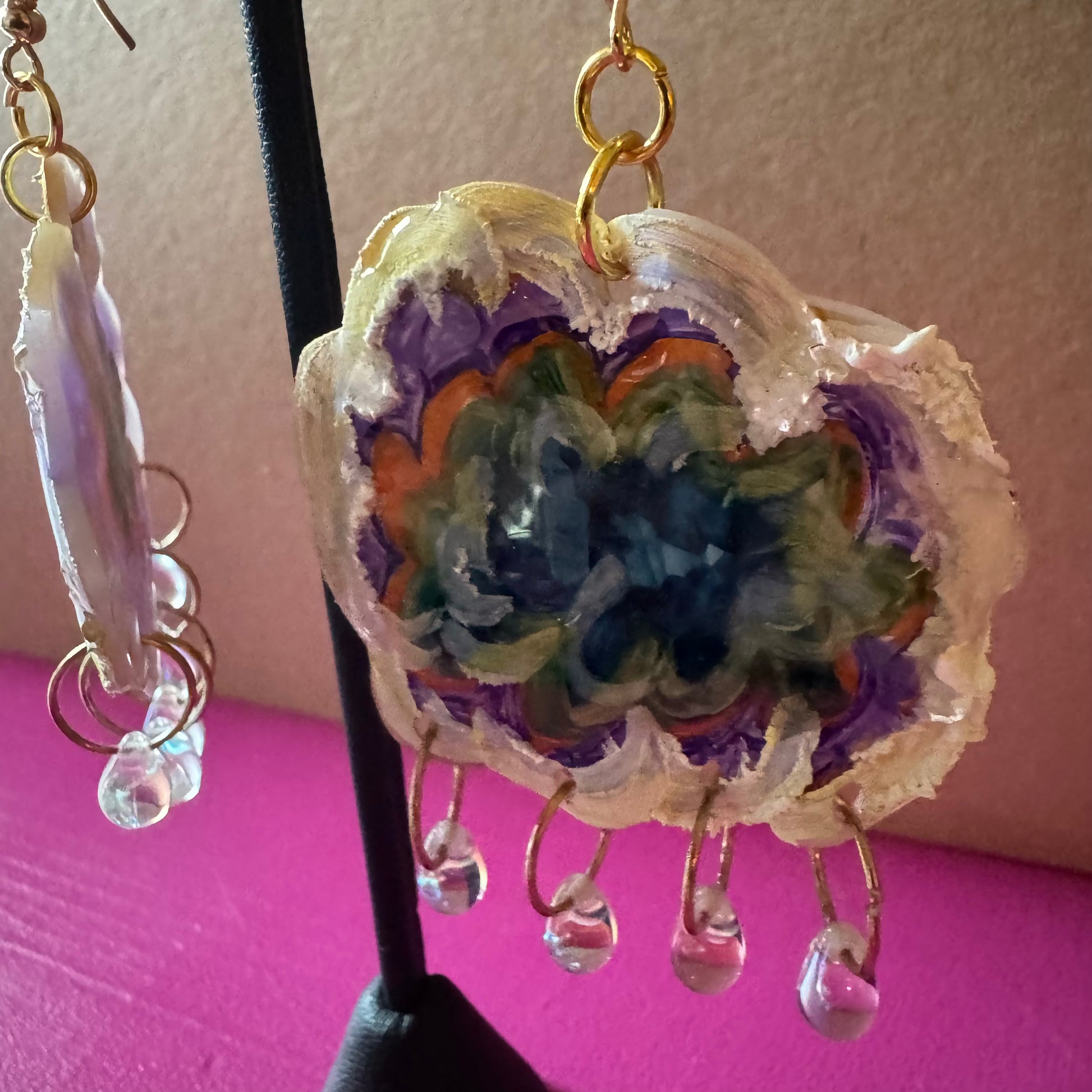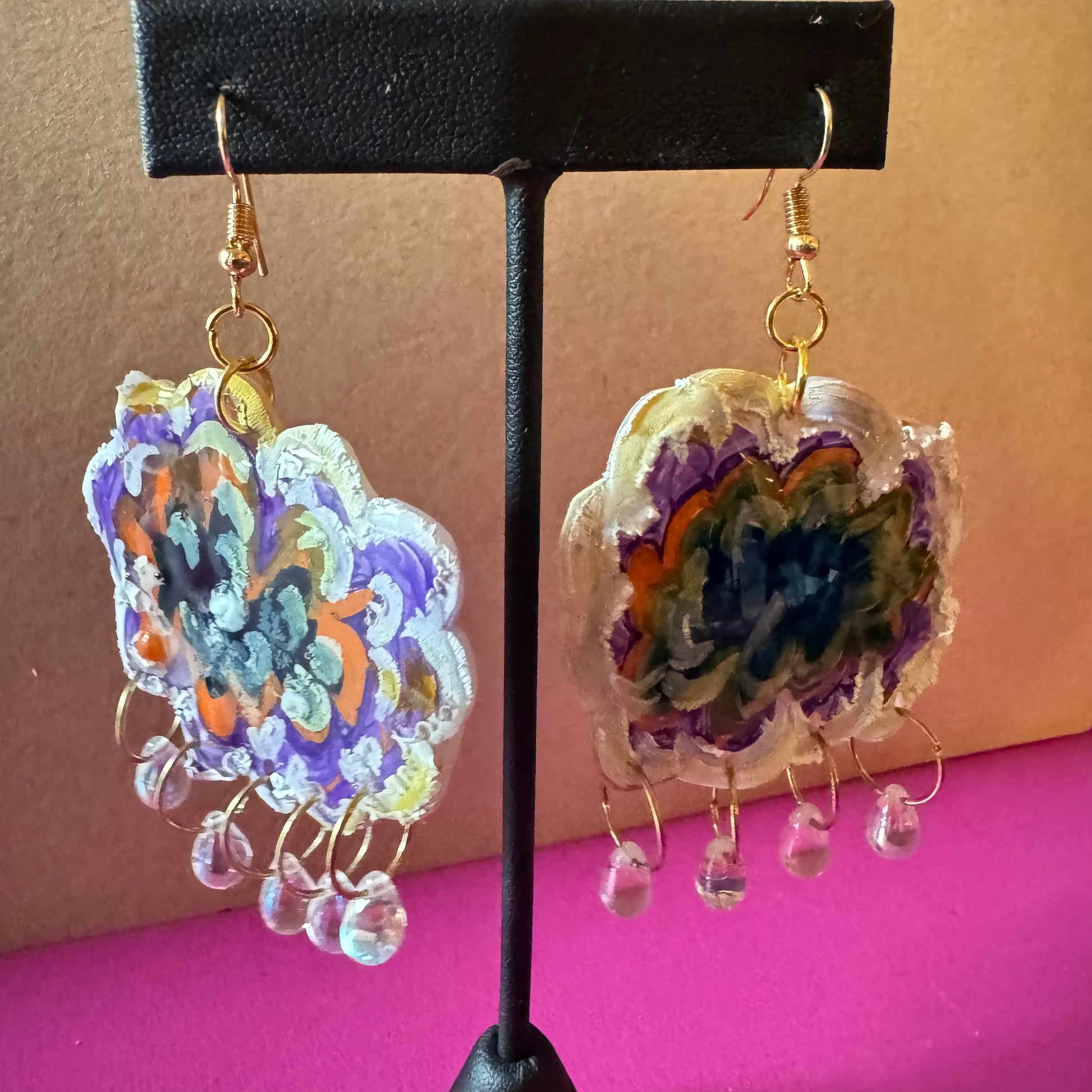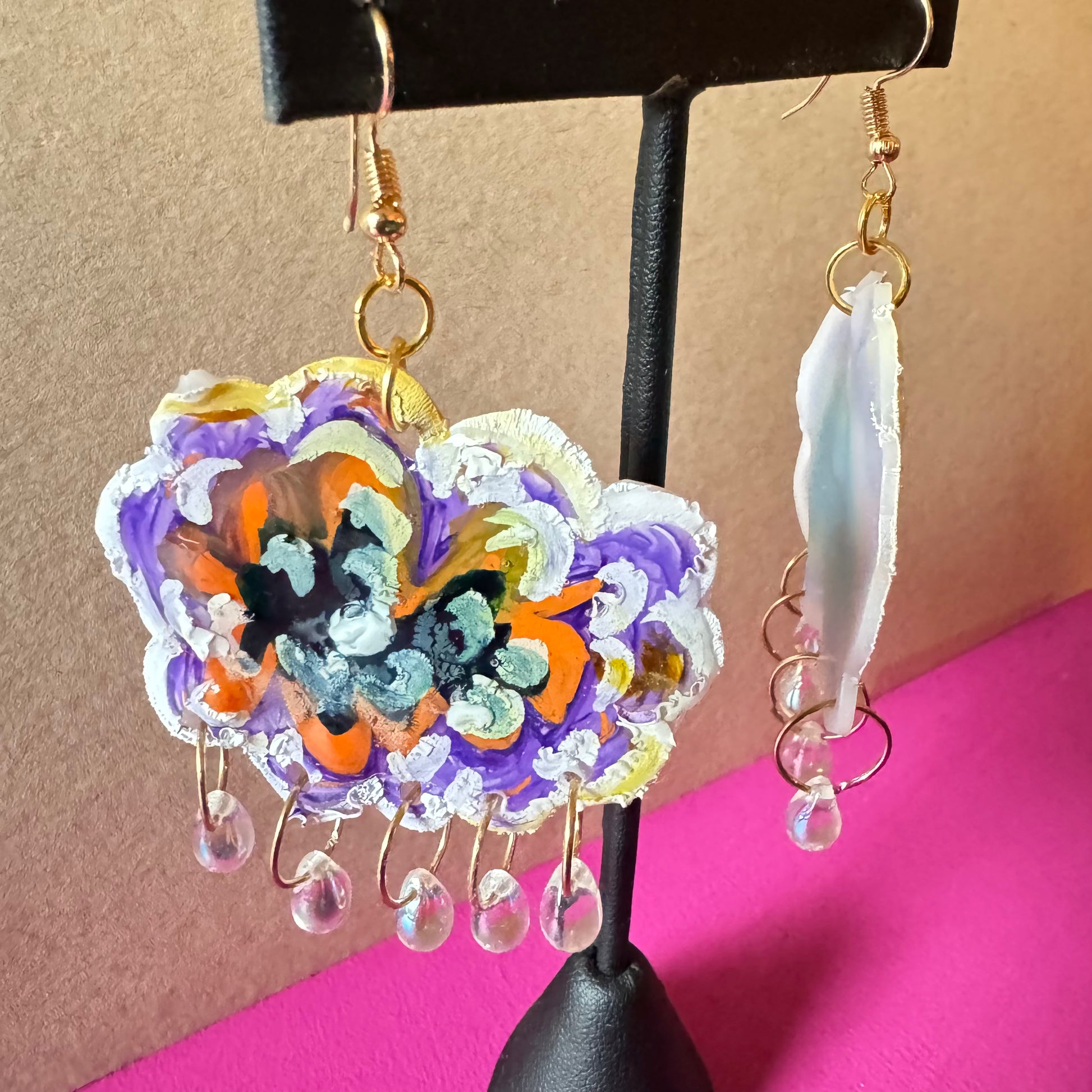 These earrings feature hand-painted clouds on shrinkable plastic, sealed with acrylic and adorned with glass teardrop beads. Lightweight and full of feeling, they celebrate all kinds of weather—internal and otherwise.