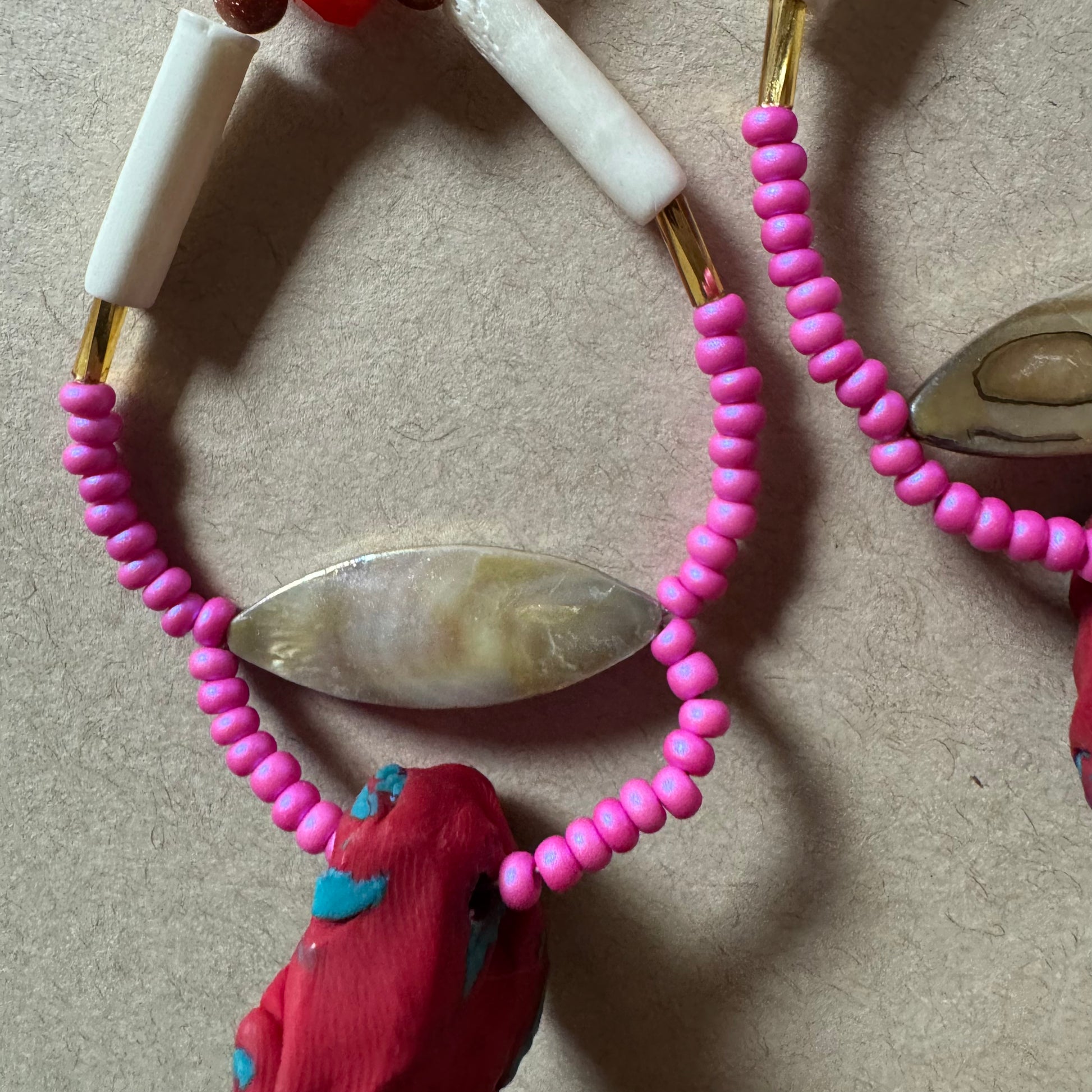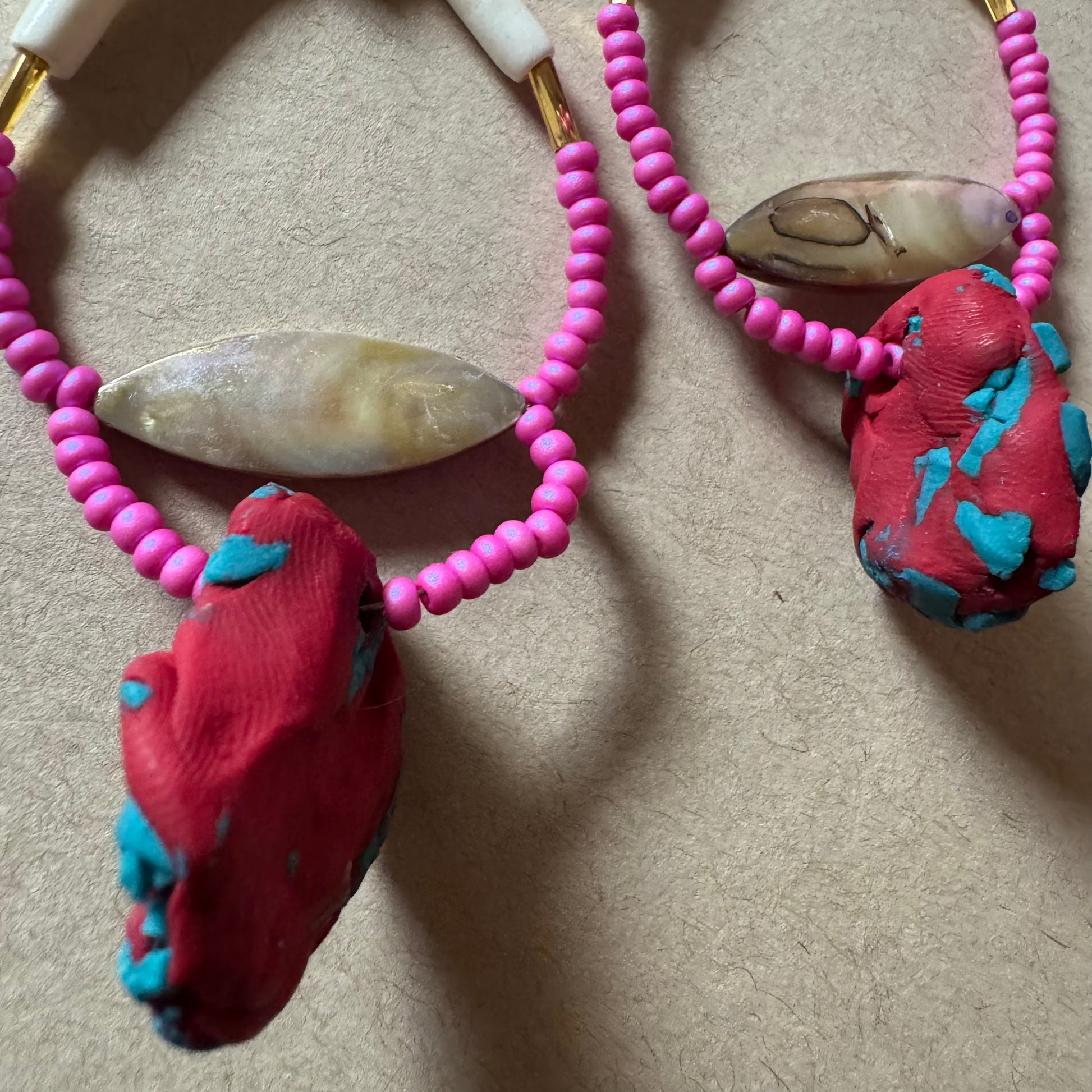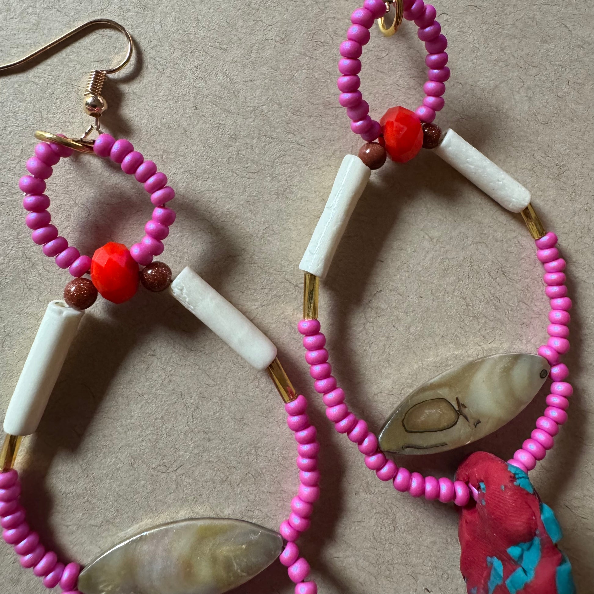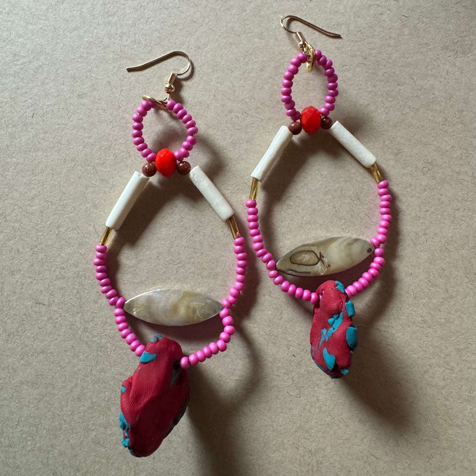 The shape recalls ritual hoops, the red clay centerpiece like a flame or petal hardened mid-dance. A little fierce, a little festive—these are earrings made for presence.