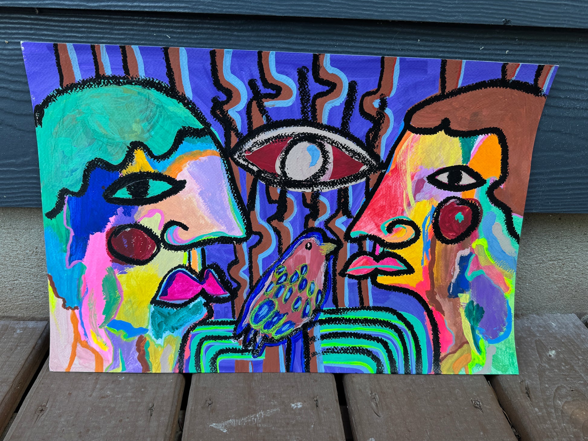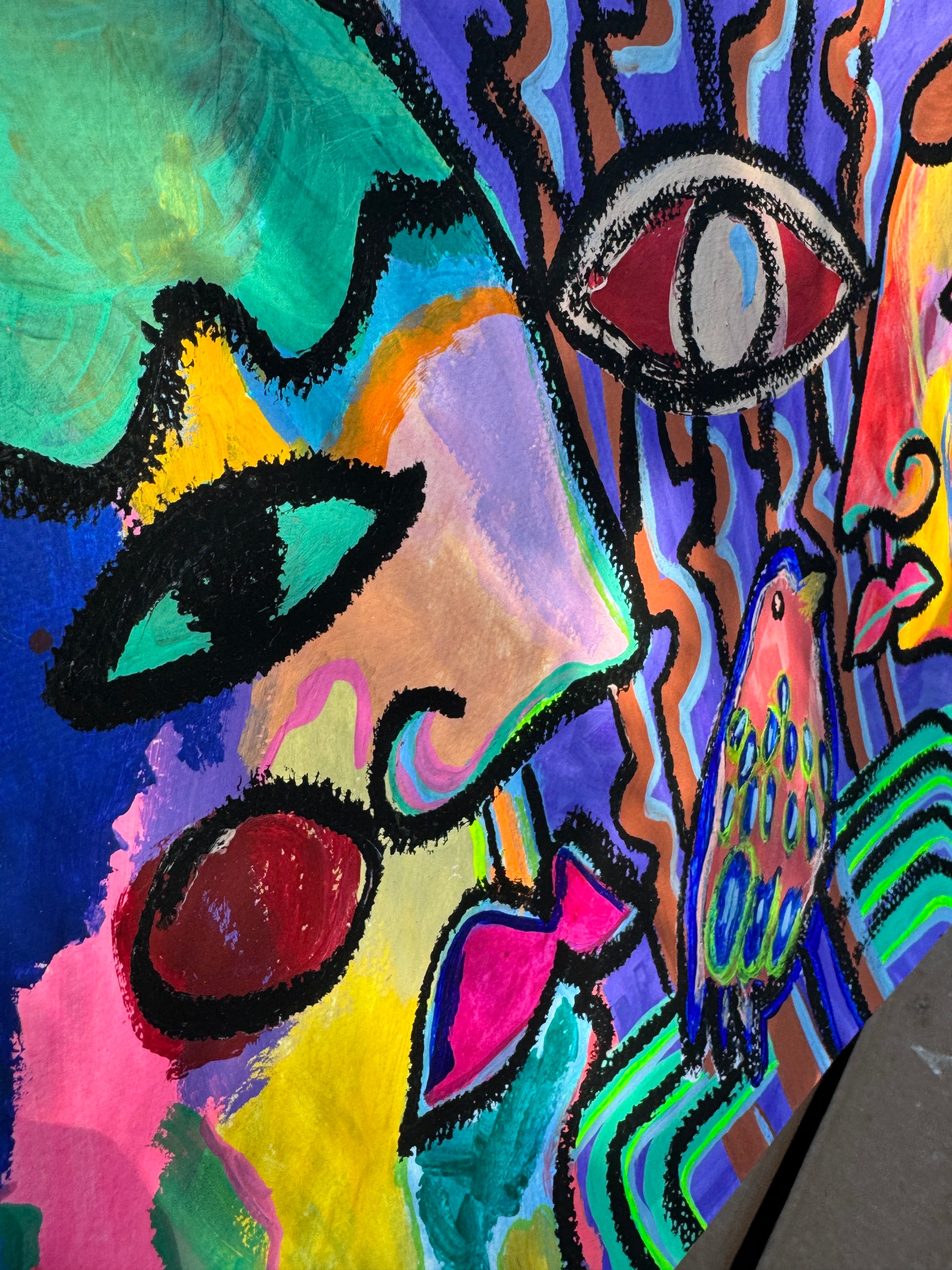 Bold acrylic, oil crayon, neon chaos, and thick black outlines. Painted on watercolor paper.