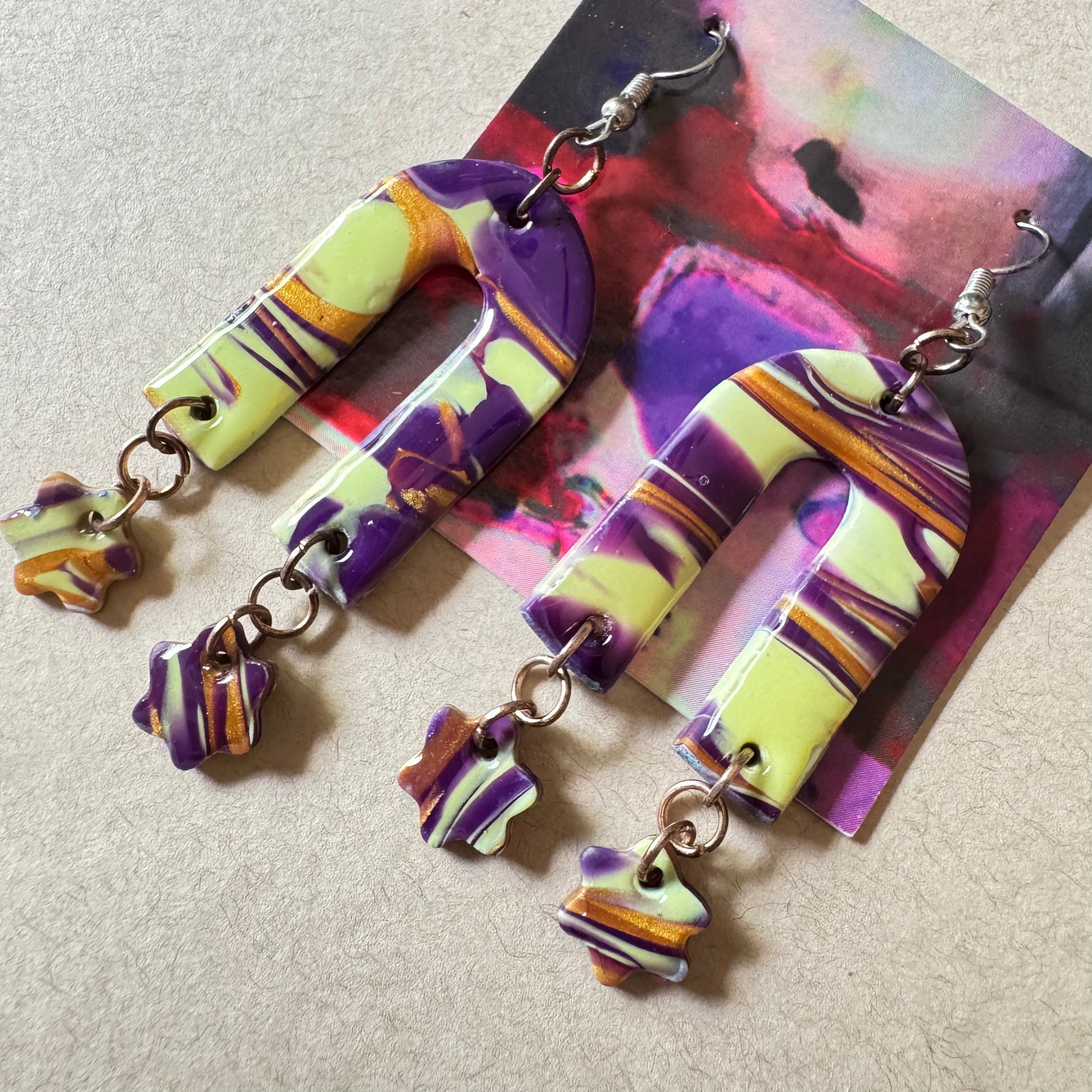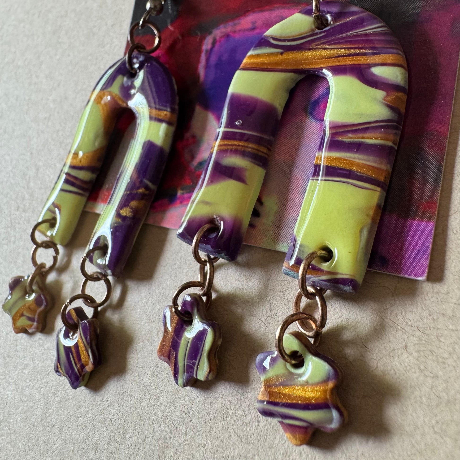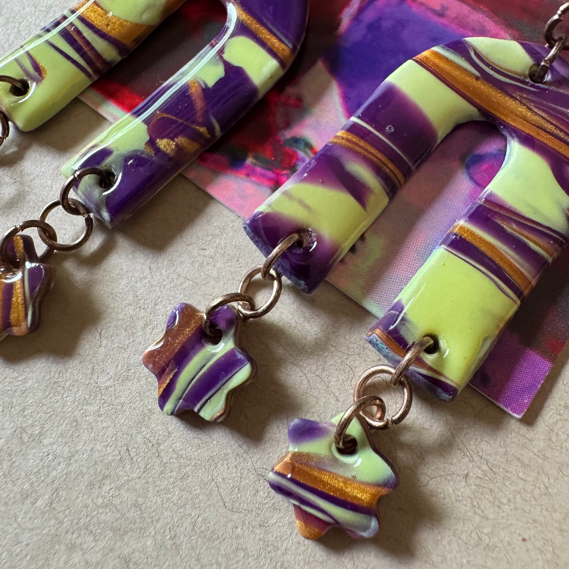 đź§ż Material: Hand-marbled polymer clay in neon lime, deep violet, amber, and cream with sculpted flower-shaped dangles