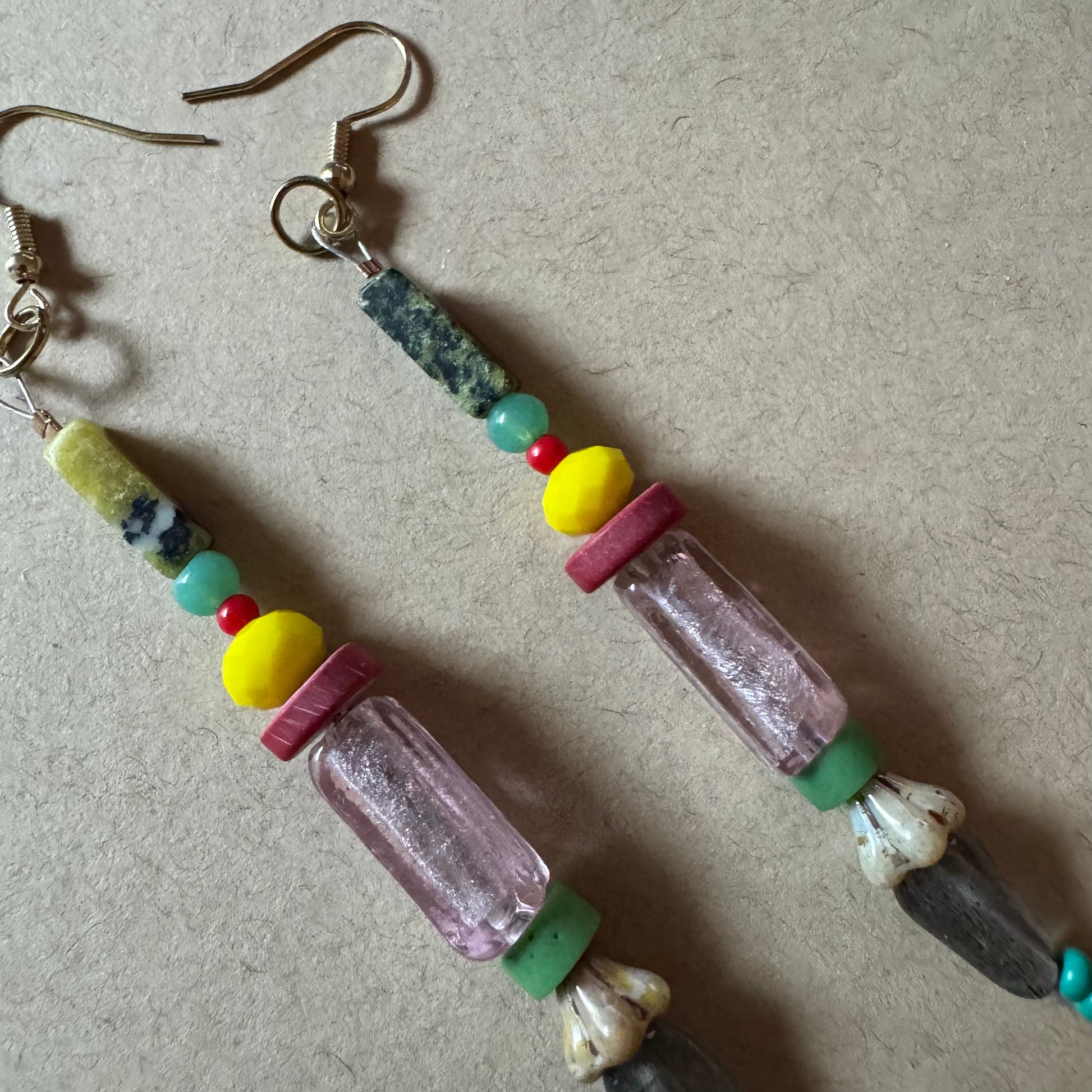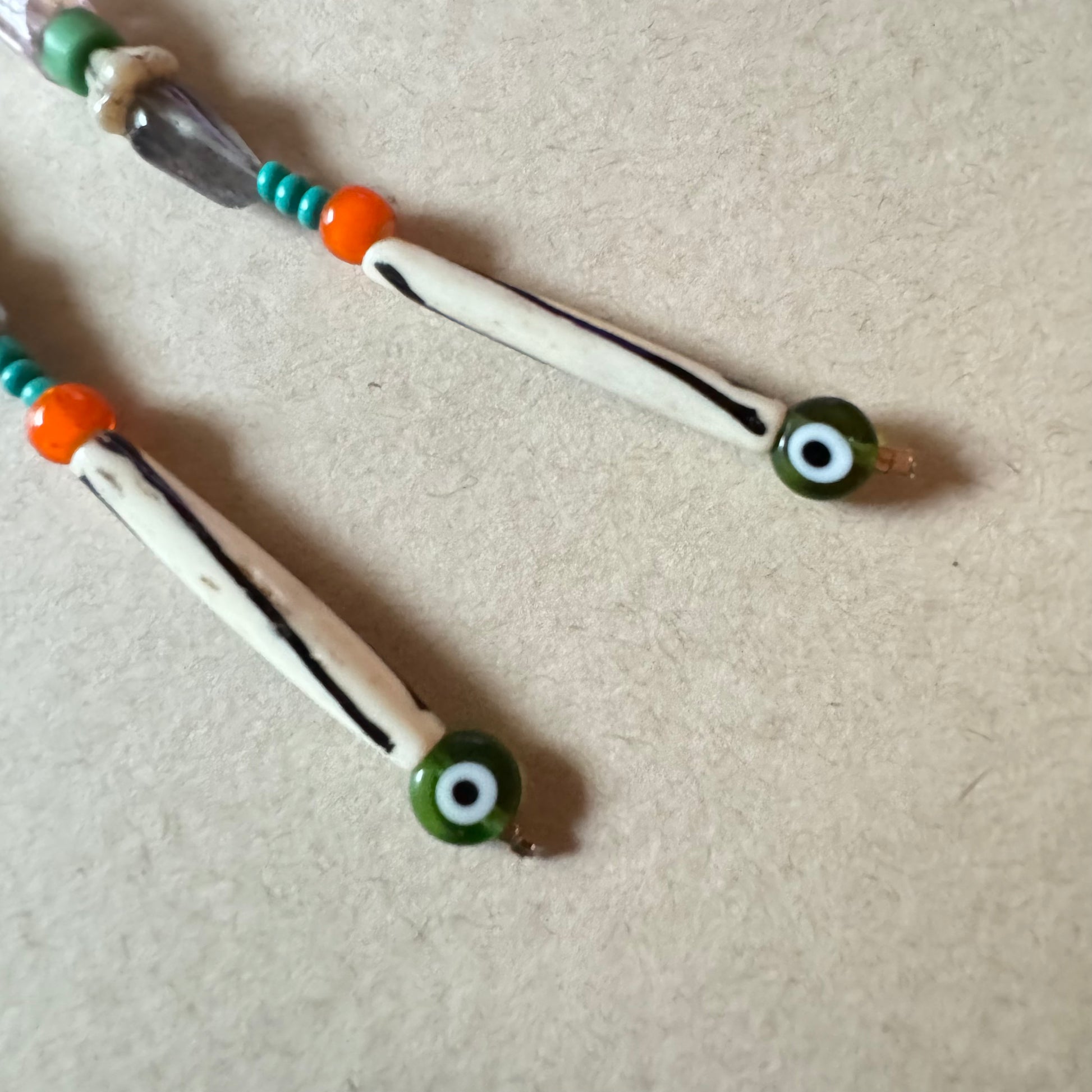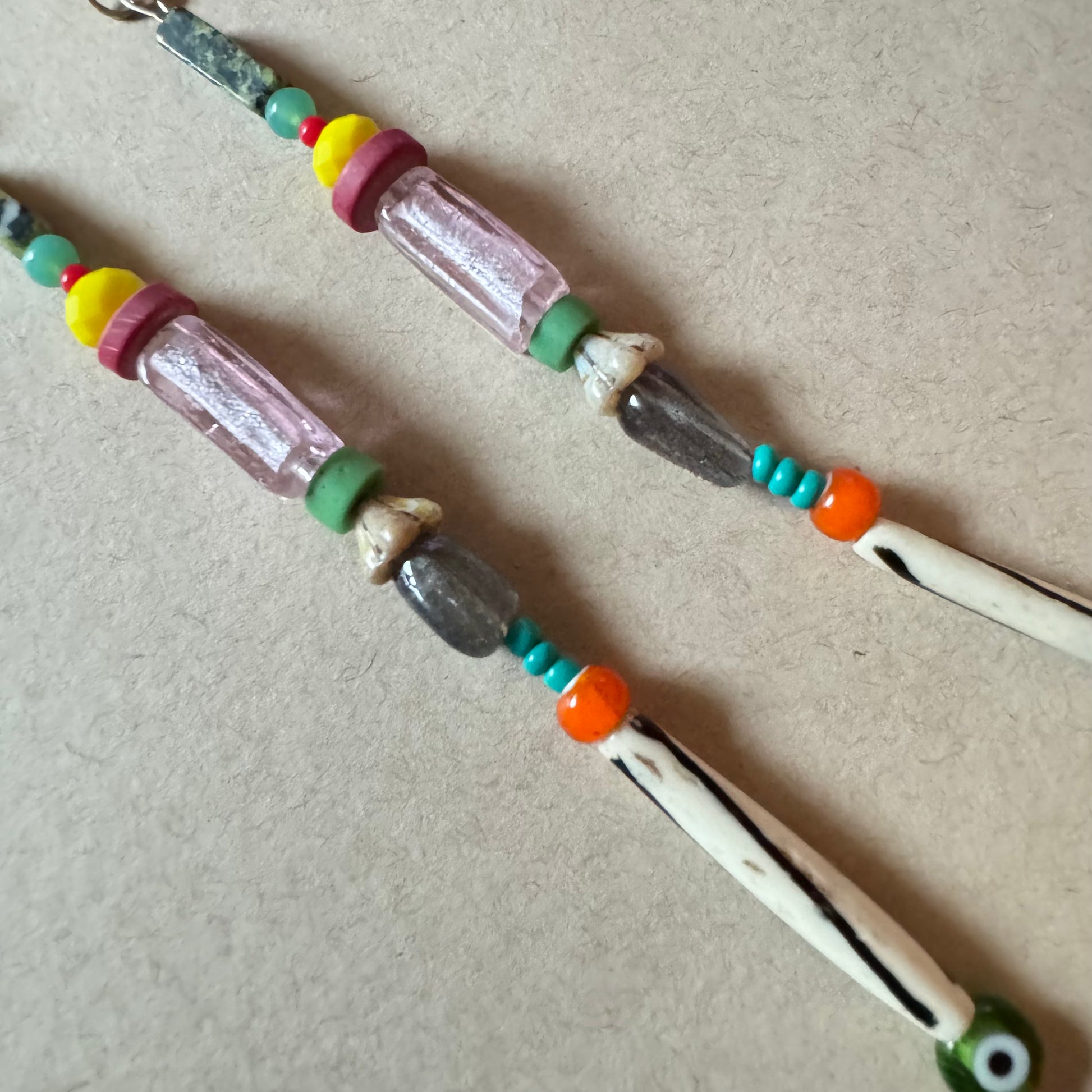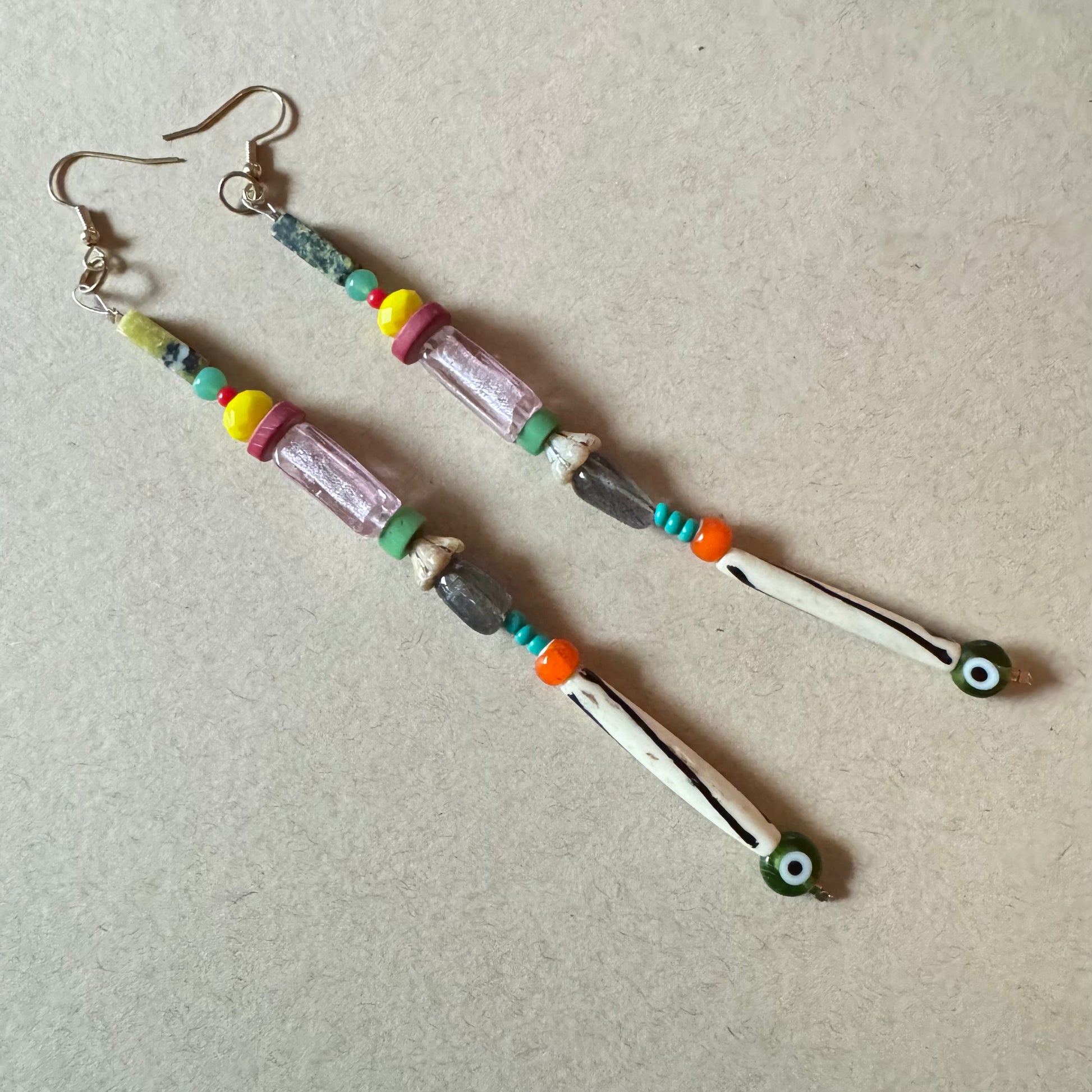 These slender statement earrings are strung with labradorite, vintage glass beads, natural bone, and a protective eye charm at the tip. The deep green-black stone may be zoisite or green serpentine, grounding the piece with a soft strength. Light yet full of presence, these earrings feel like modern relics—meant to guard, spark, and adorn.