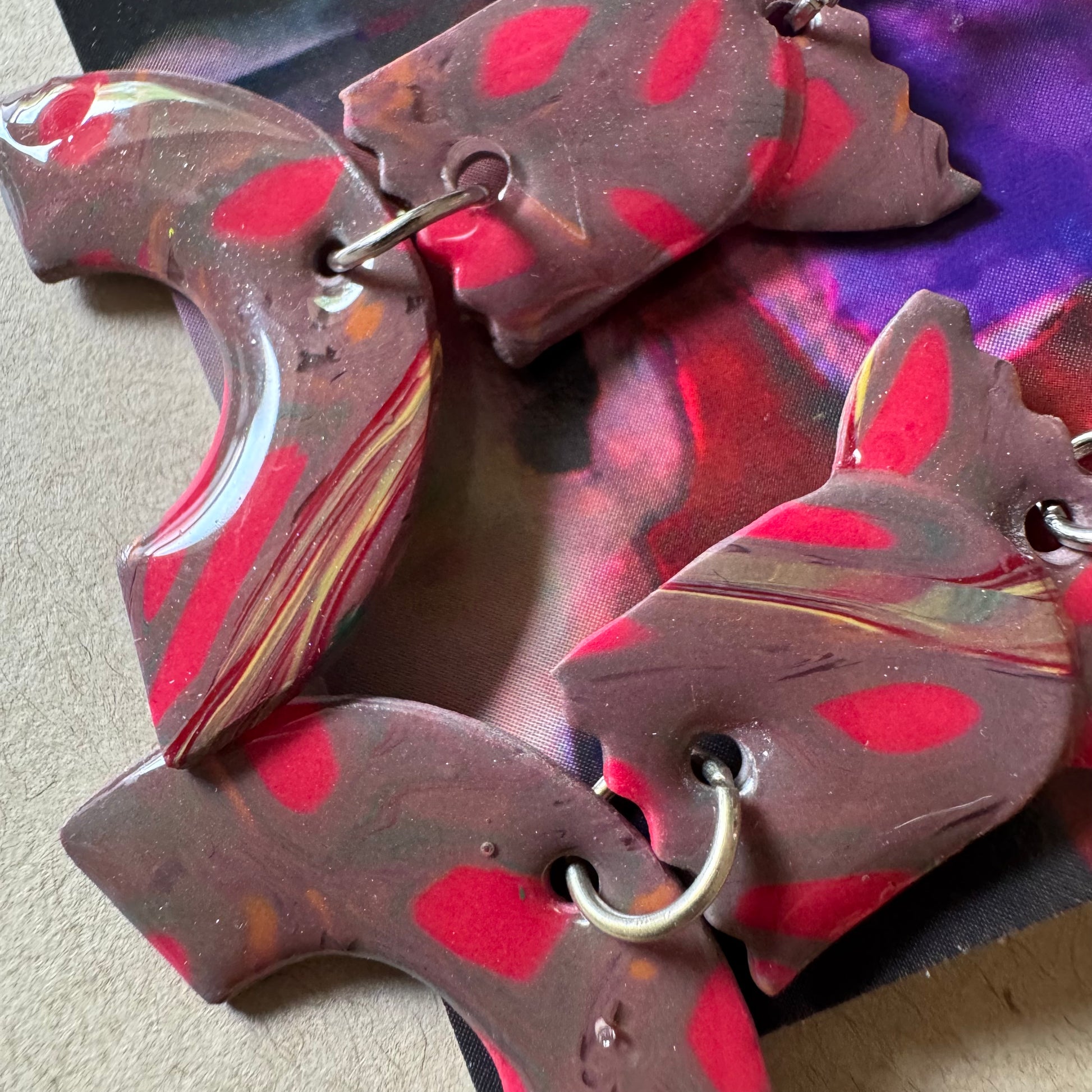🧿 Material: Hand-marbled polymer clay in reddish brown, hot pink, and cream streaks