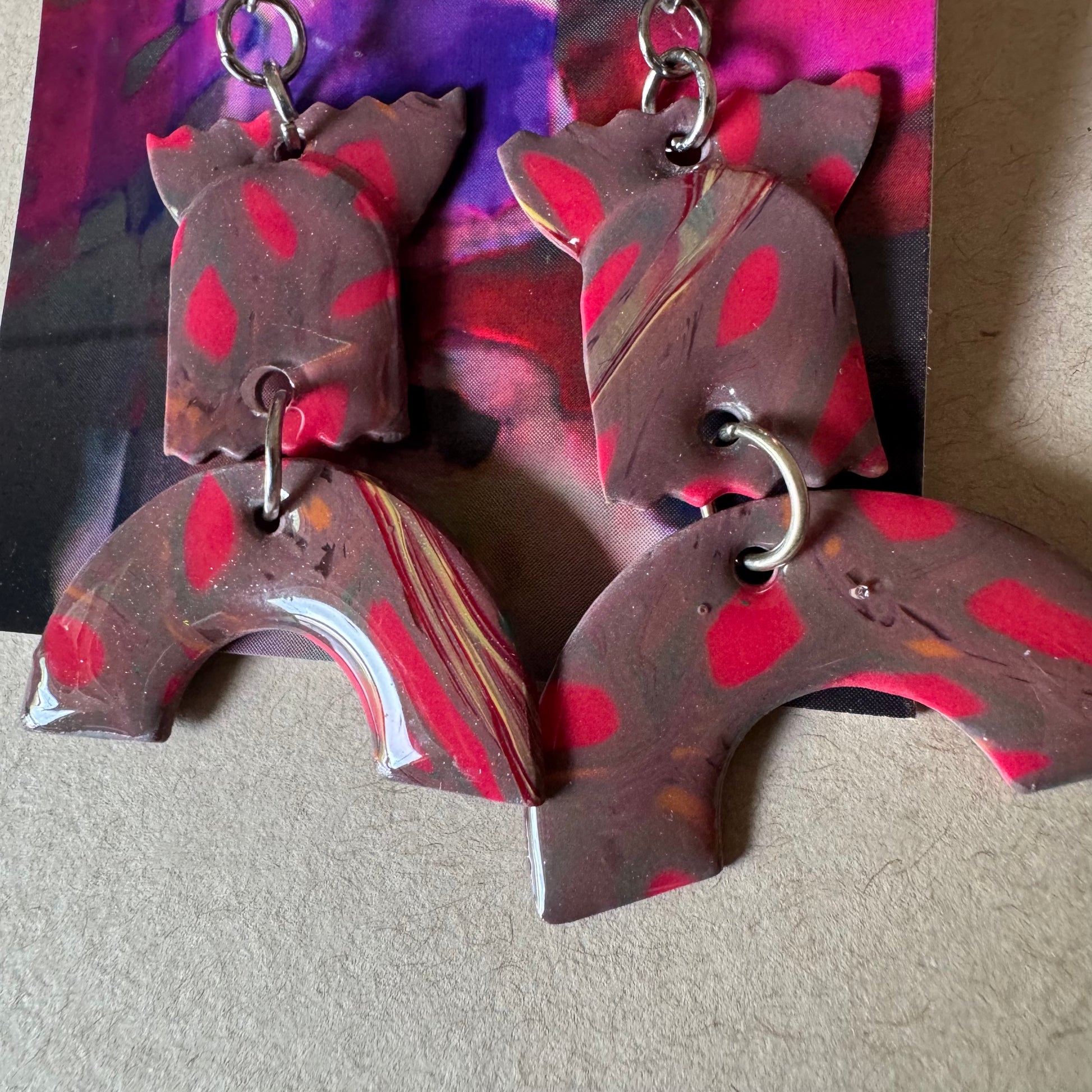 Hoja Errante camina con fuerza y raíz. Esculpidos en curvas botánicas abstractas, estos aretes de 2.5 pulgadas combinan marrón rojizo con manchas fucsias y vetas crema—como pétalos encendidos o hojas perdidas en el crepúsculo. Una pieza para portar como un susurro con filo.
