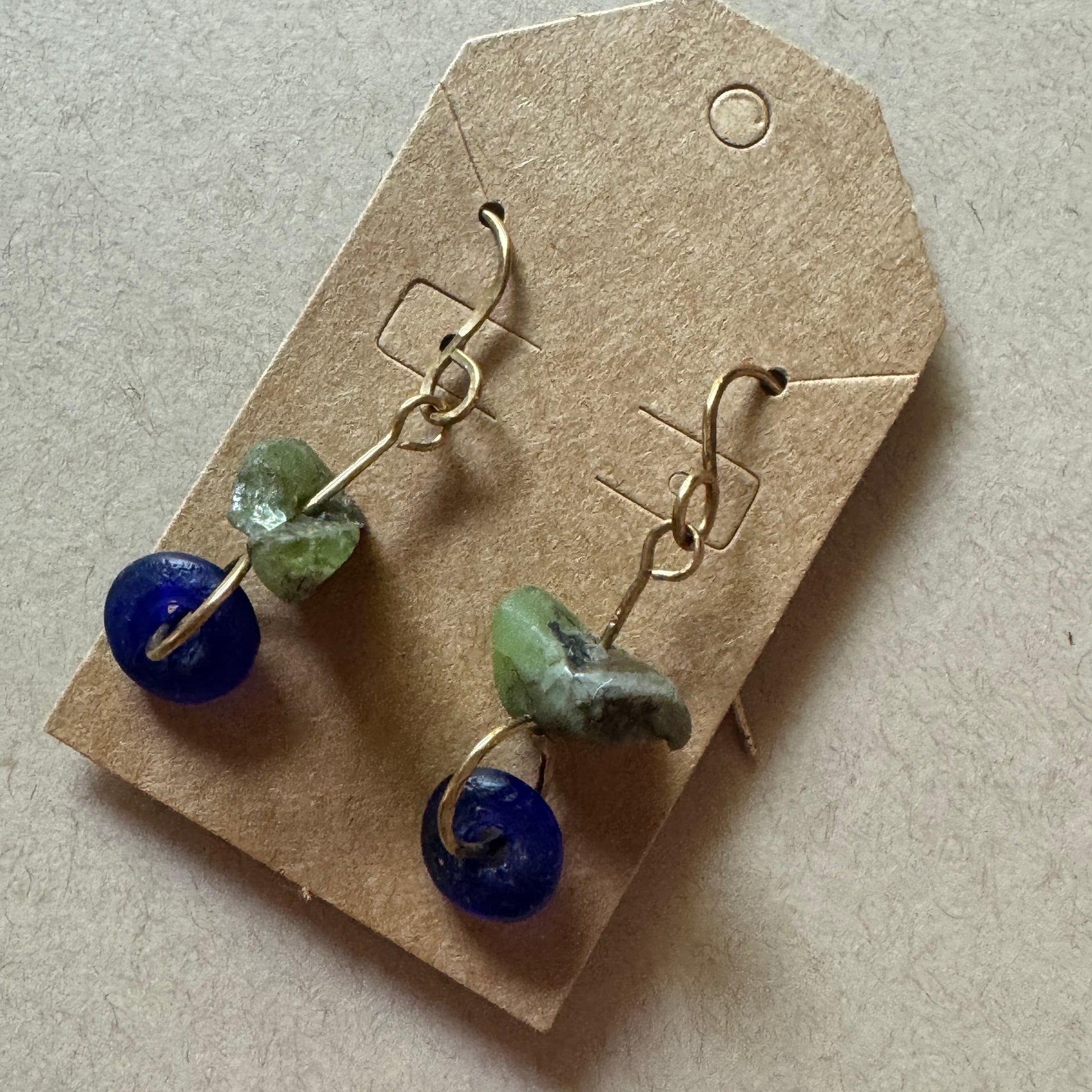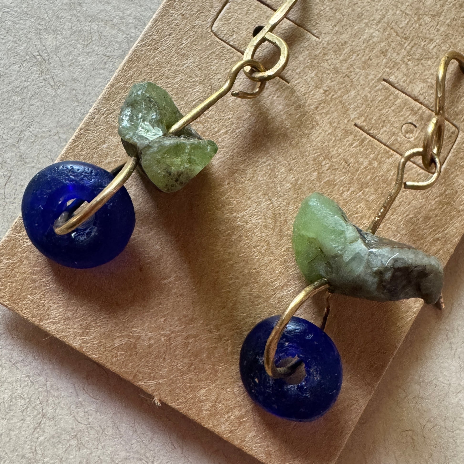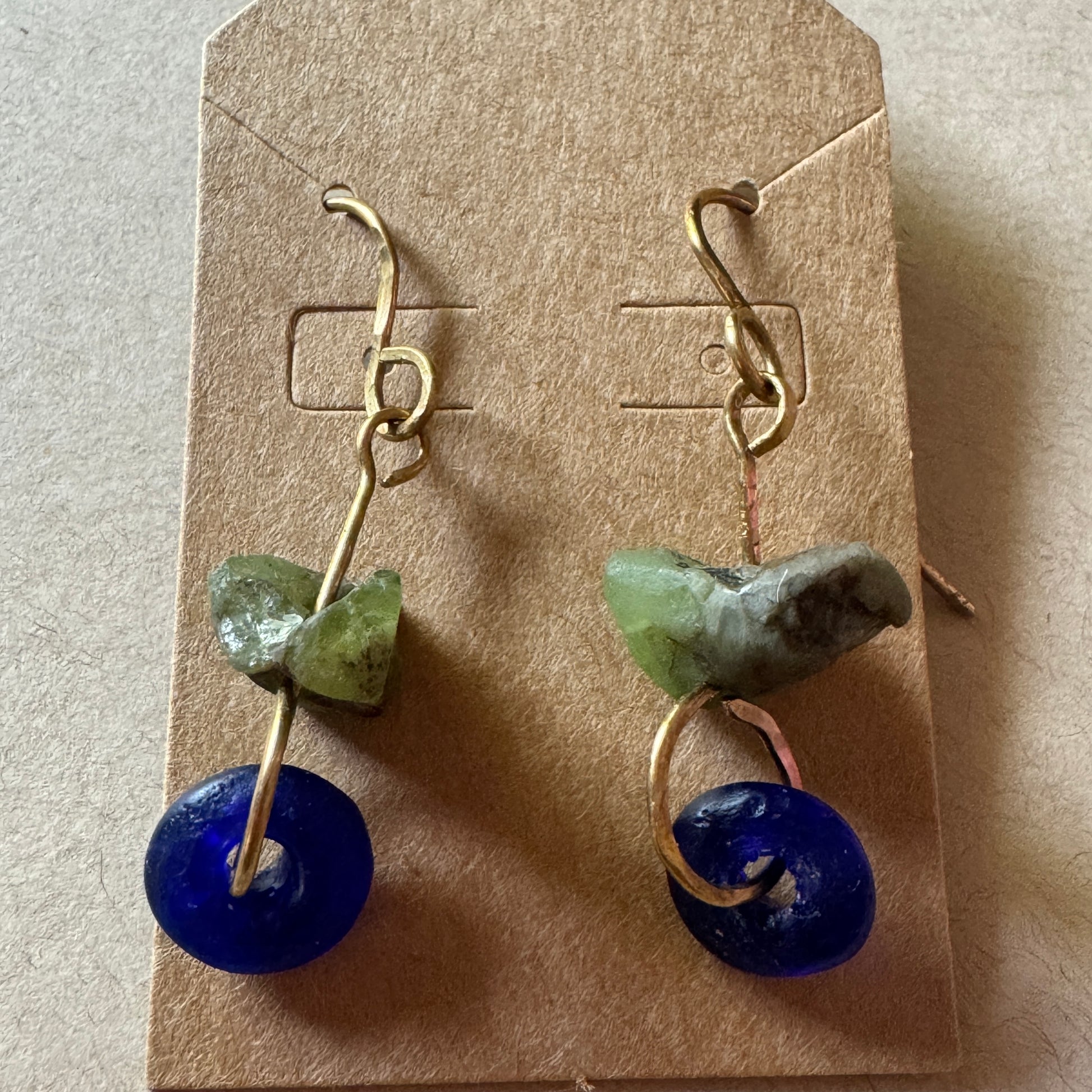 Sculptural and elemental, these one-of-a-kind earrings feature raw green serpentine stones paired with hand-cut indigo glass rings, suspended on hand-formed brass wire. The asymmetry and spiral tension give them a kinetic, ritual feel — like ancient talismans tuned for movement.