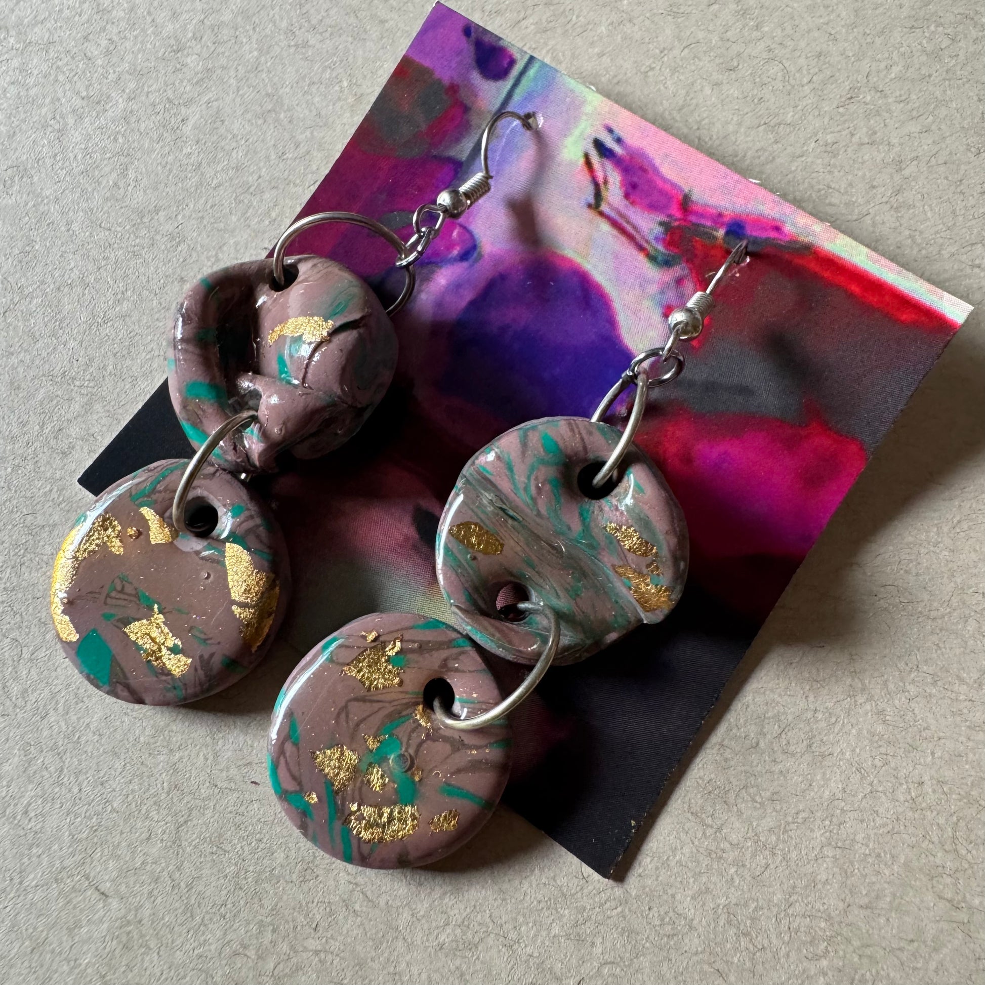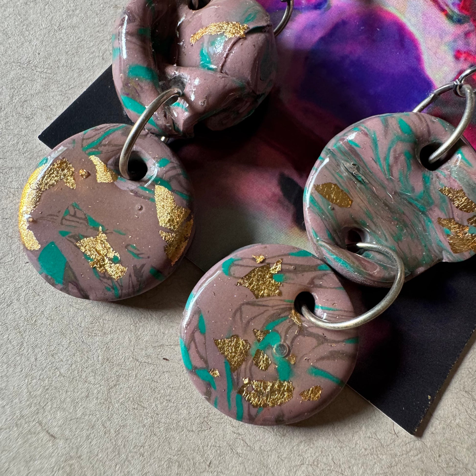 Sombra Dorada carries quiet opulence. These 3.5-inch earrings blend soft lavender clay with teal marbling and floating flakes of gold—like light catching on still water. Subtle yet rich, they bring a grounded elegance to any moment, day or night.