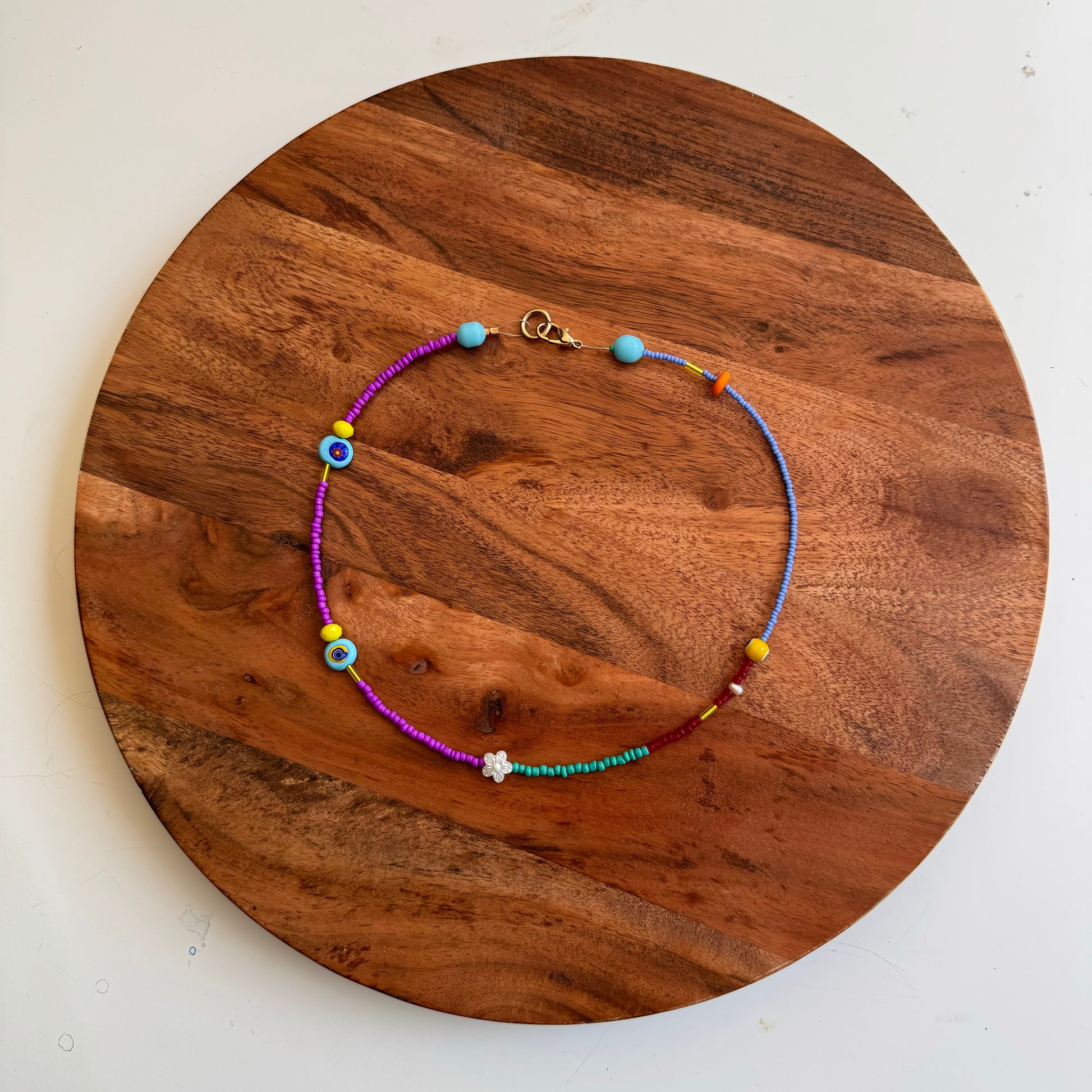 This delicate 20-inch necklace features a charming light blue venetian glass flower bead, complemented by vibrant purple and yellow accents. Weighing 0.5 oz, it’s lightweight and perfect for adding a subtle yet playful touch to any outfit. Handcrafted for those who appreciate unique, colorful jewelry with a floral twist.