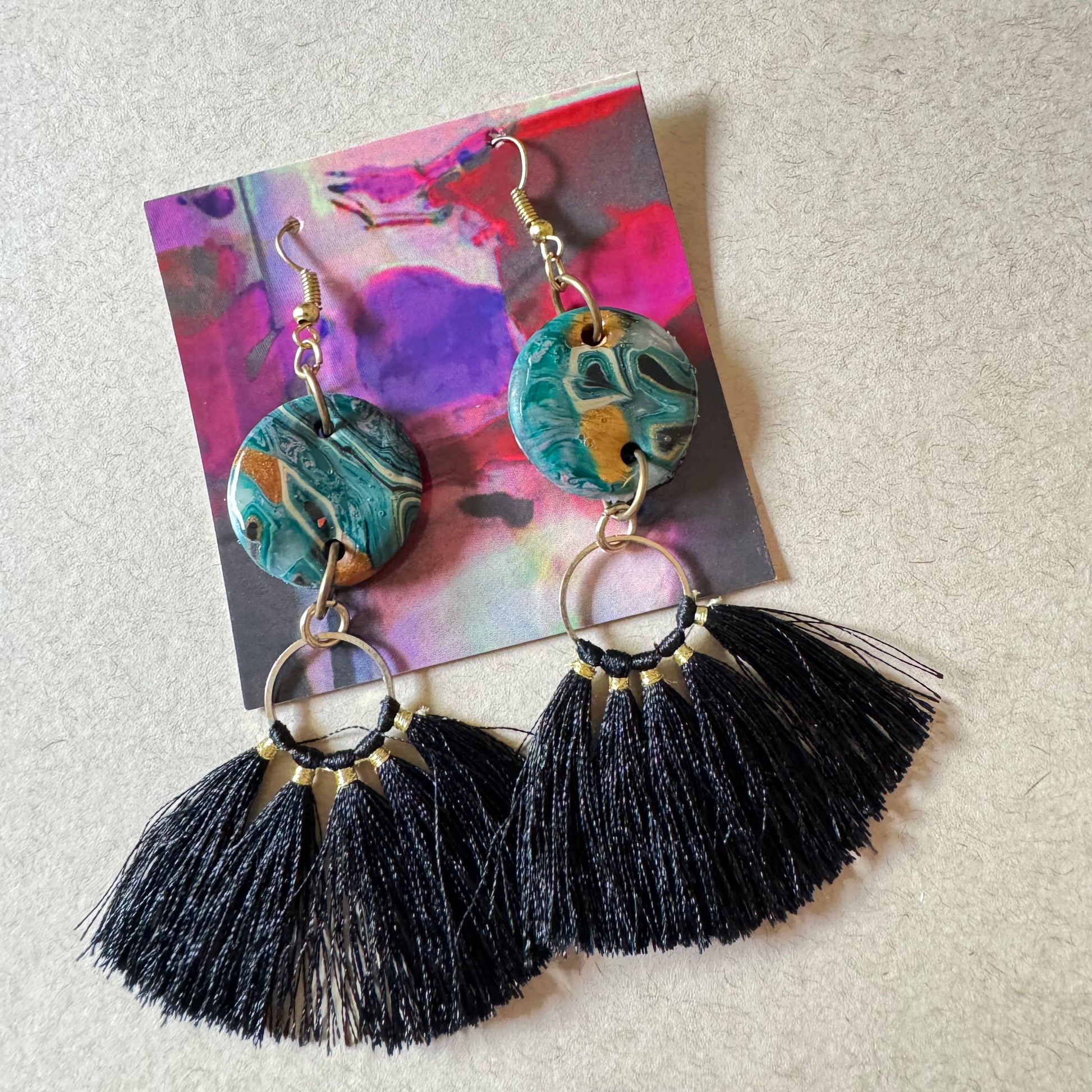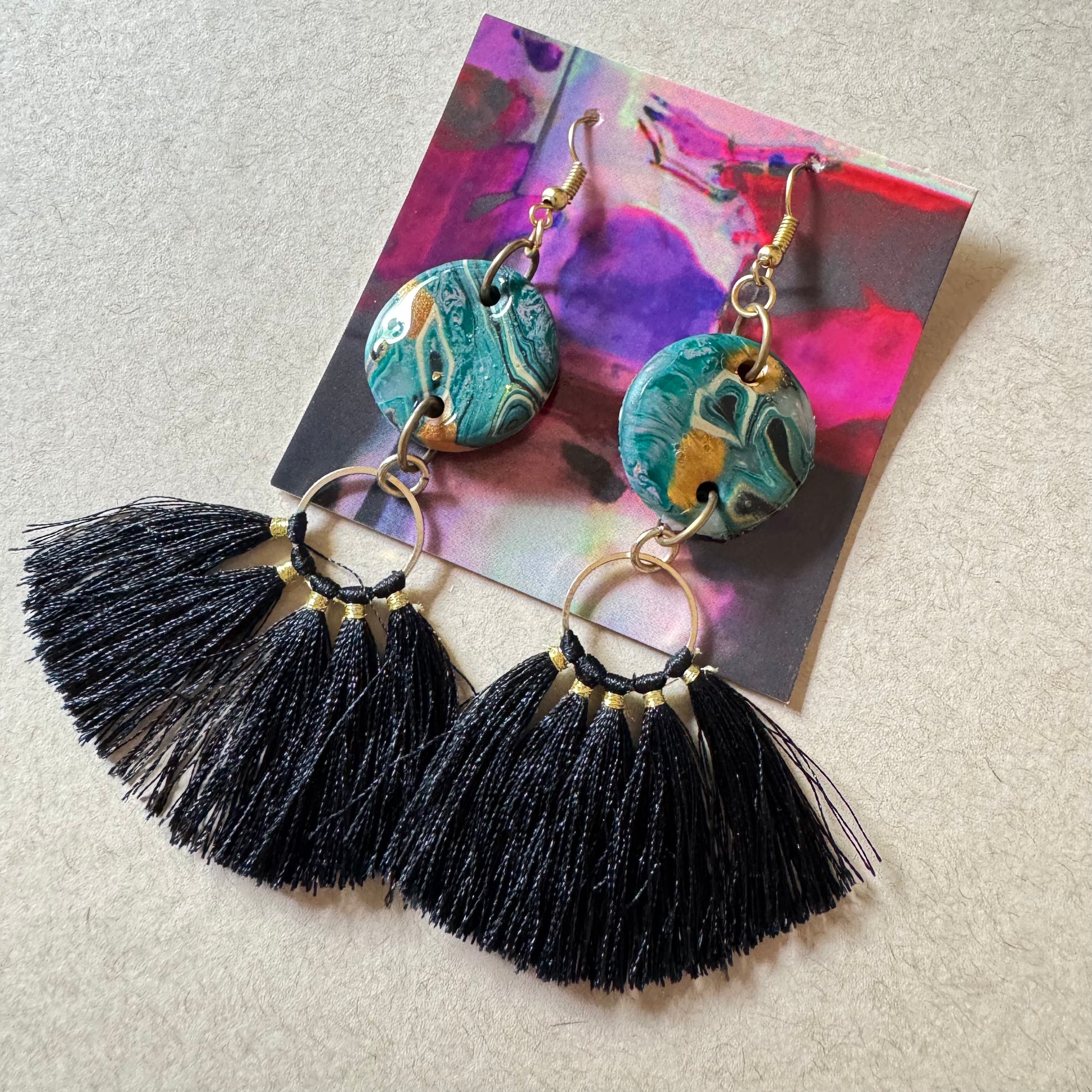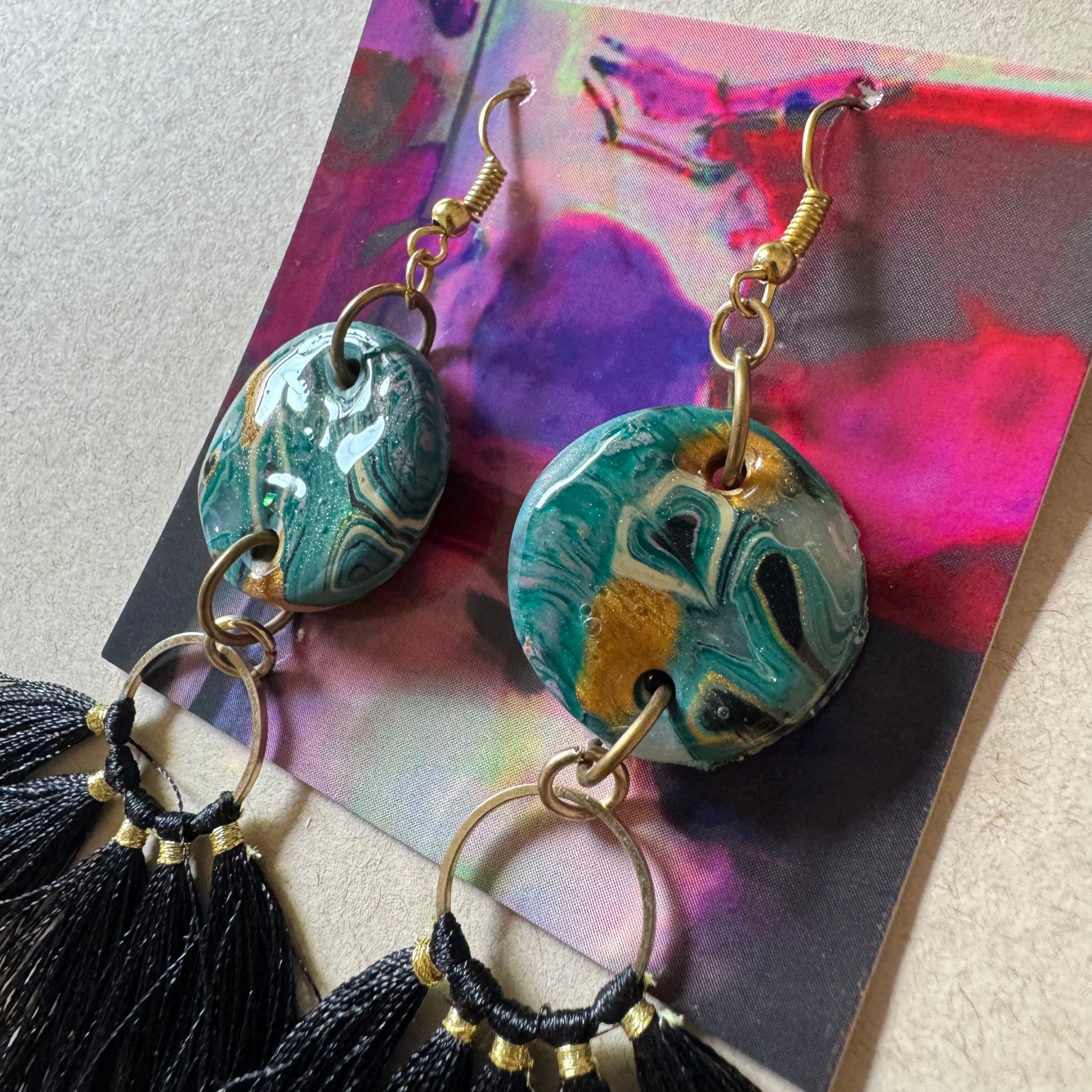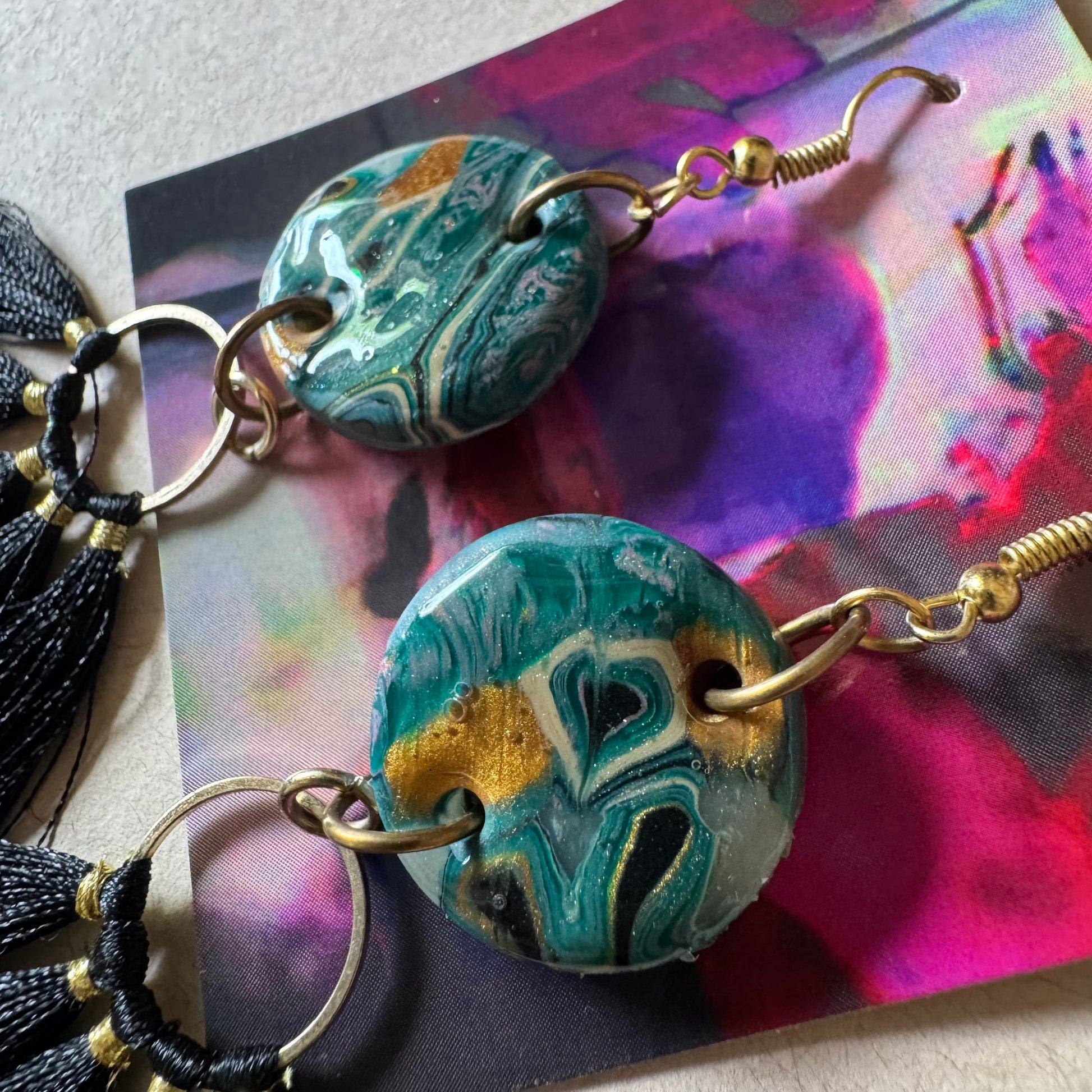 🧿 Material: Hand-marbled polymer clay in deep teal, ochre, and cream, with metallic accents and black silky fringe