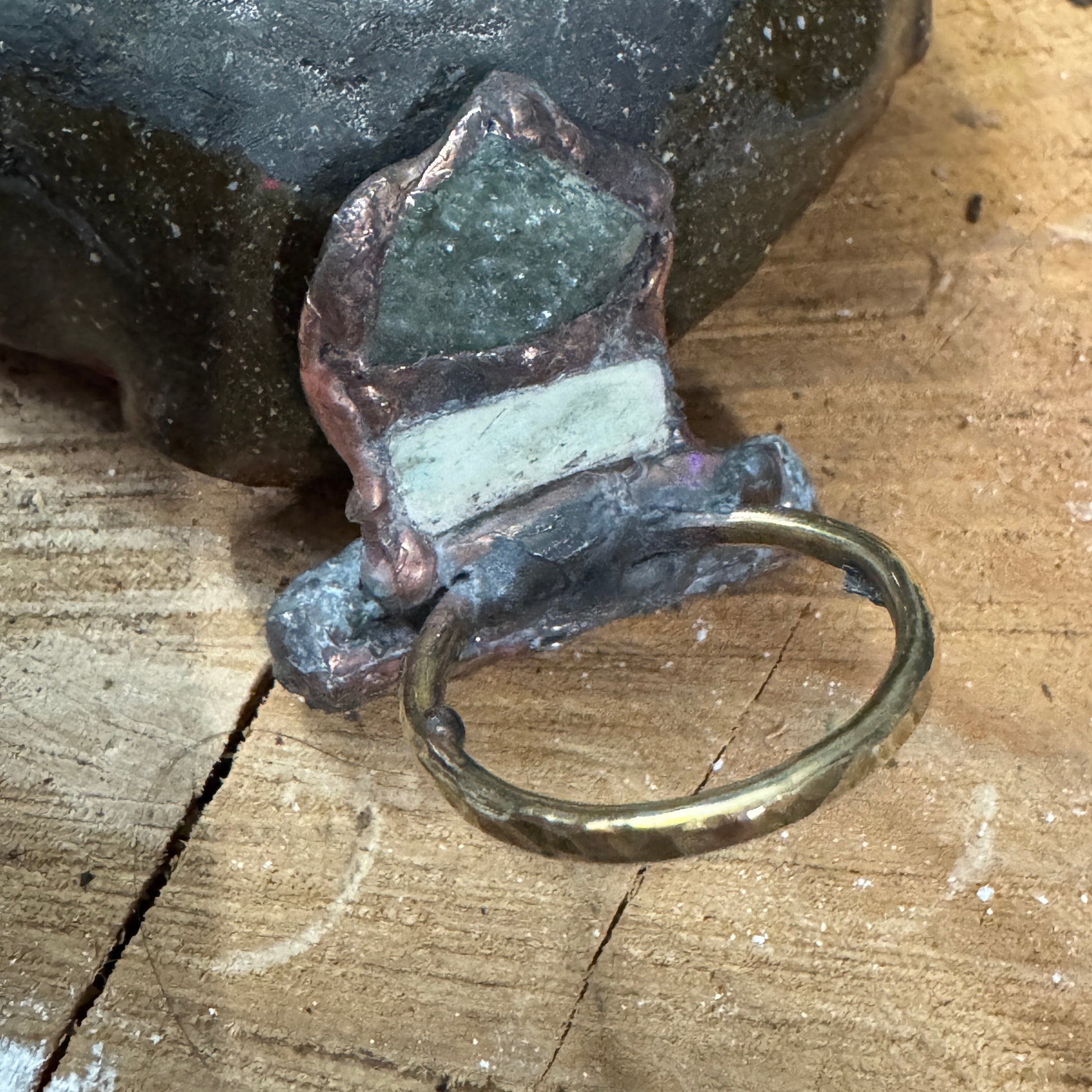 A tiny altar, a little shrine, a building block of memory. This piece feels architectural—stacked and grounded, like a house made of fragments. The top stone is green and jagged like a mountain shard, while the center is white and smooth, made out of bone, holding a quiet in-between. It’s all held in molten pewter, textured like a weathered foundation. The brass band is simple and steady, letting the front carry the structure.