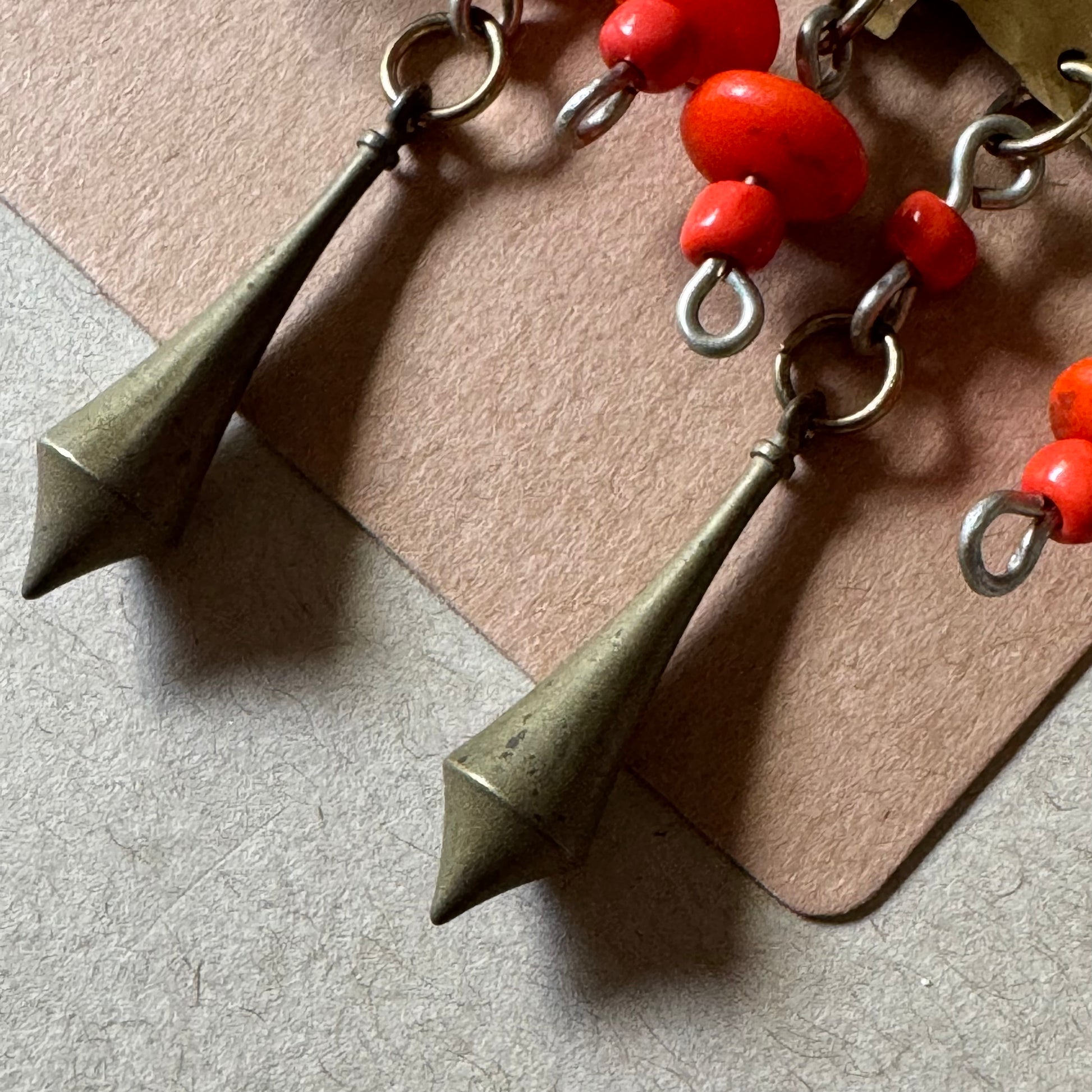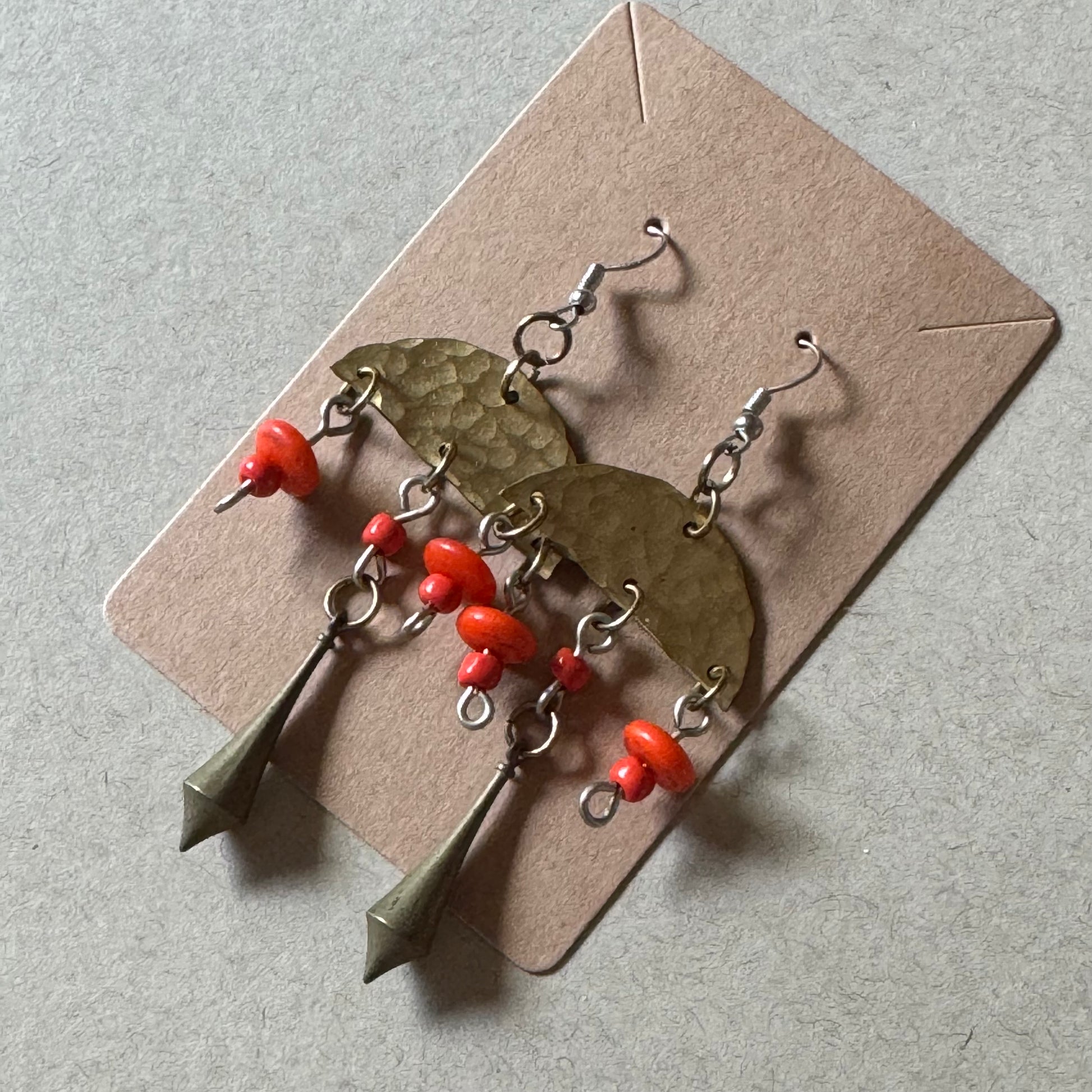 These 3.5" earrings balance earthy fire and forged metal. With hammered brass half-moons, vibrant orange beads (evoking molten coral), and weighty geometric drops, they sway like sun rituals in motion. A mix of texture, shape, and sound—bold without shouting.