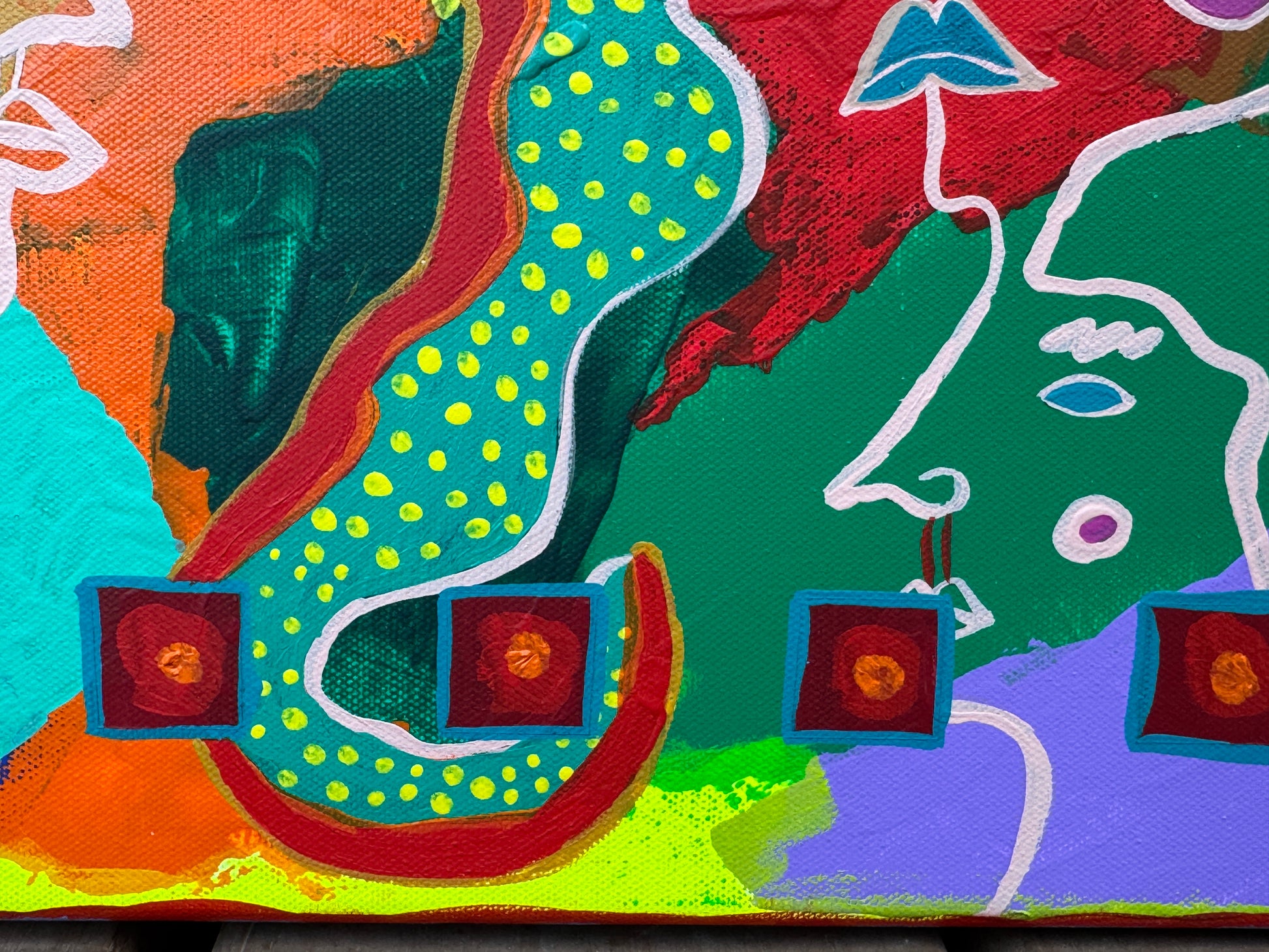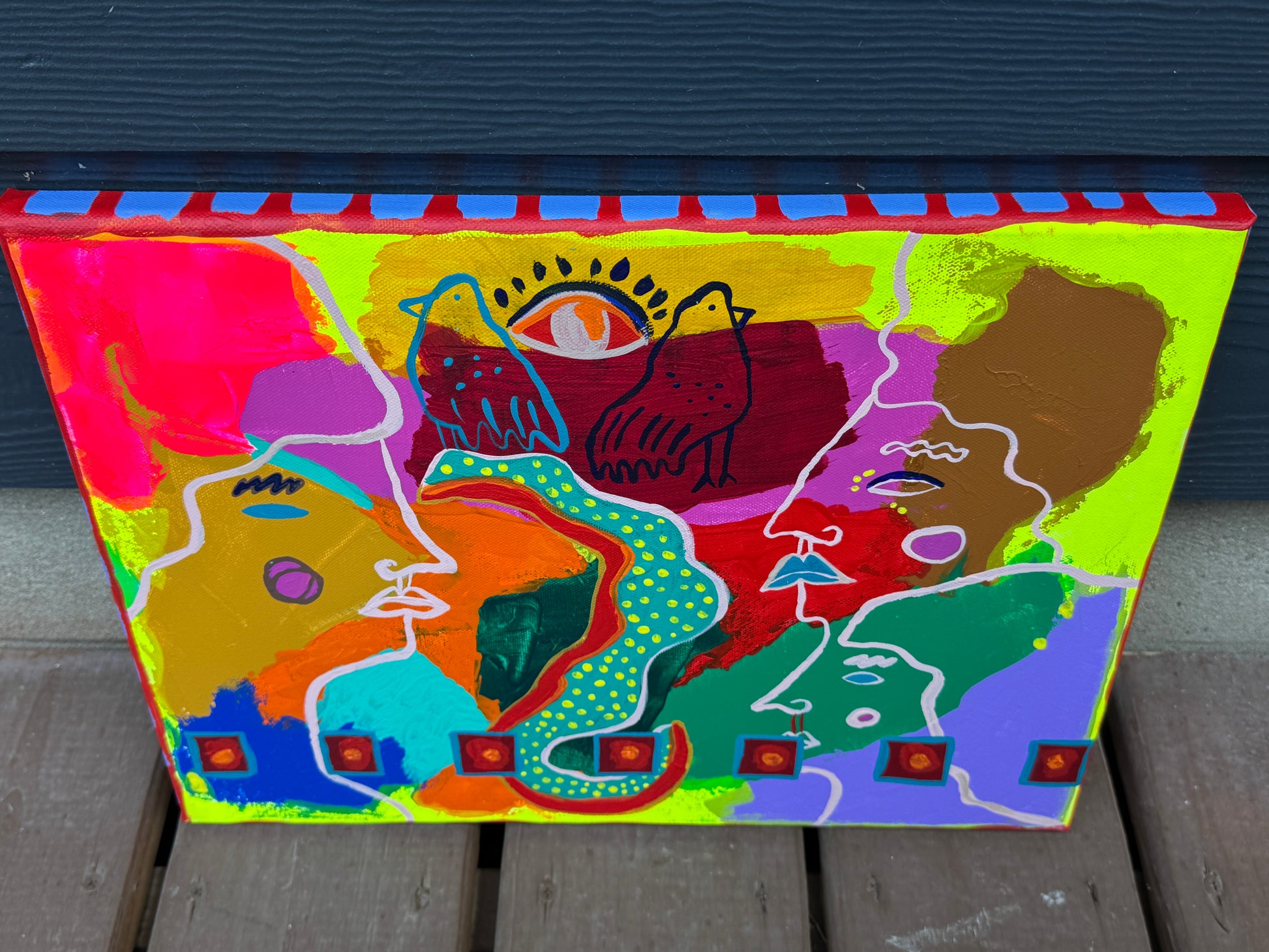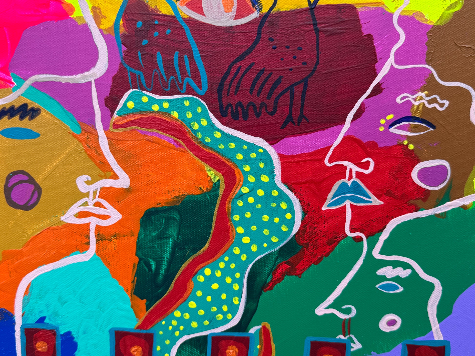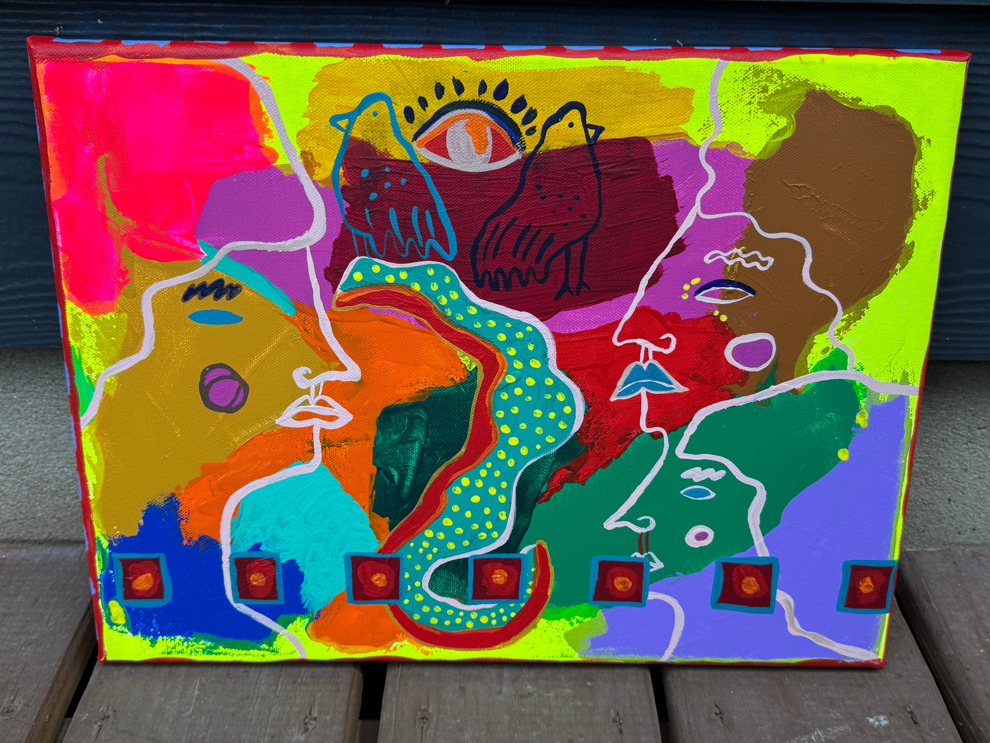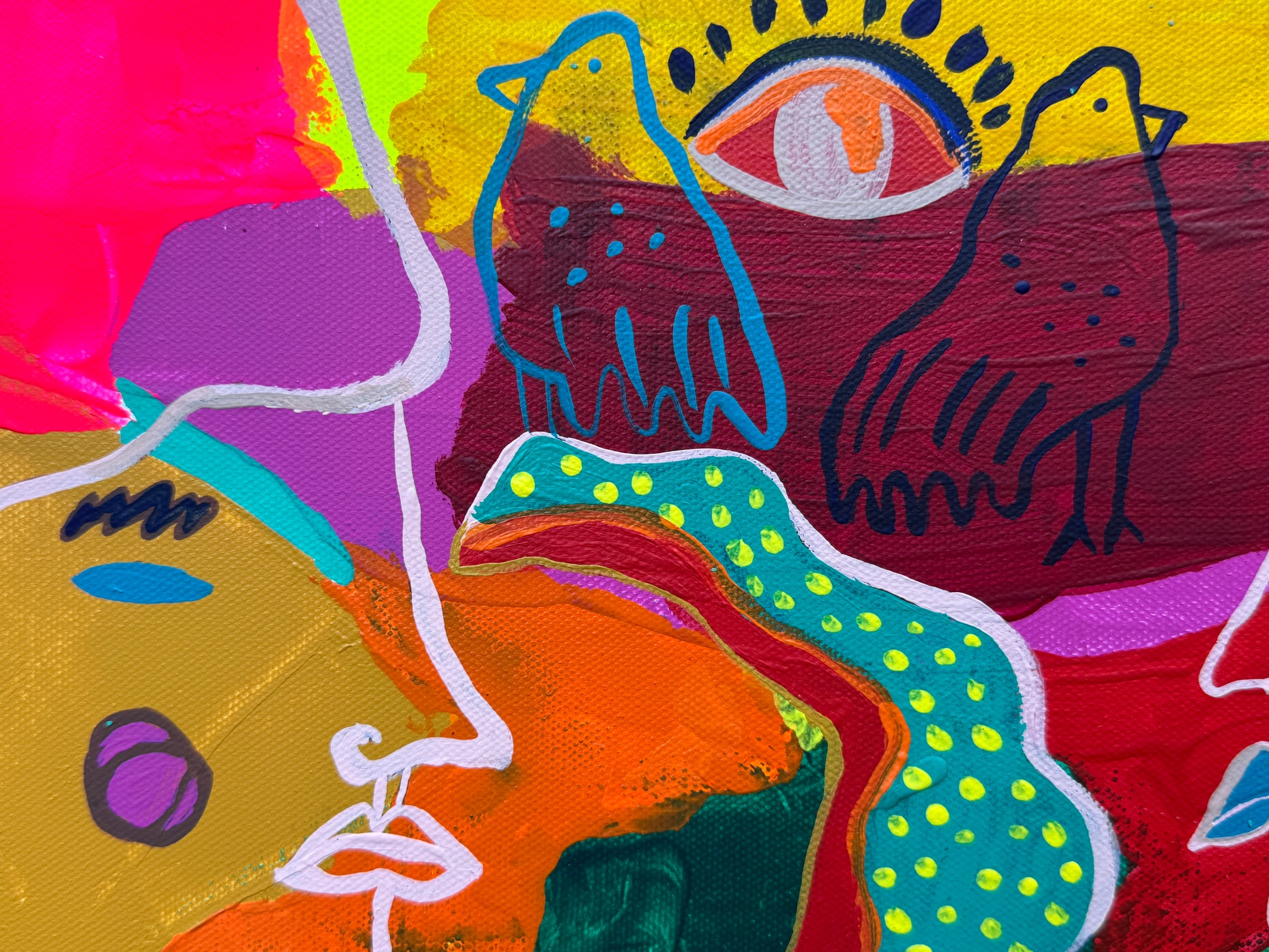Fluorescents, textures, and brushstrokes that want to stay wild. Acrylic on canvas.