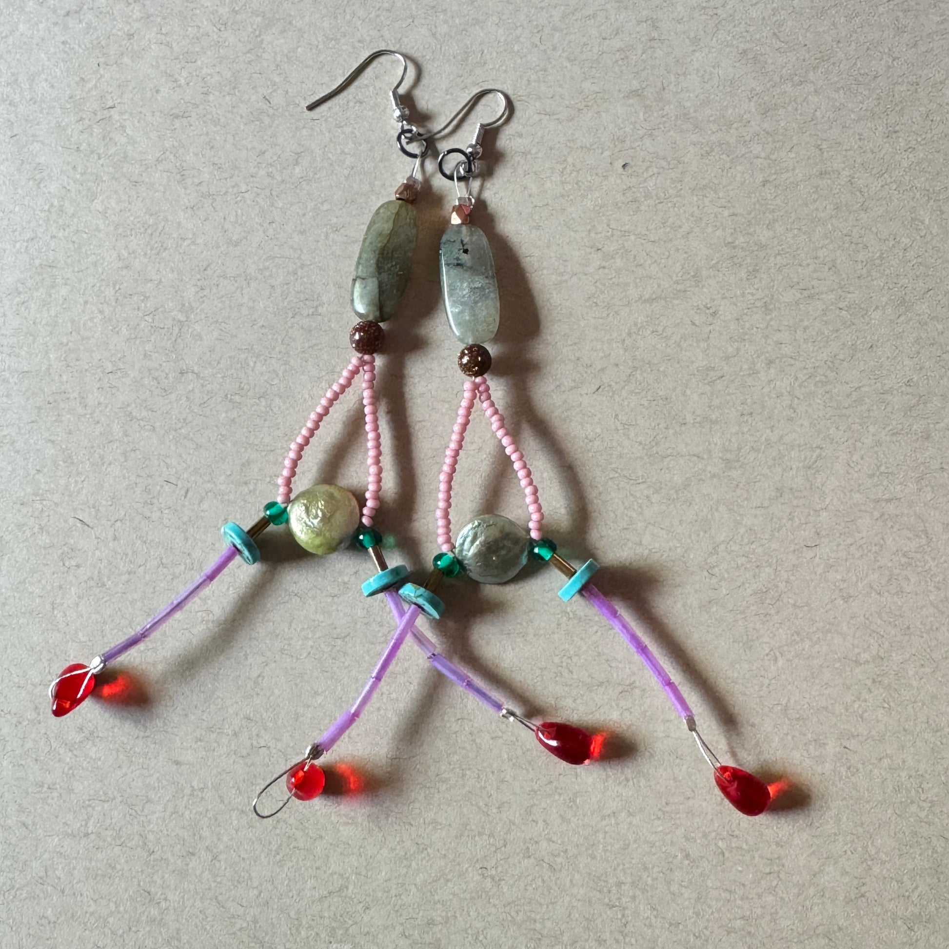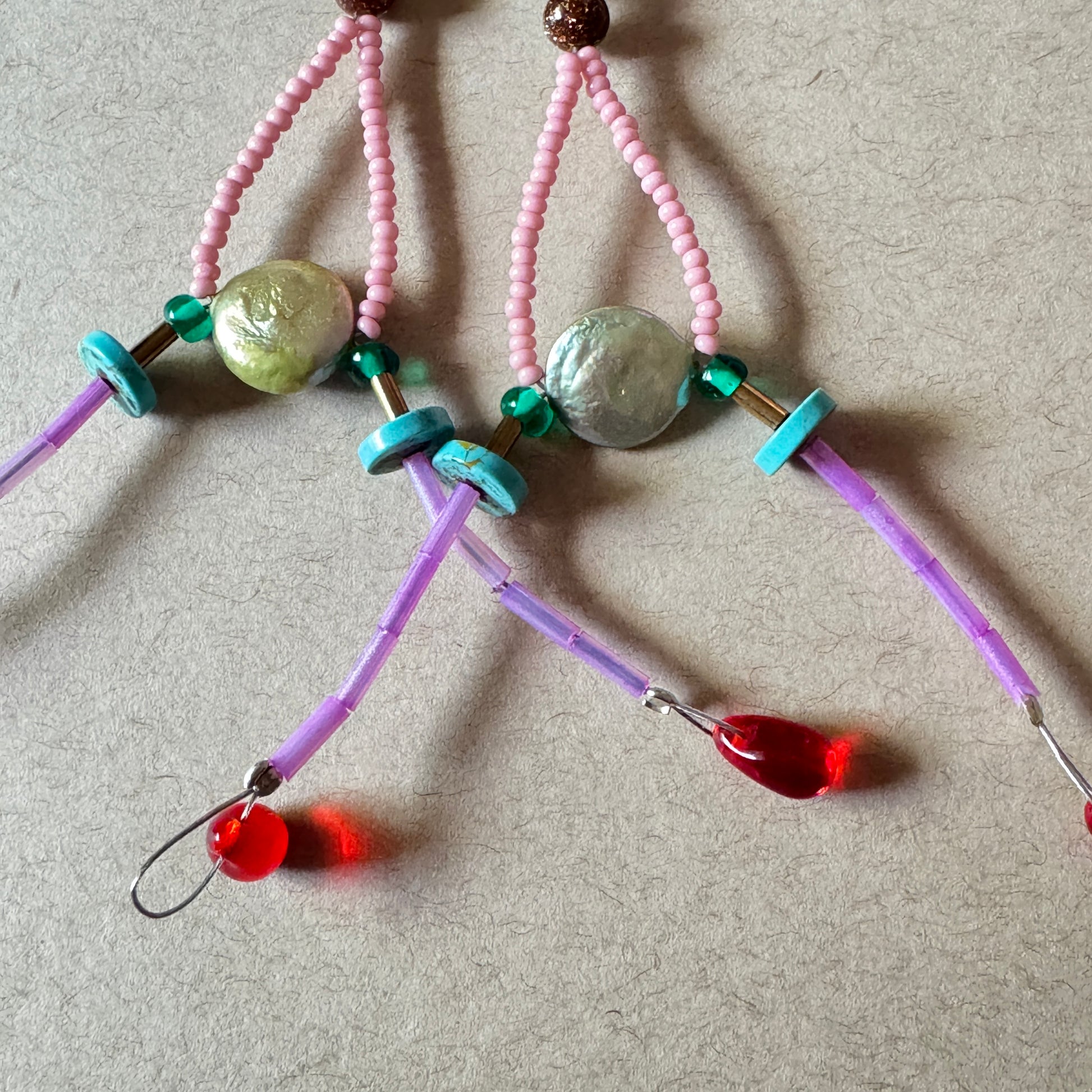 A delicious cascade of color and movement. Orchard Signal earrings feature pink seed bead arches, pearlescent shell coin beads, and labradorite anchors. Turquoise discs, translucent purple tubes, and juicy red glass drops complete the look — like fruit caught in a beam of light.