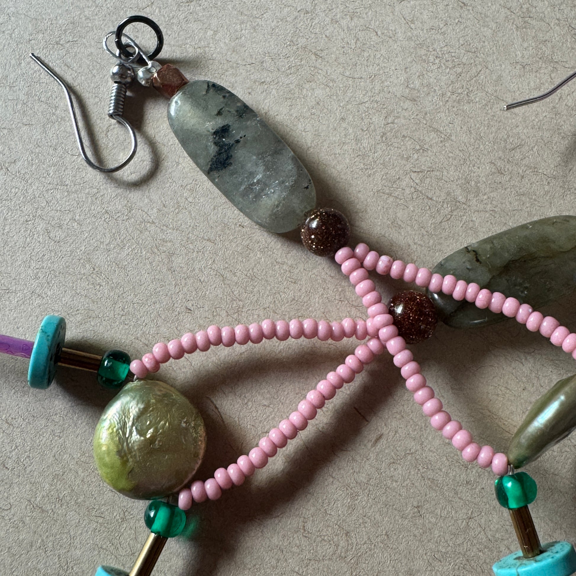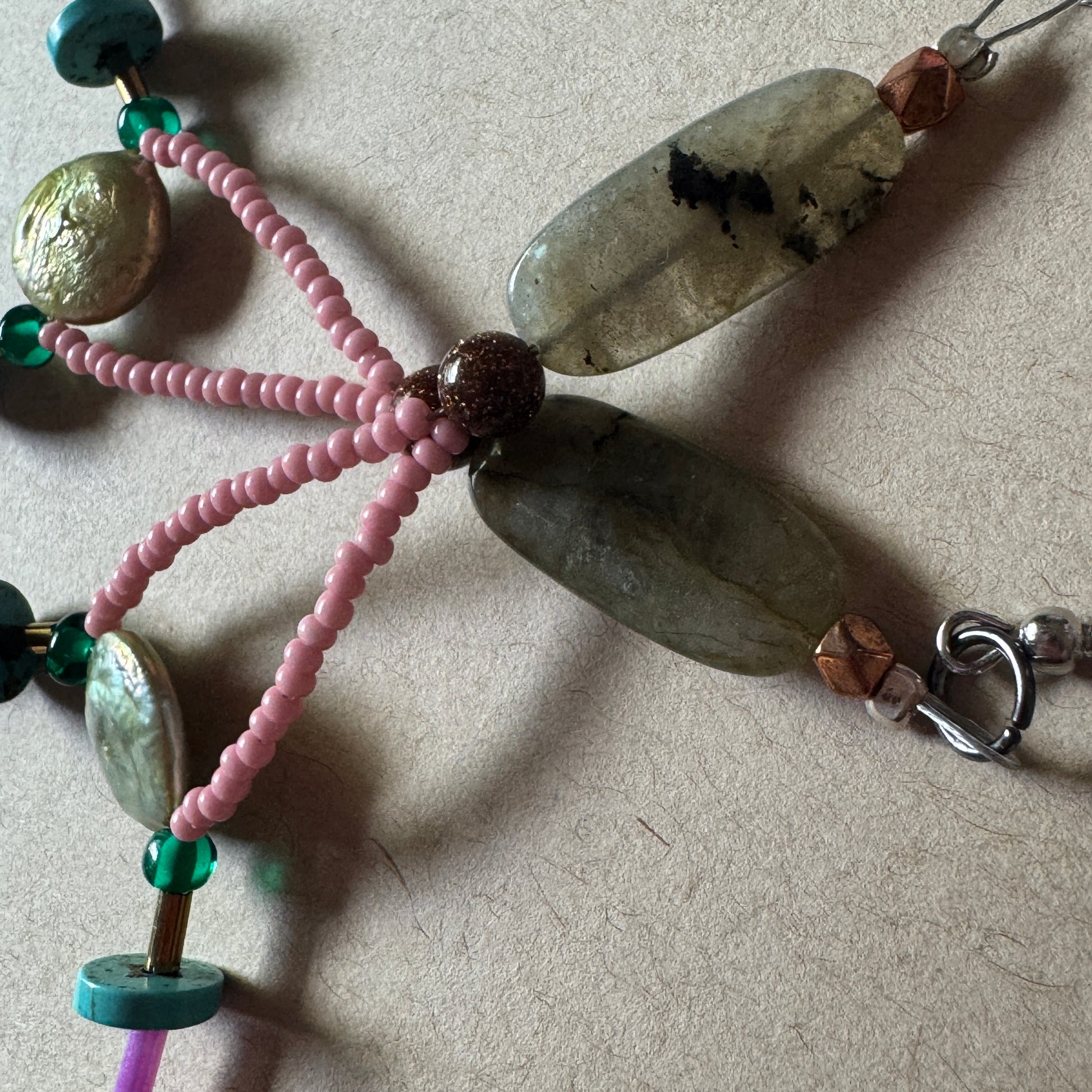 Materials: Labradorite, shell, Czech glass, seed beads, gold stone, recycled components