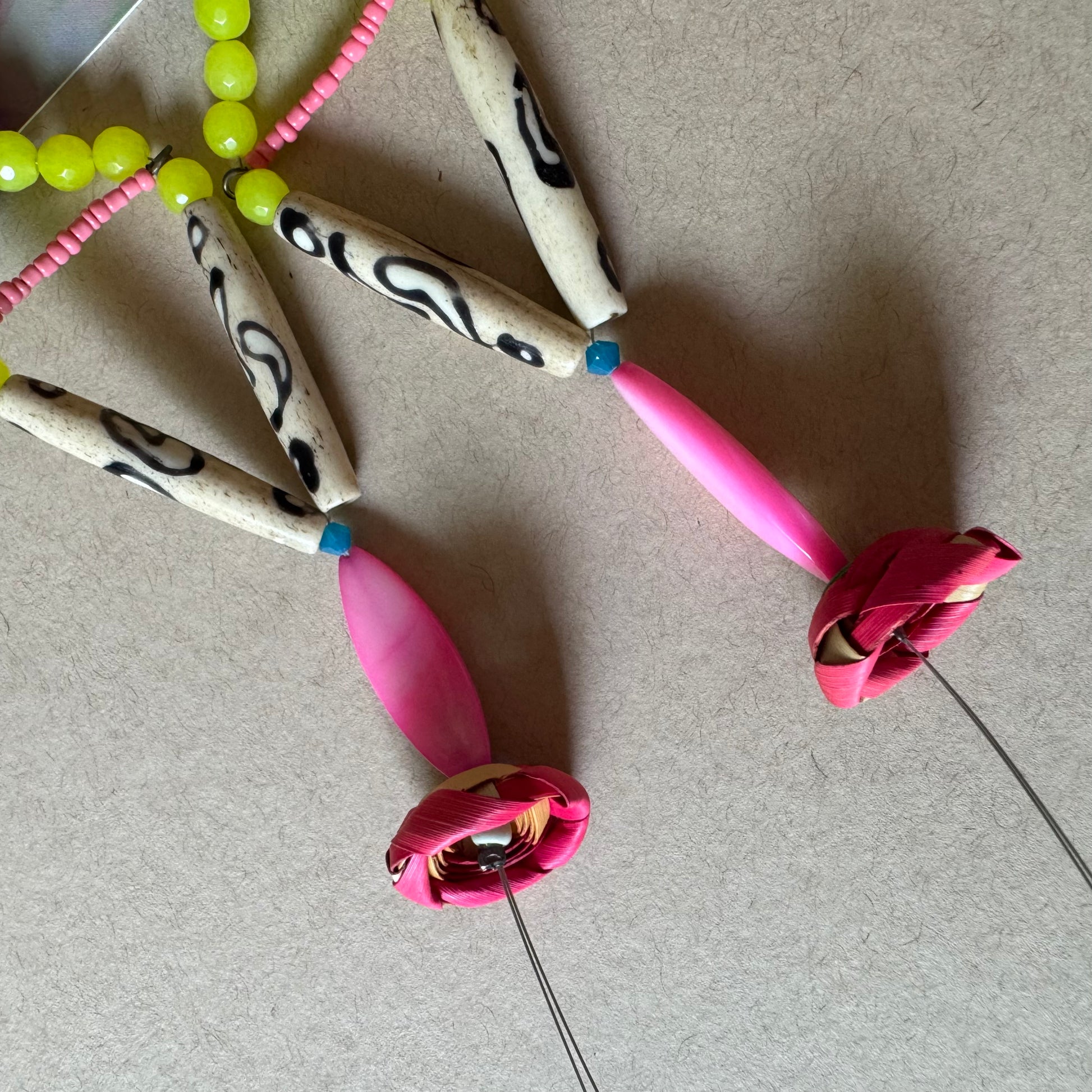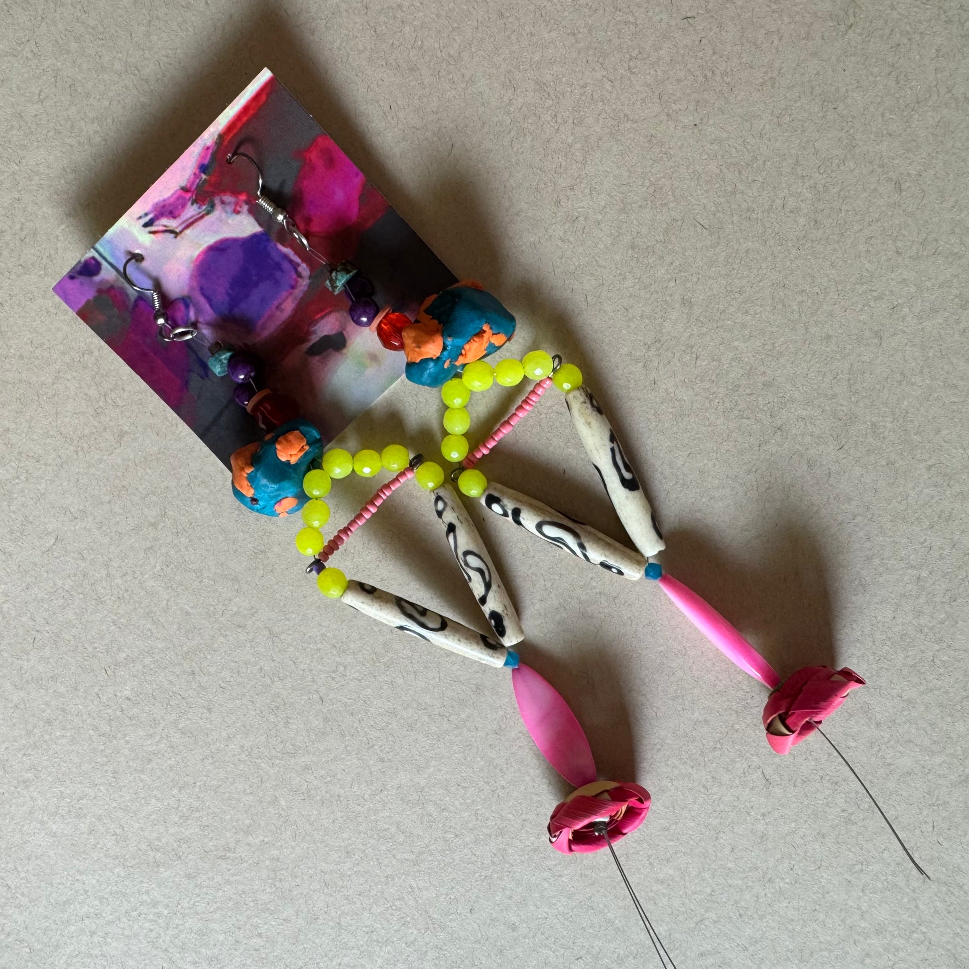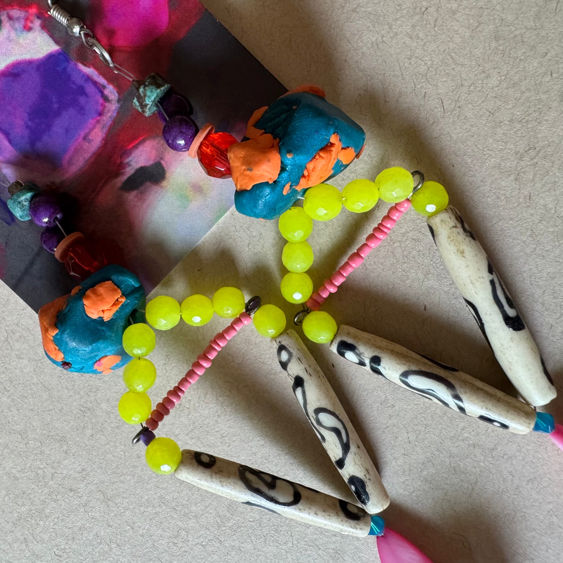 Part sculpture, part ritual object — Petal Spire earrings draw the eye with their towering form and ecstatic color. Neon beads, polymer clay, guatemalan baskets, etched bone, and hand-shaped floral wire elements dance together in a gravity-defying structure. At 7 inches, they're kinetic, bold, and absolutely one-of-a-kind.