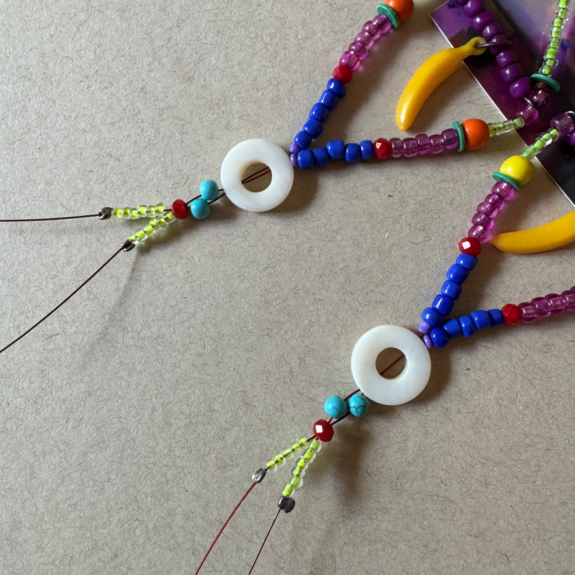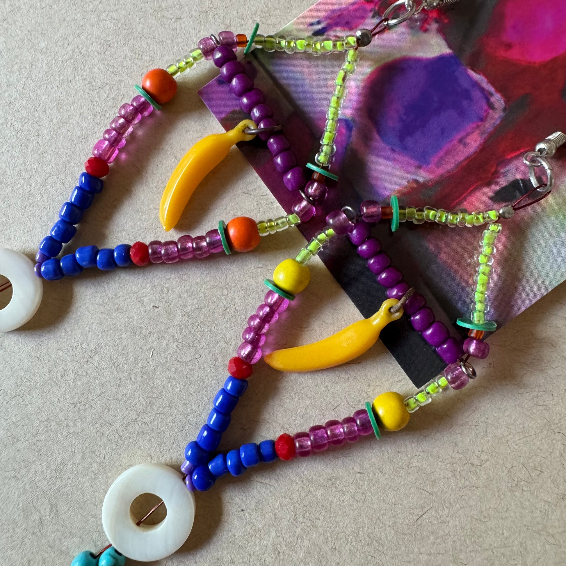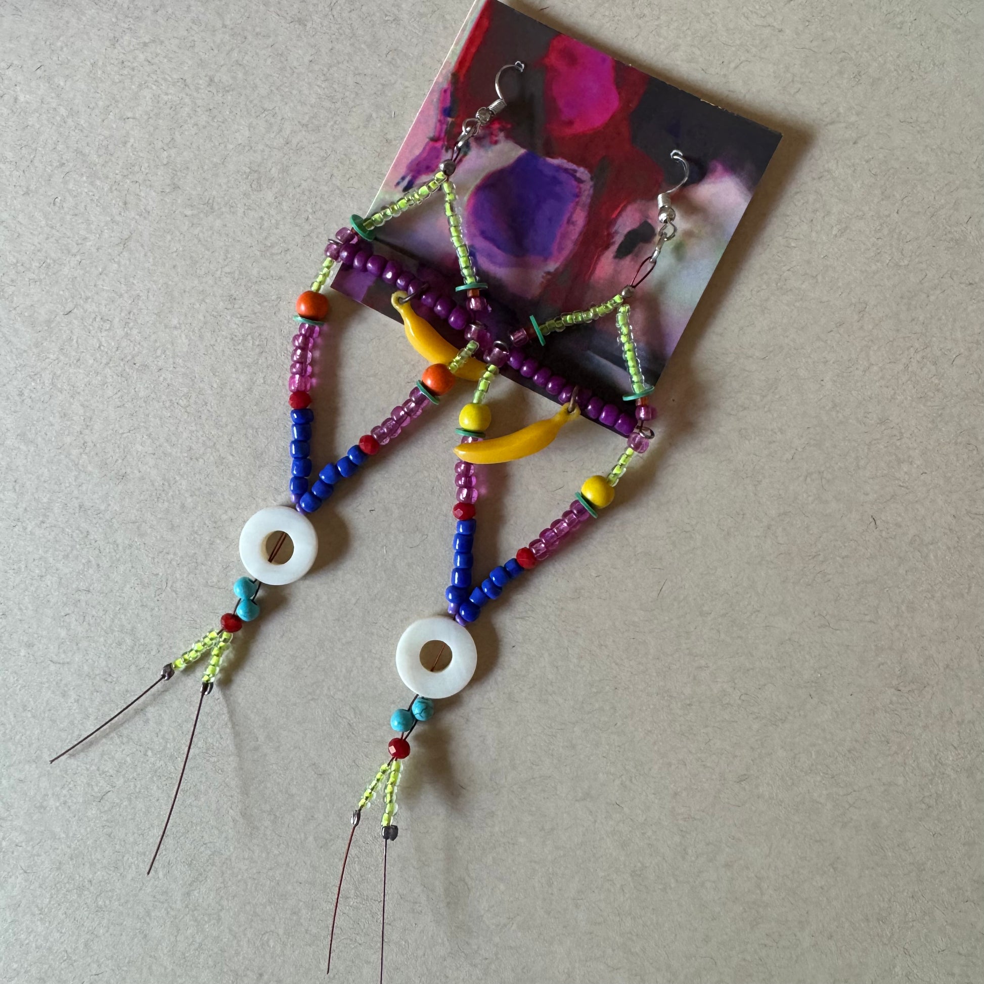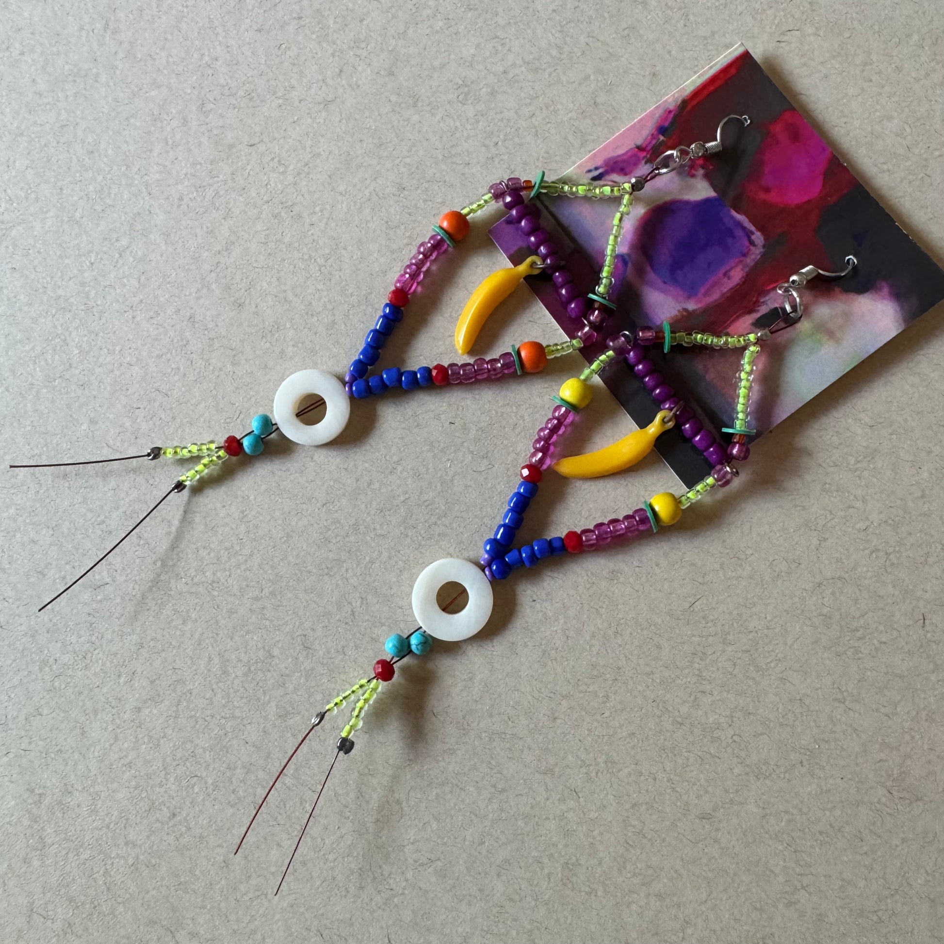 These 6-inch earrings are architectural spells — a triangulated dance of bold primary beads, white shell discs, and dangling wire tails. They feel like coded messages from another dimension, or wearable antennae for color-loving dreamers.