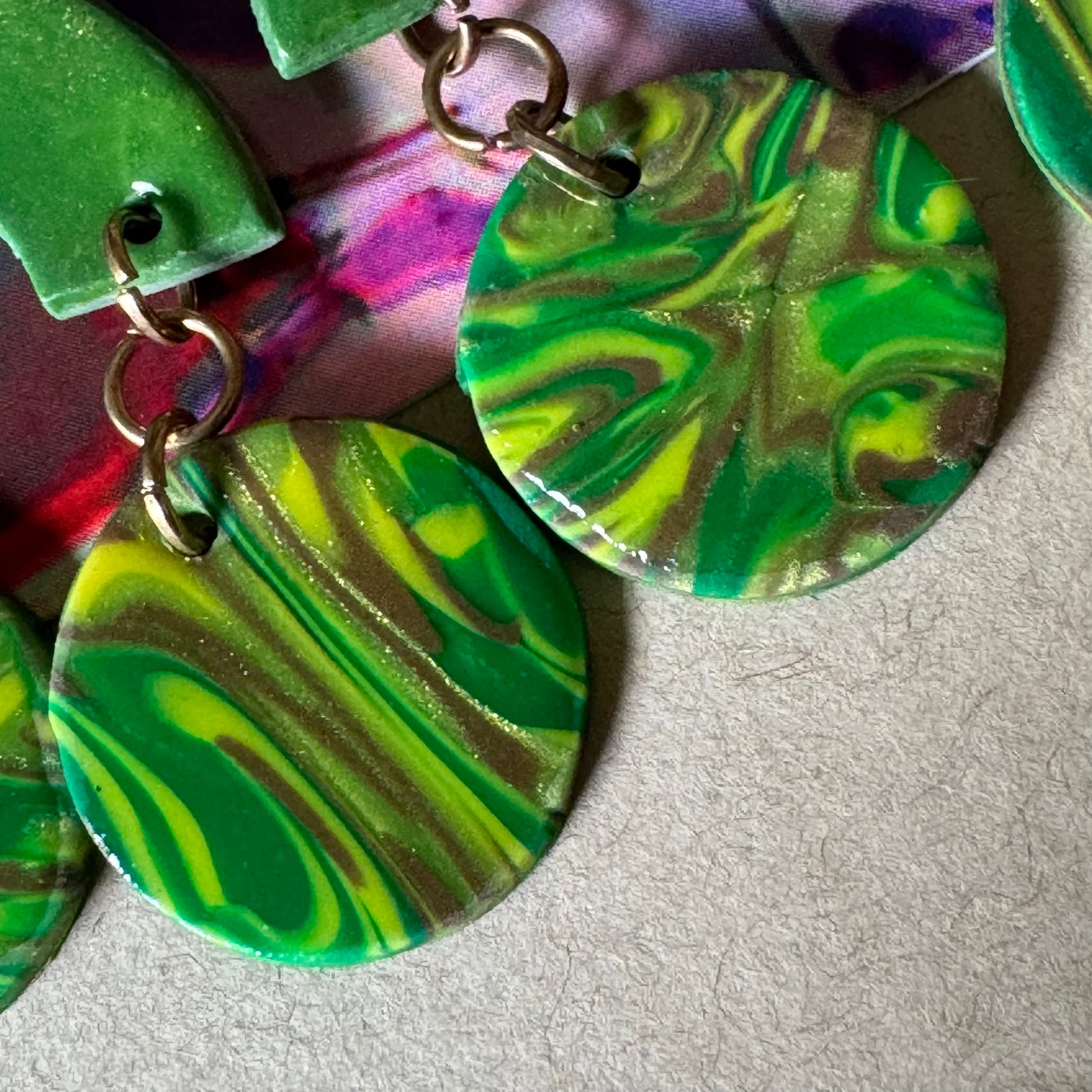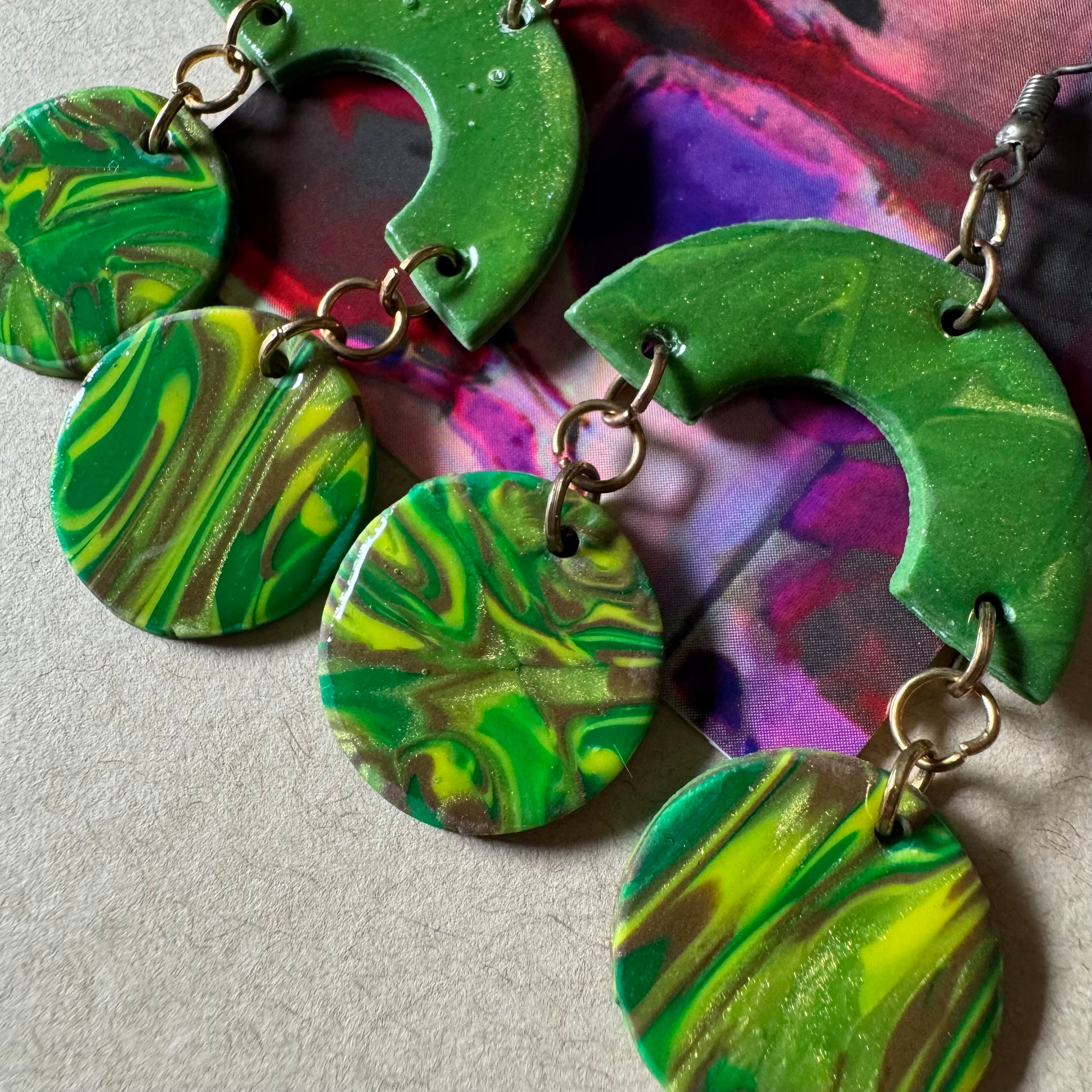🧿 Material: Hand-marbled polymer clay in bold green, golden yellow, and earthy accents