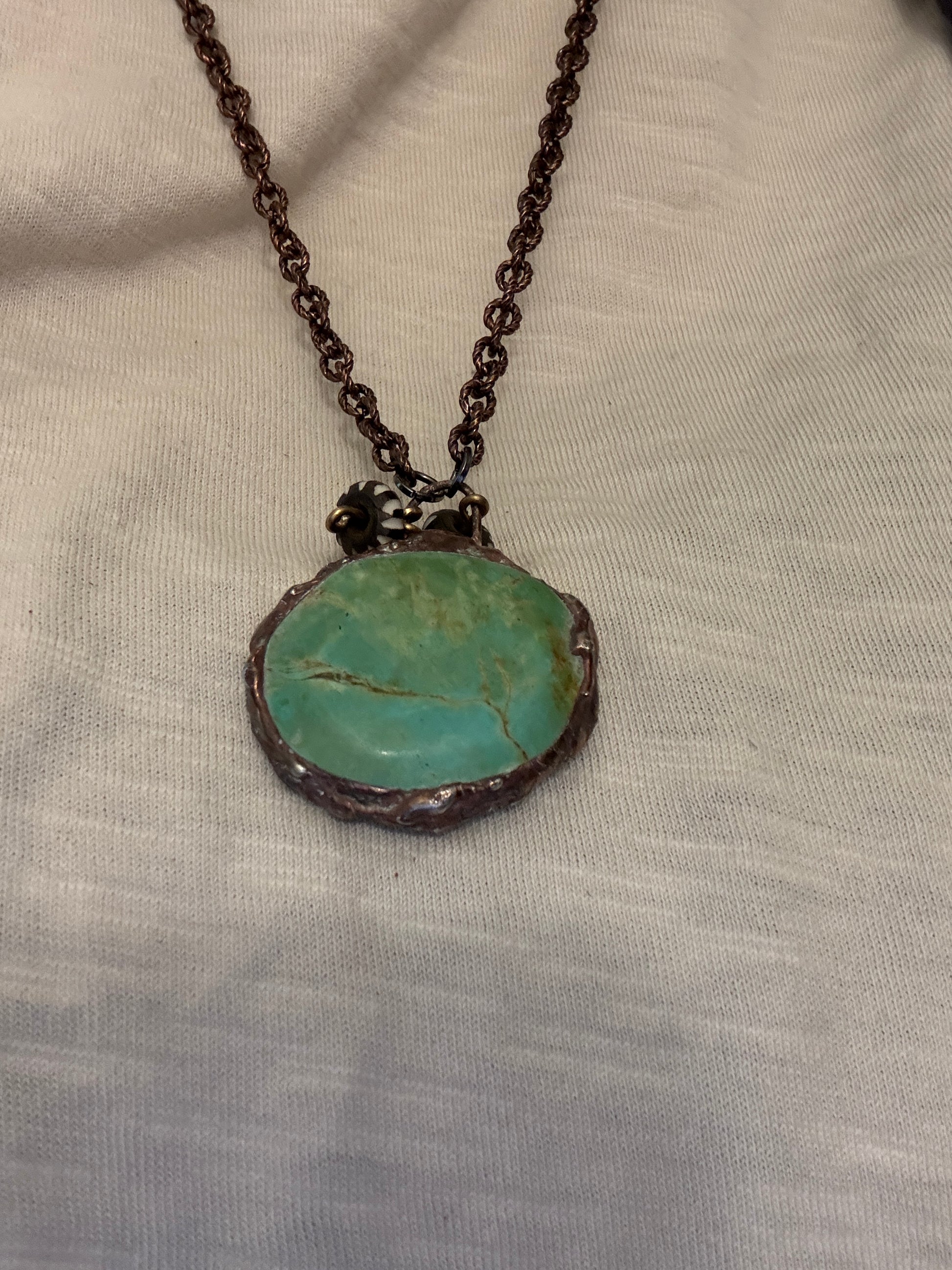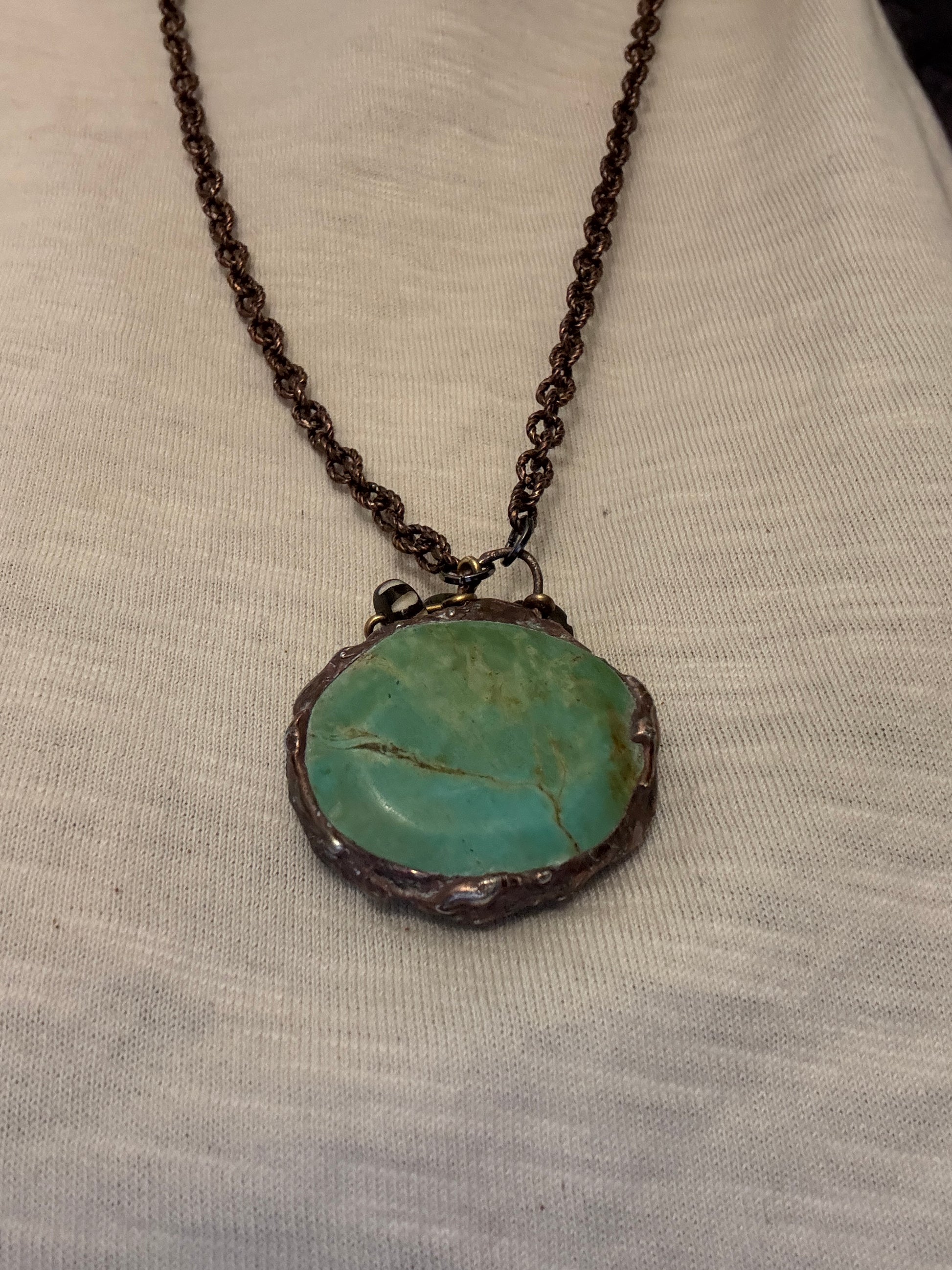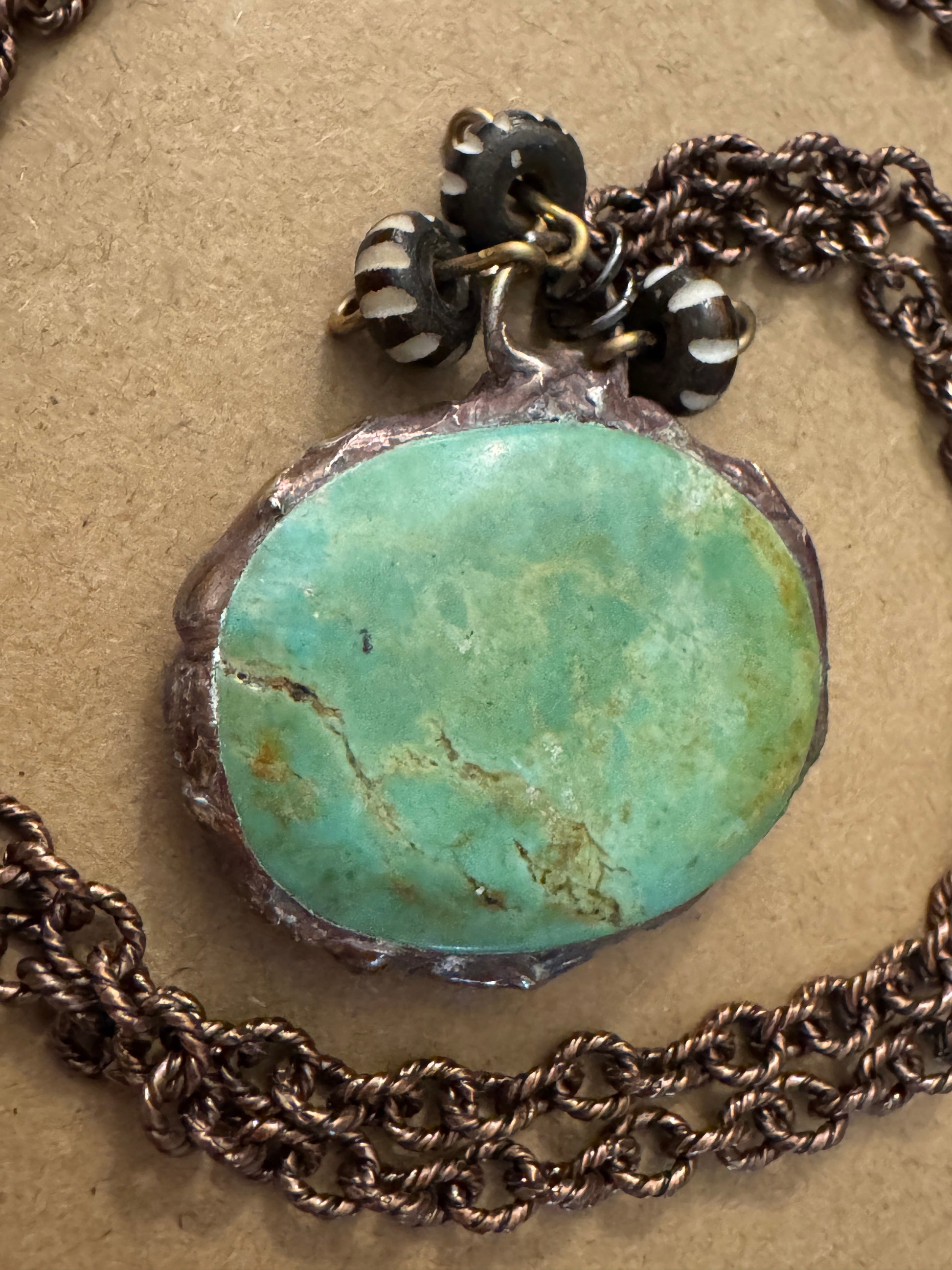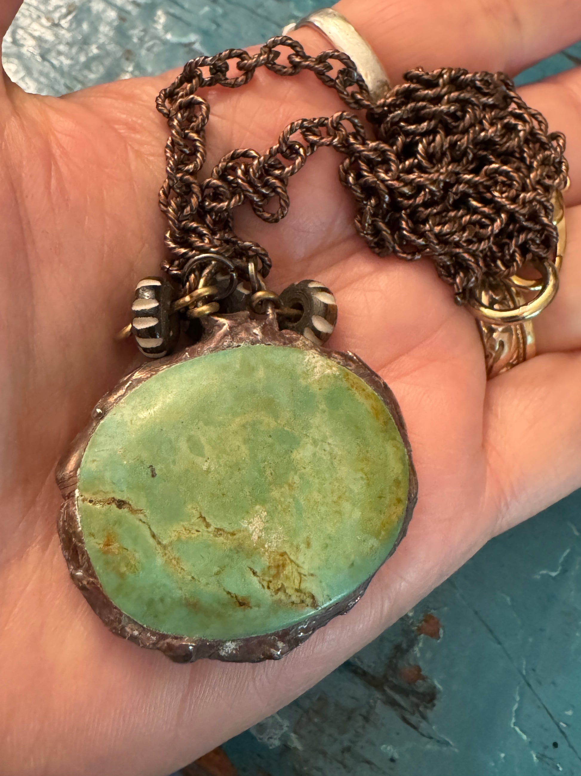 This pendant holds a smooth, earth-washed green stone that looks like it’s held the memory of rain. Set in soft solder with an organic rim and finished with a sturdy handmade copper chain, it’s paired with black-and-white bone beads that hum quietly at the clasp. A piece for grounding, for stillness, for remembering you’re made of earth and water too.