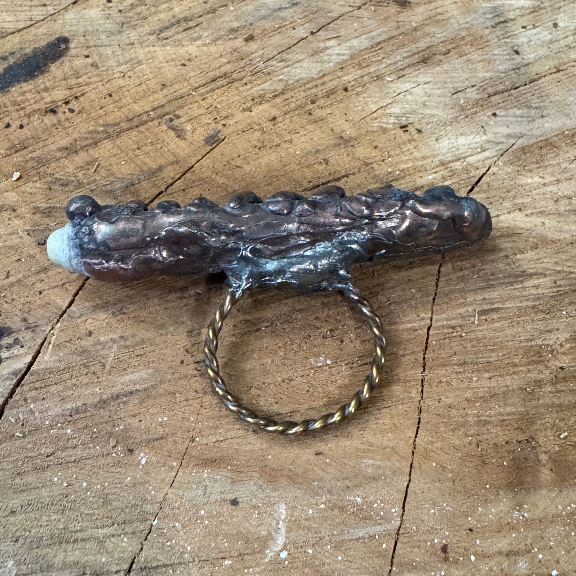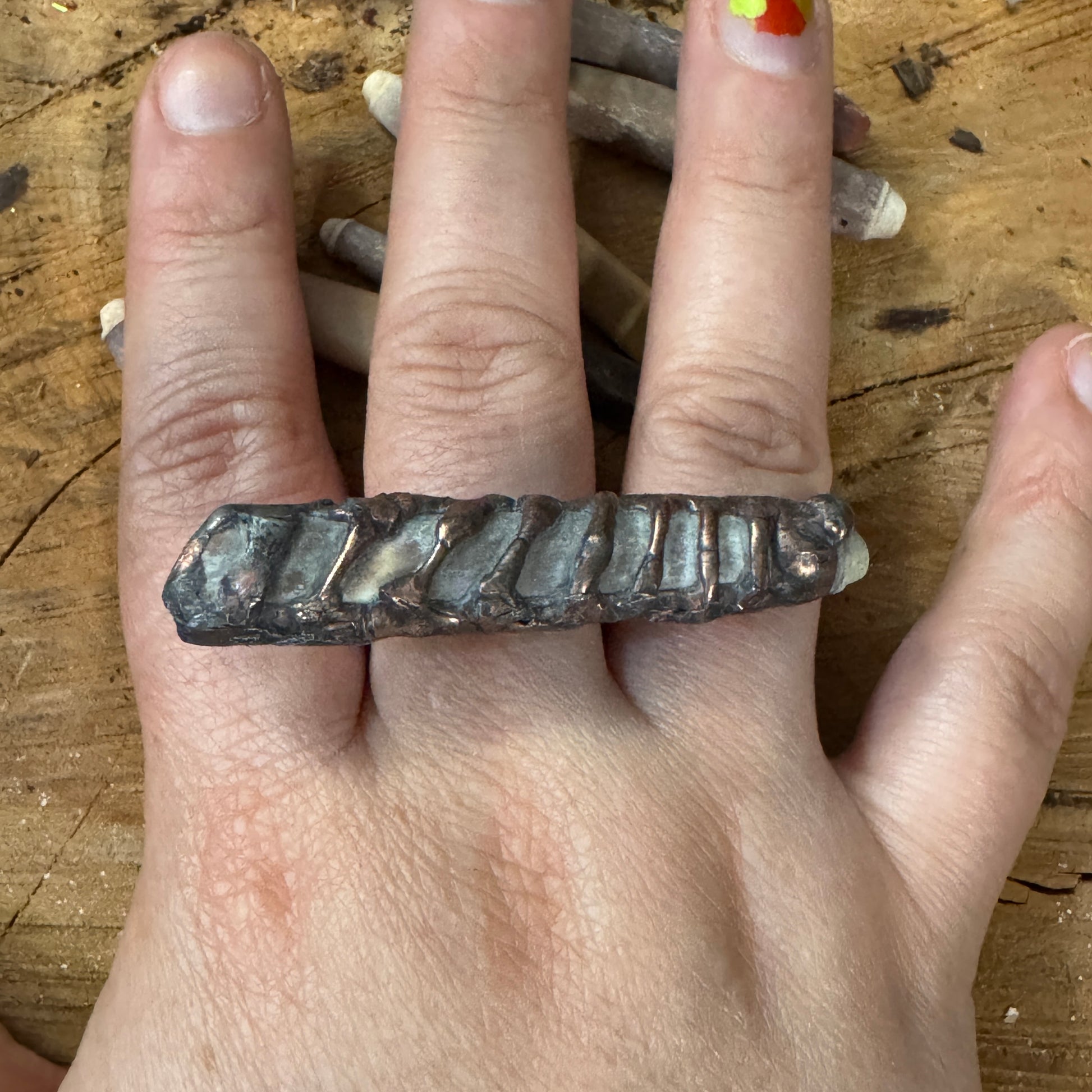Sculpted like something uncovered, not made—this ring wraps around texture, rhythm, and the quiet weight of memory. The form came first: long and ridged like vertebrae, spine, fossil. Embedded at one end is a sea urchin bead, not the focus, but a final breath—something once alive now holding still. Twisted brass, soft solder, and raw instinct bring it together. It’s a piece about lineage, edge, and what gets carried forward.