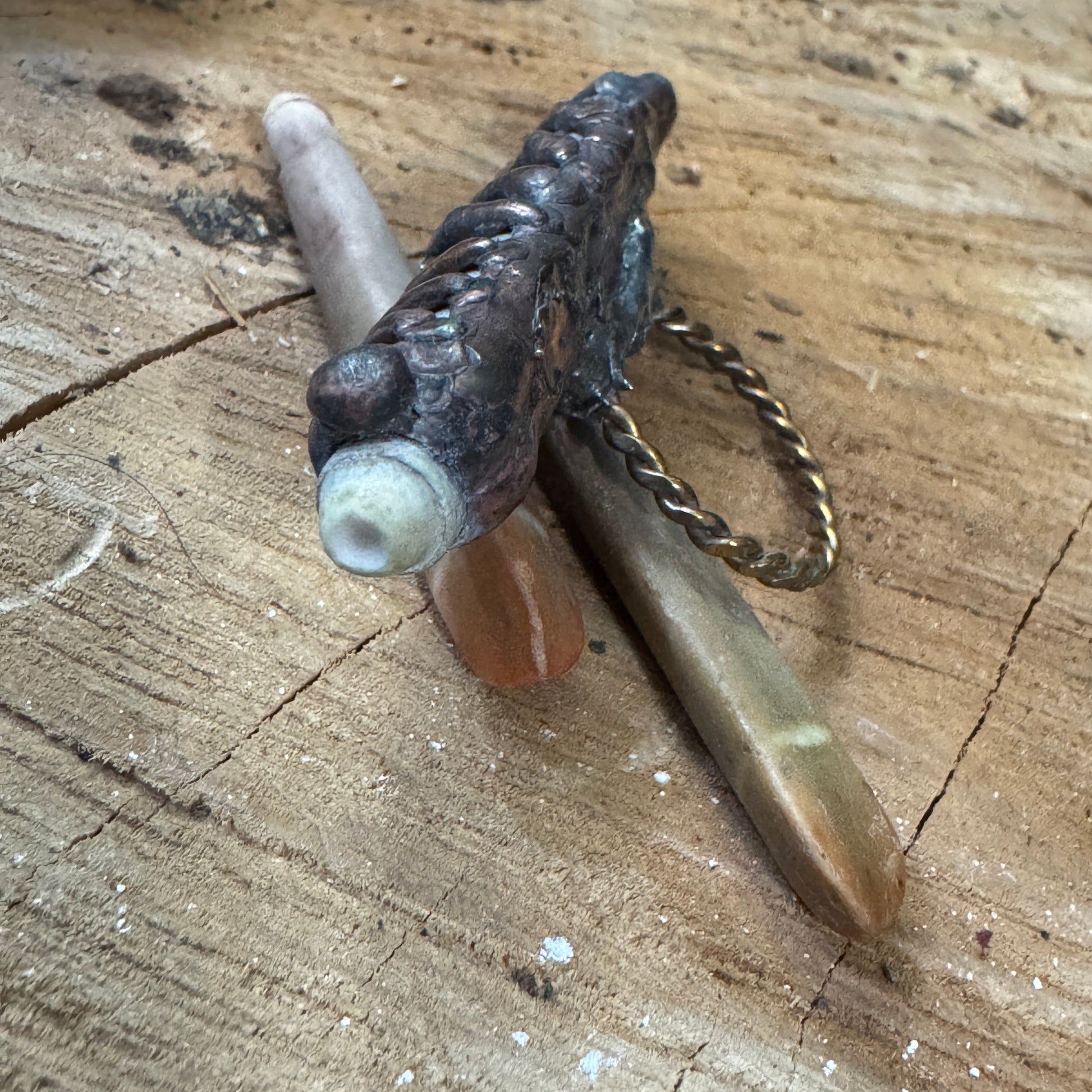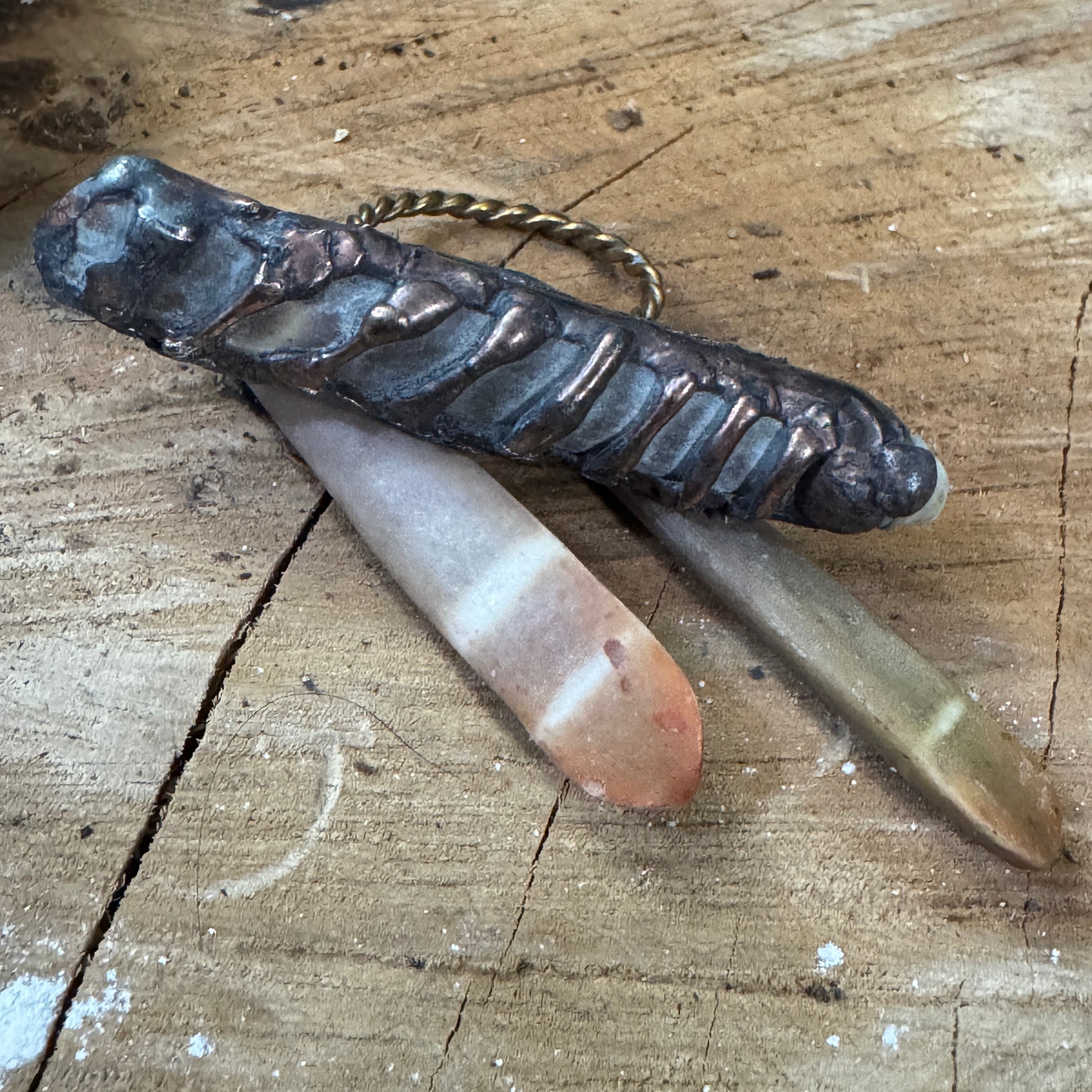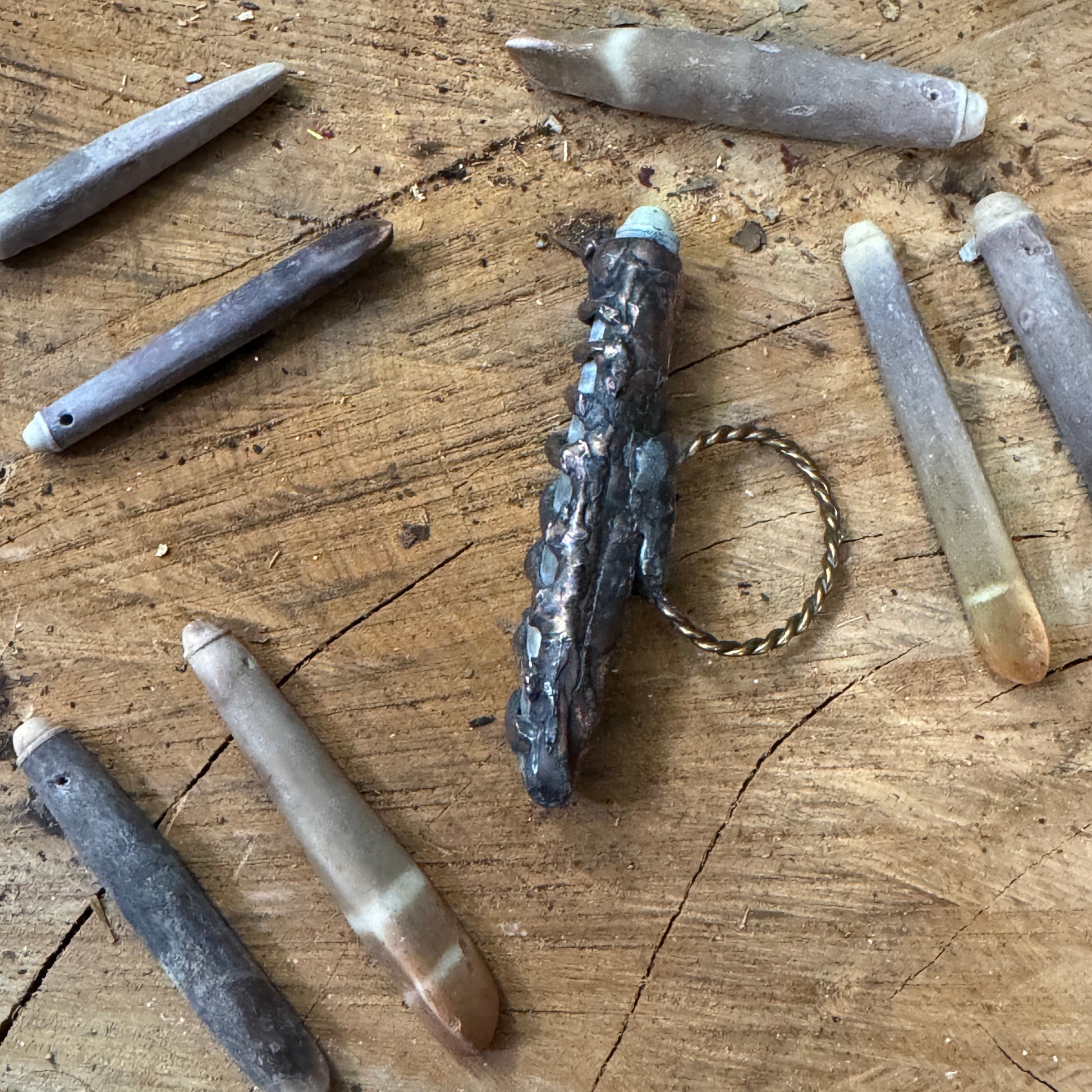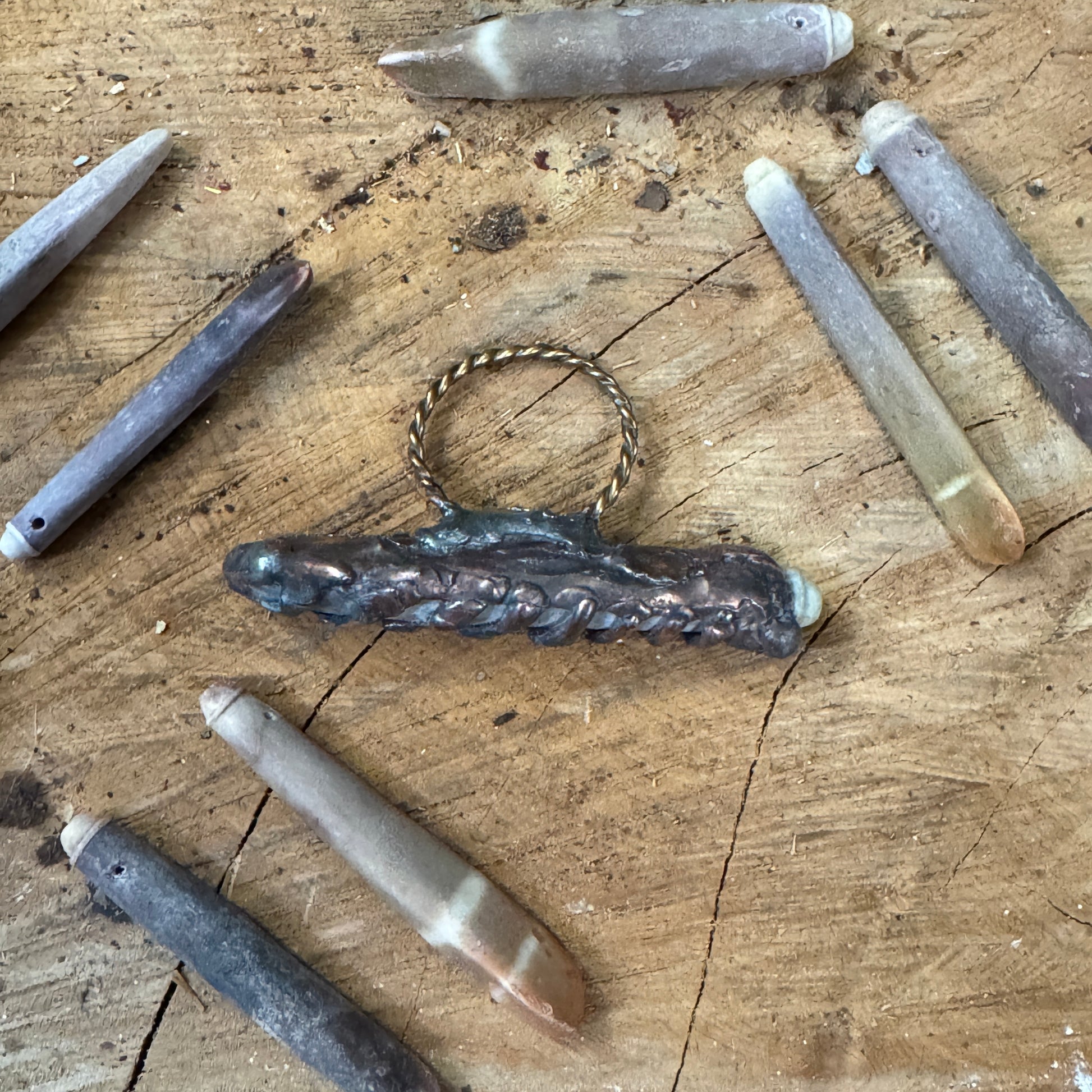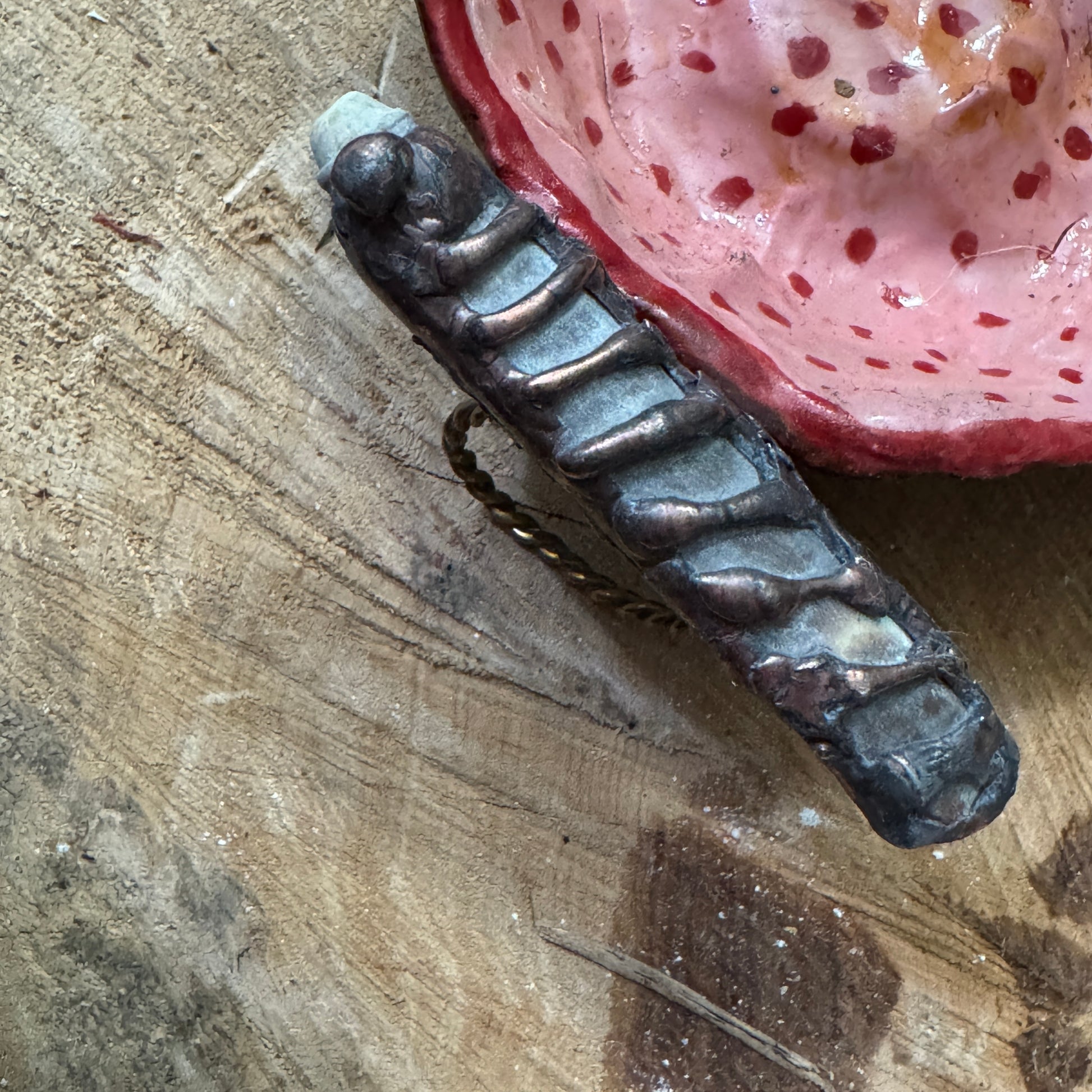 This piece is made with pewter (soft solder), natural materials, and raw elements, and it will develop a patina over time—that’s part of its magic. Tarnishing is completely normal. The darkening and shifts in tone are a living surface, shaped by touch, air, and time.