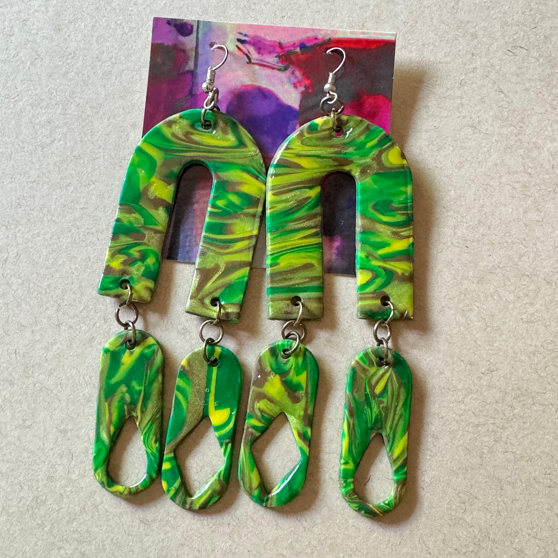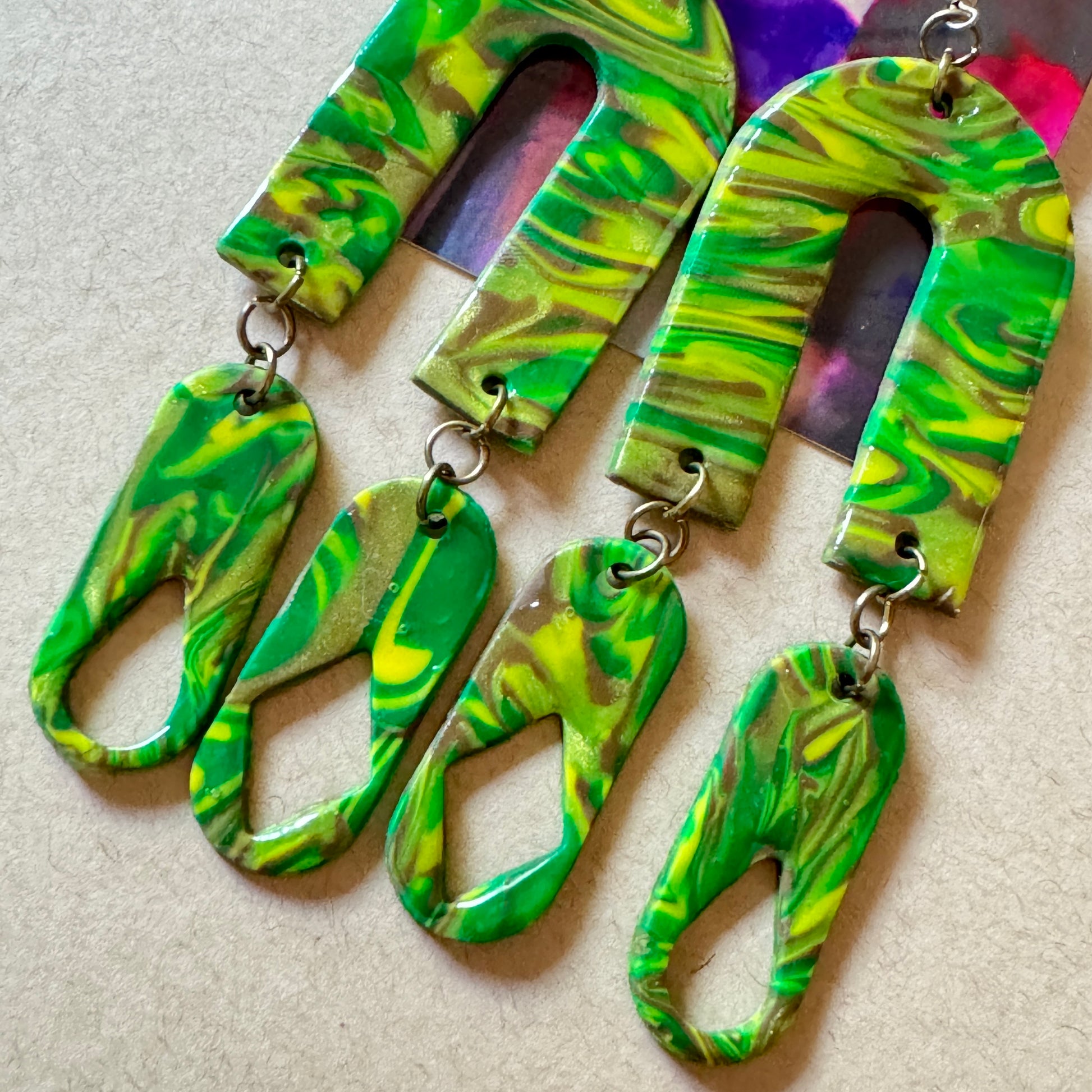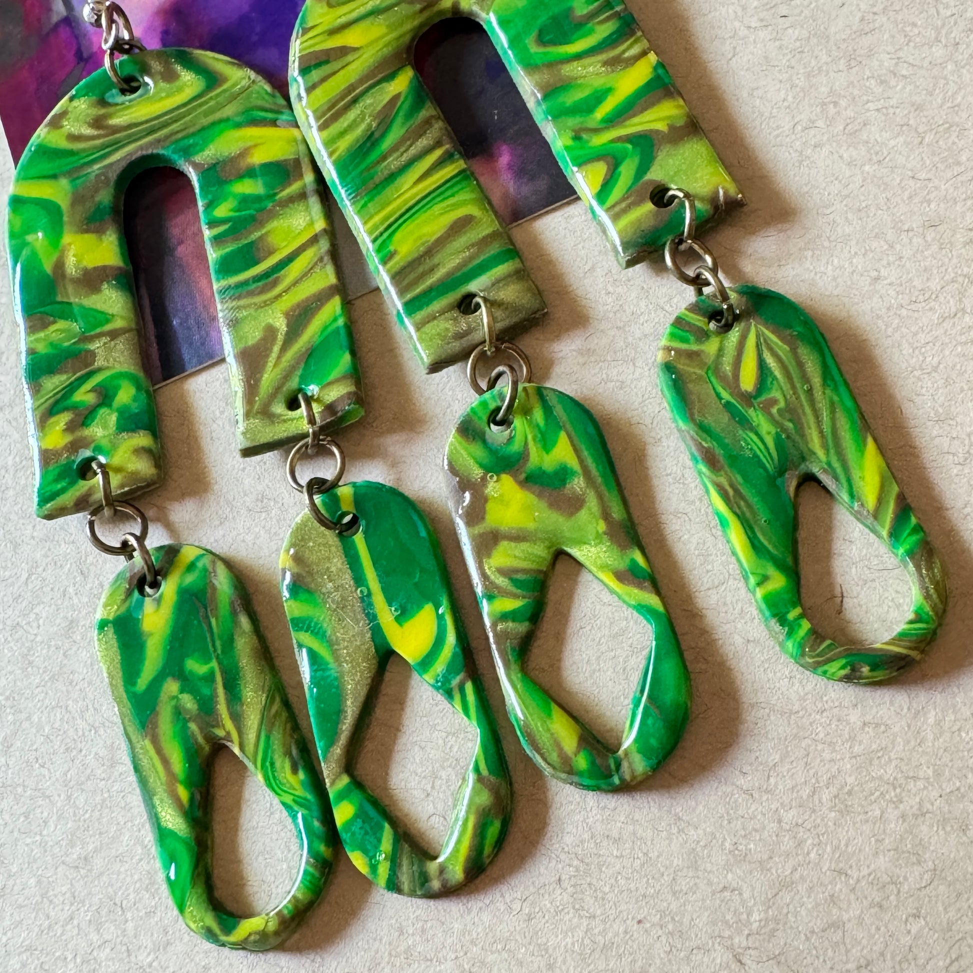 ✨Material: Polymer clay with a glossy finish, hand-marbled in shades of lime, jungle green, and gold shimmer.