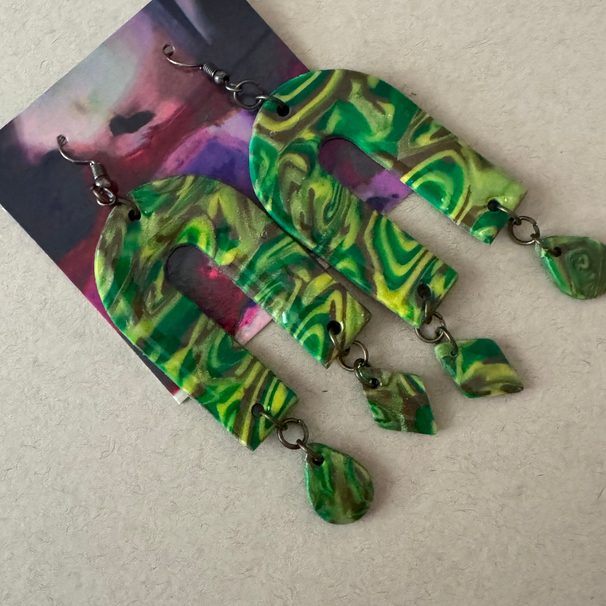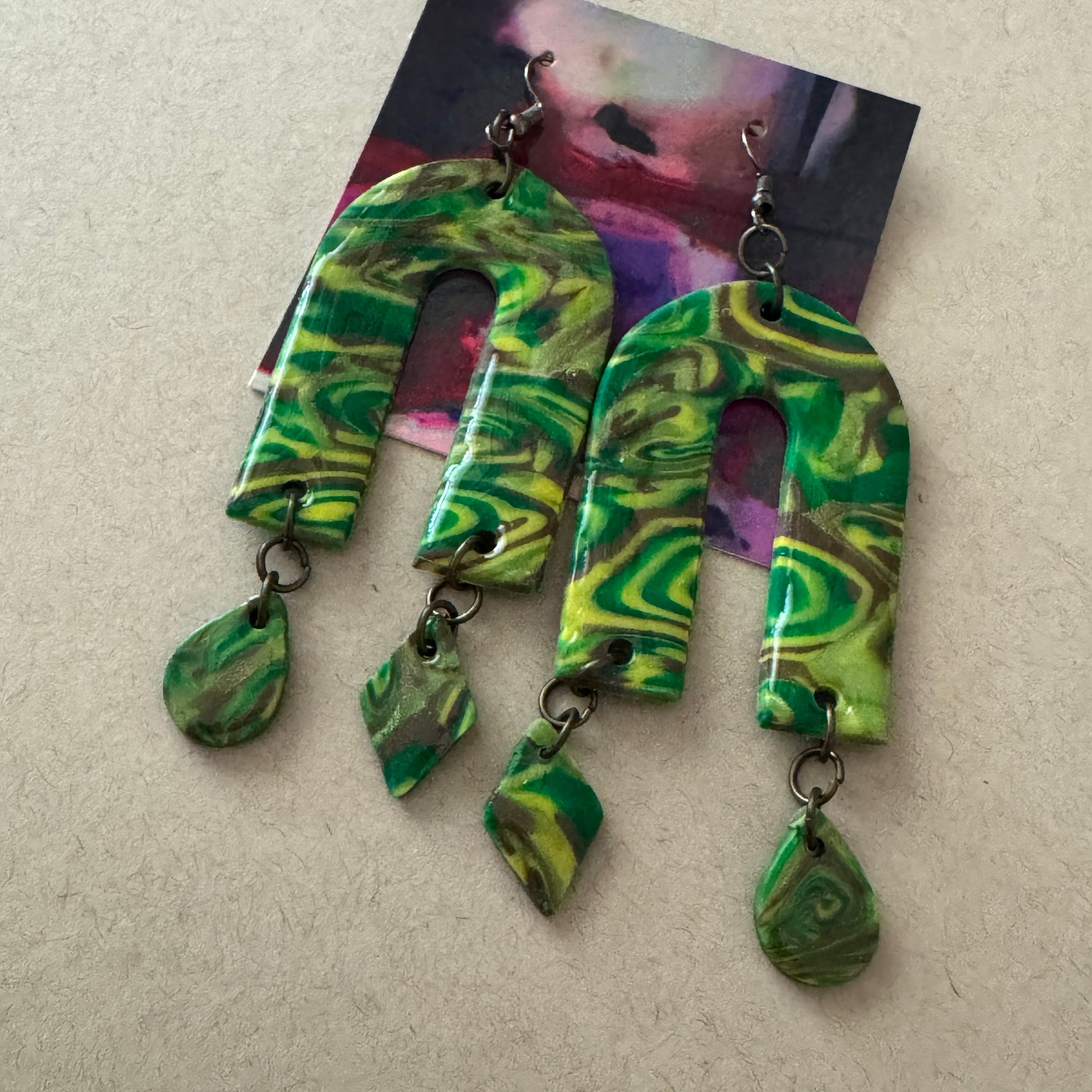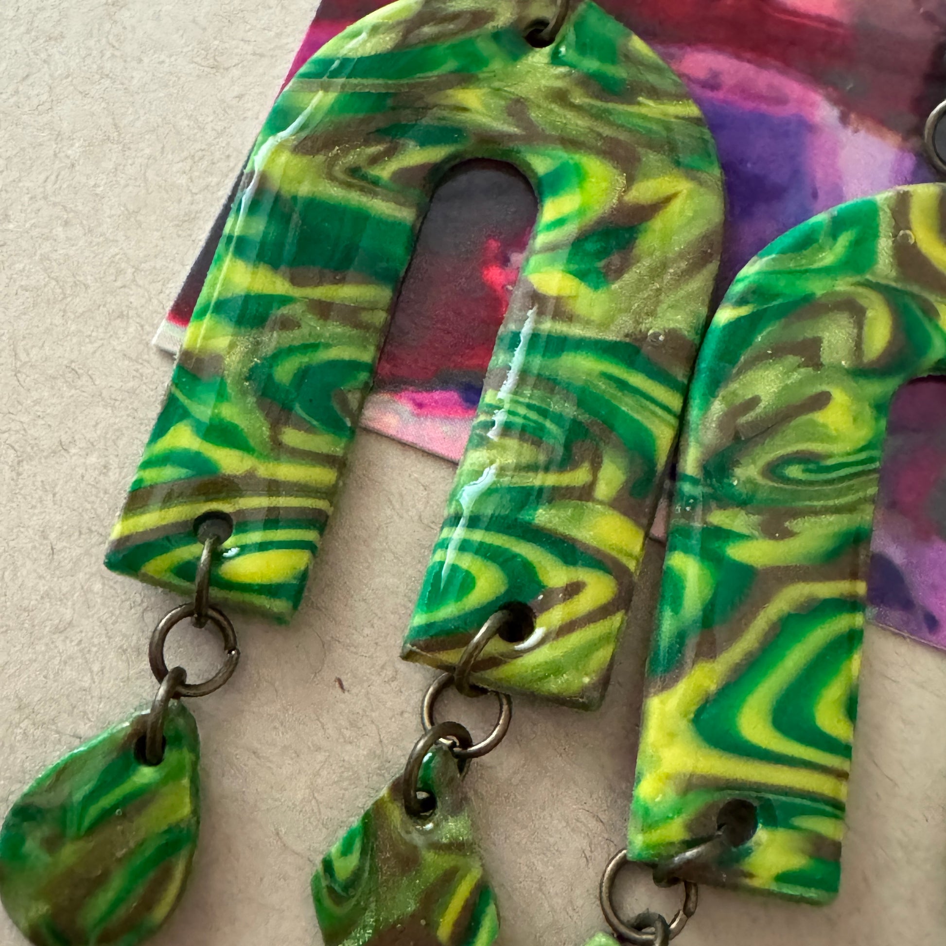 🧿 Material: Hand-marbled polymer clay in layered green, jungle yellow, and earthy bronze tones