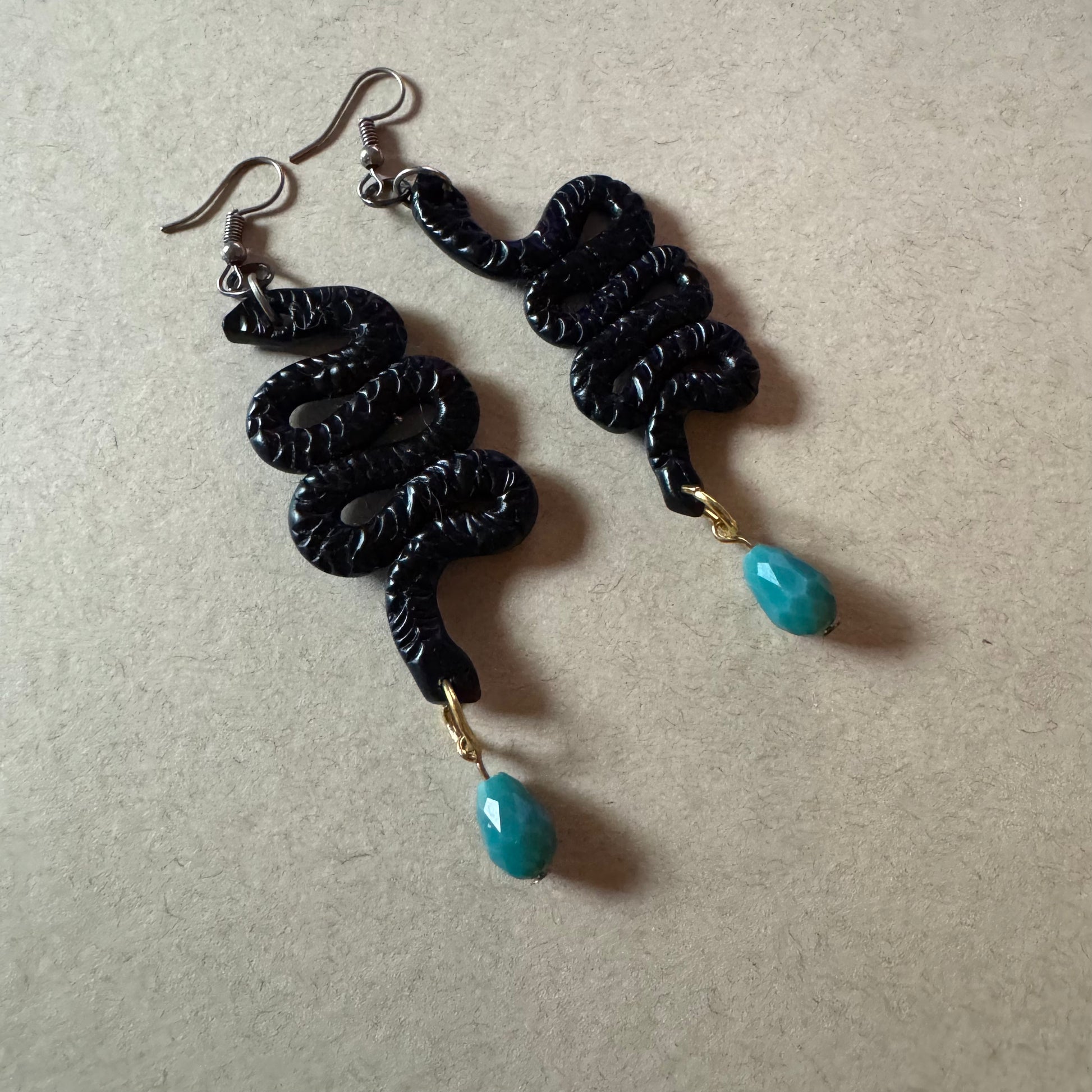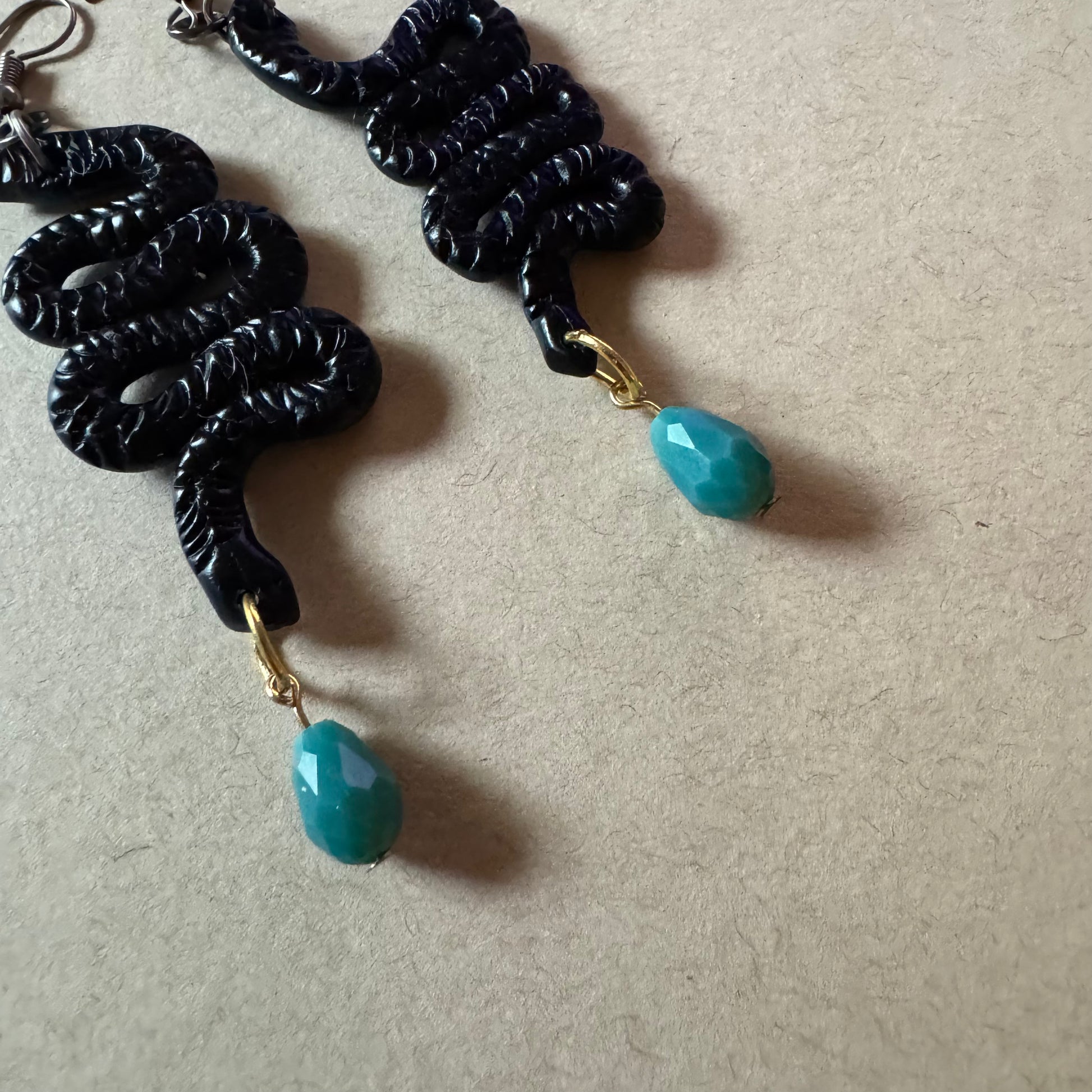 Hand-sculpted in jet-black polymer clay, these snake-like coils twist with texture and tension—each one ending in a faceted turquoise glass drop, like a fang mid-drip. Lightweight but full of drama, they hold movement and myth in every curve.