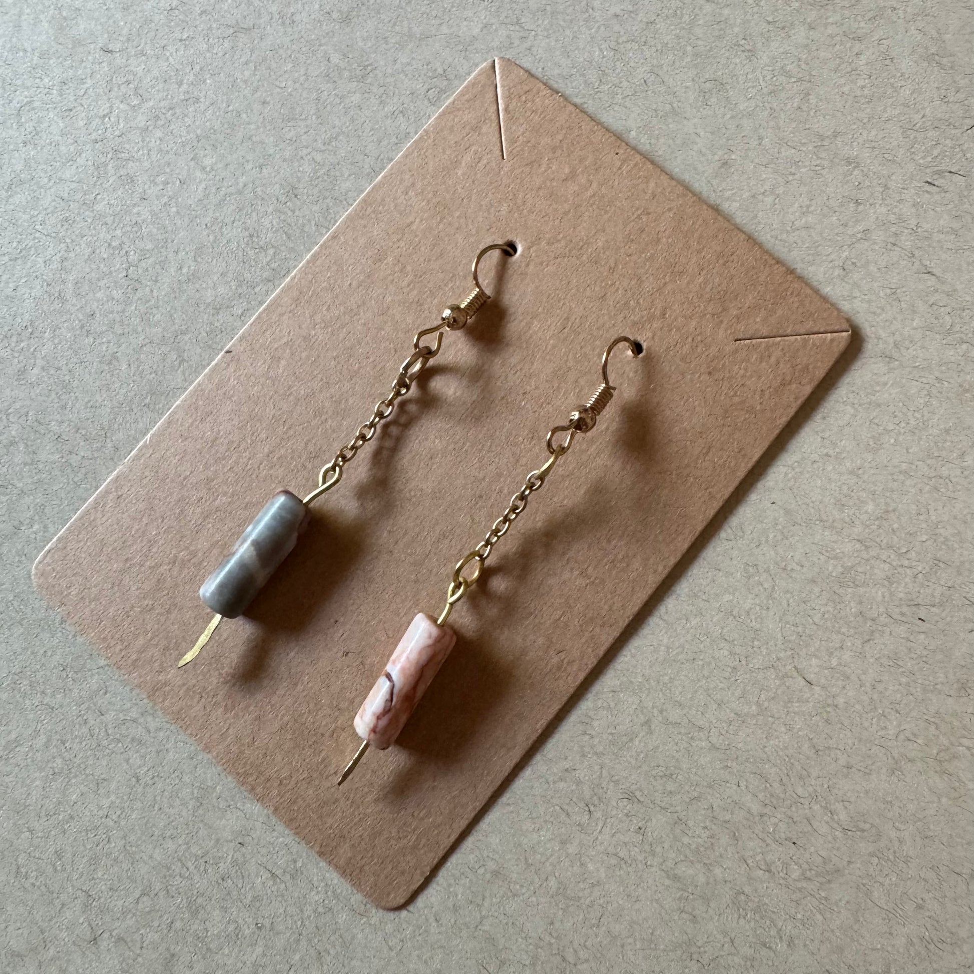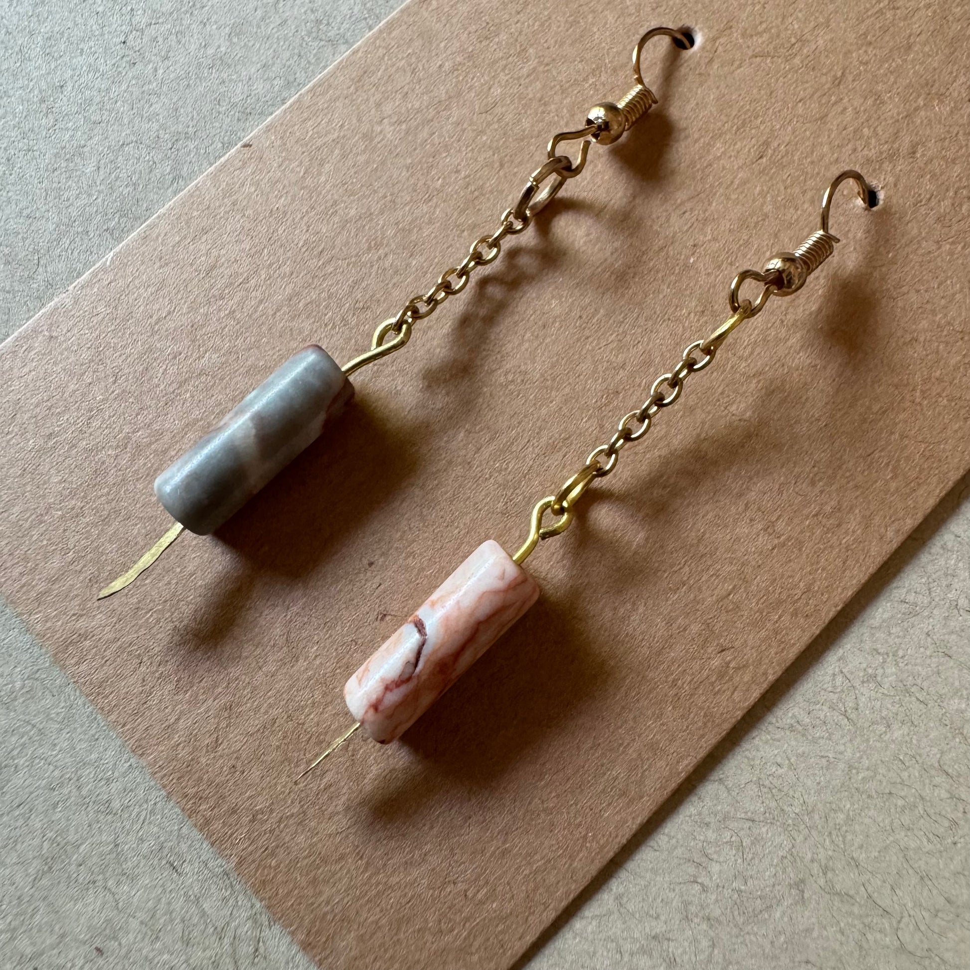 Elegant in form and grounded in stone, these lightweight 2.5" earrings feature natural rhodochrosite cylinders on hand-formed brass pins and chain. Each stone carries soft marbling—one in dusty rose, the other in a stormy gray—making this pair beautifully asymmetric and quietly powerful.