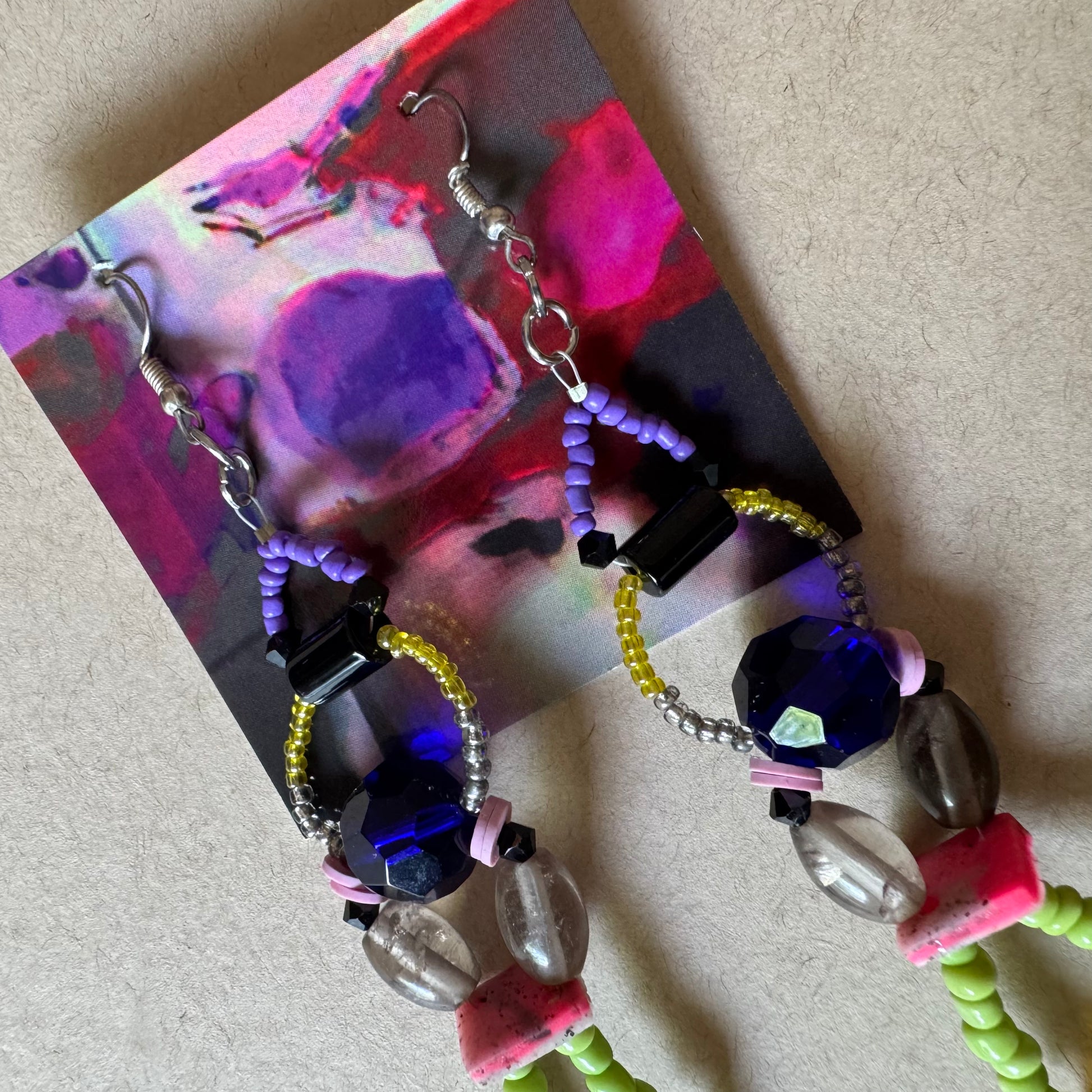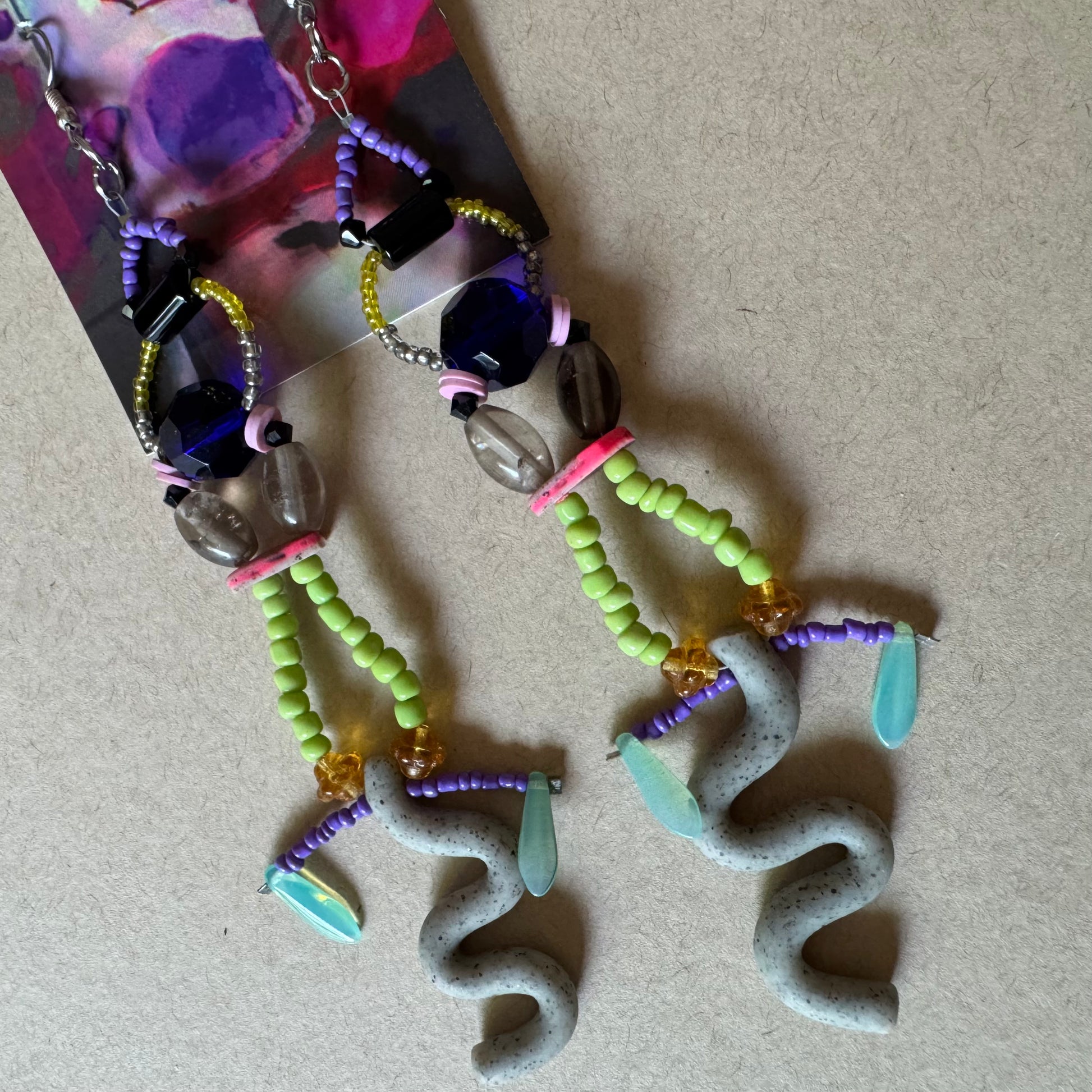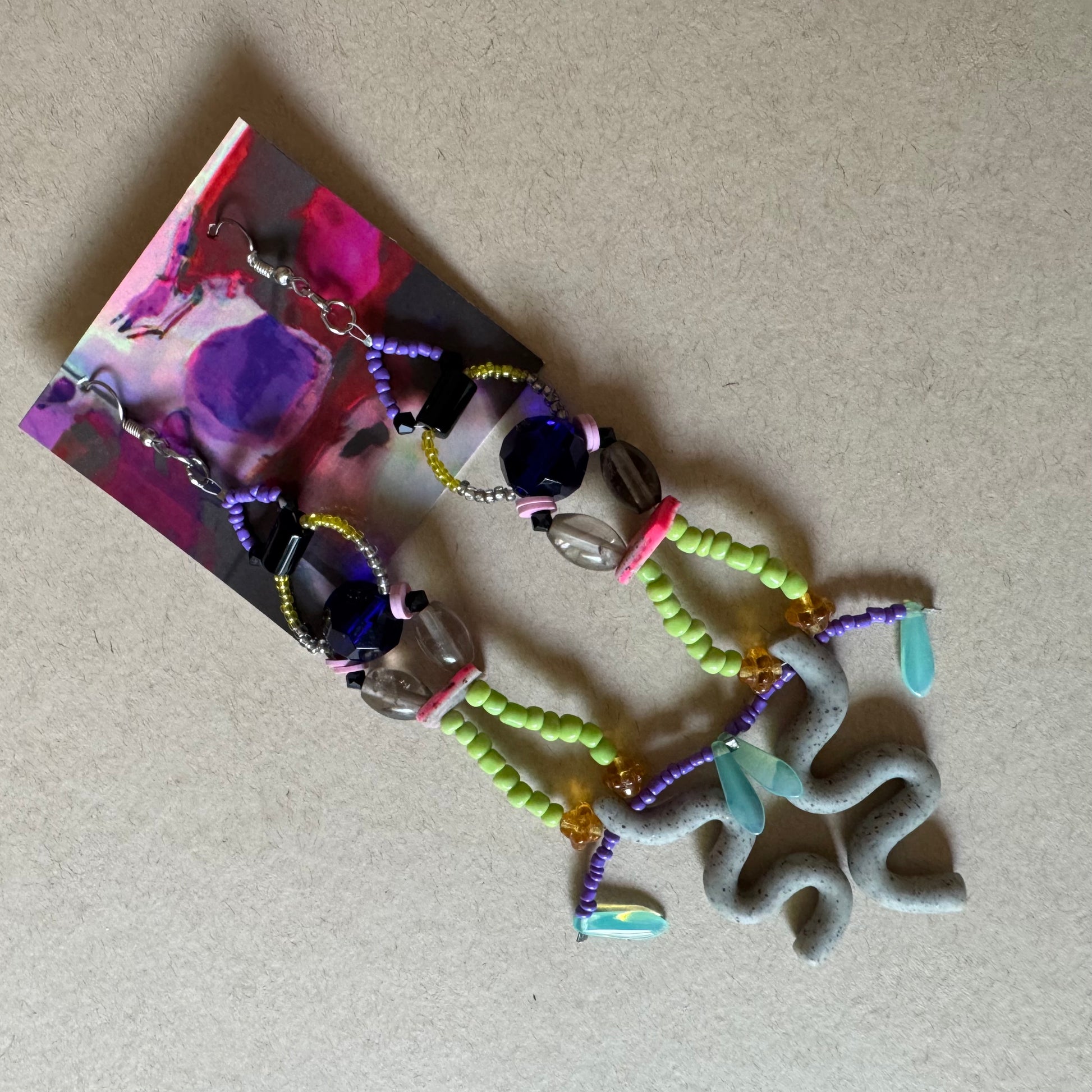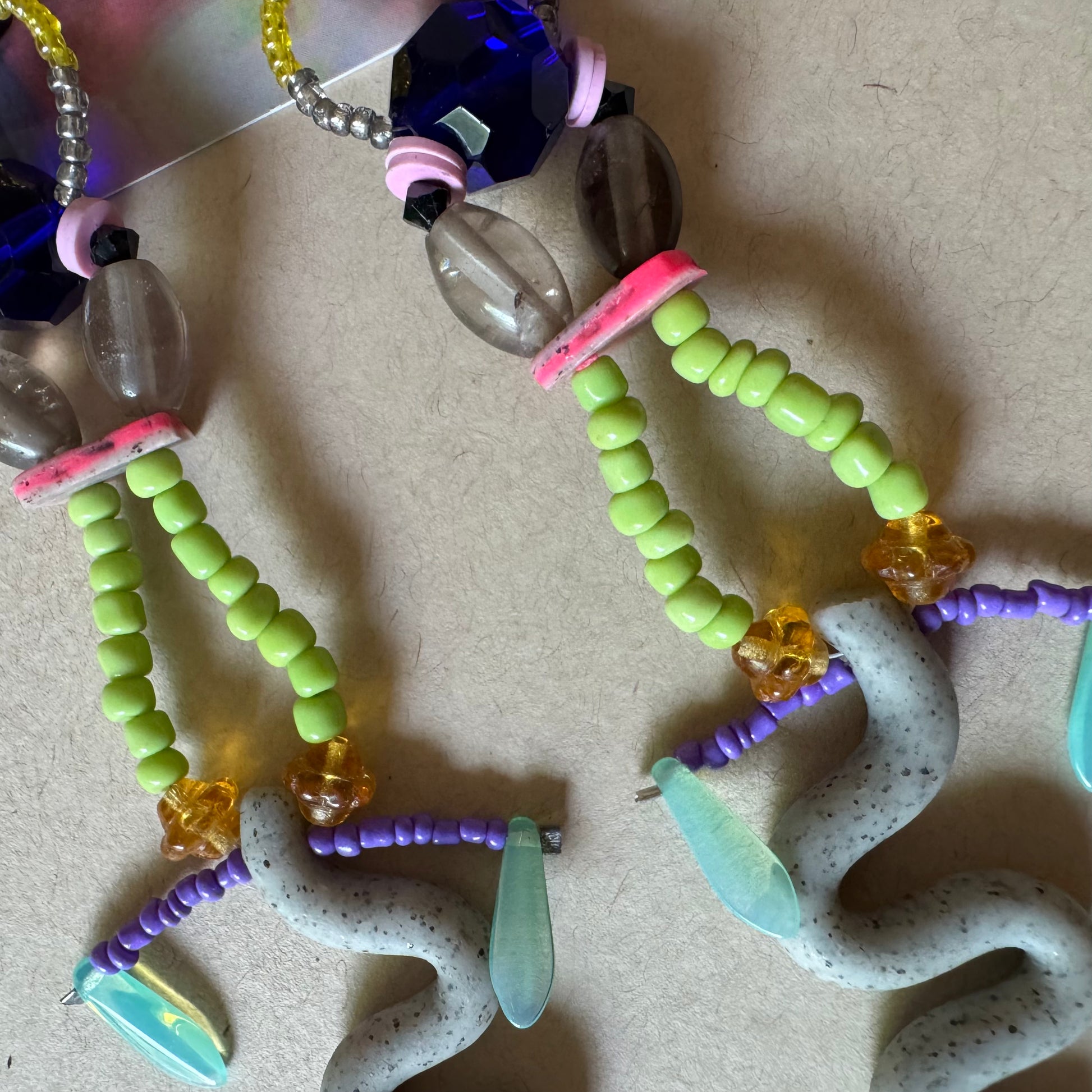 Split Signal is a bold tangle of sparkle, squiggle, and saturation. With translucent smoky beads, neon green strands, and sculpted clay serpents, these earrings move like antennae picking up forgotten frequencies. Iridescent drops flicker at the tips, channeling myth, club energy, and creature logic all at once.