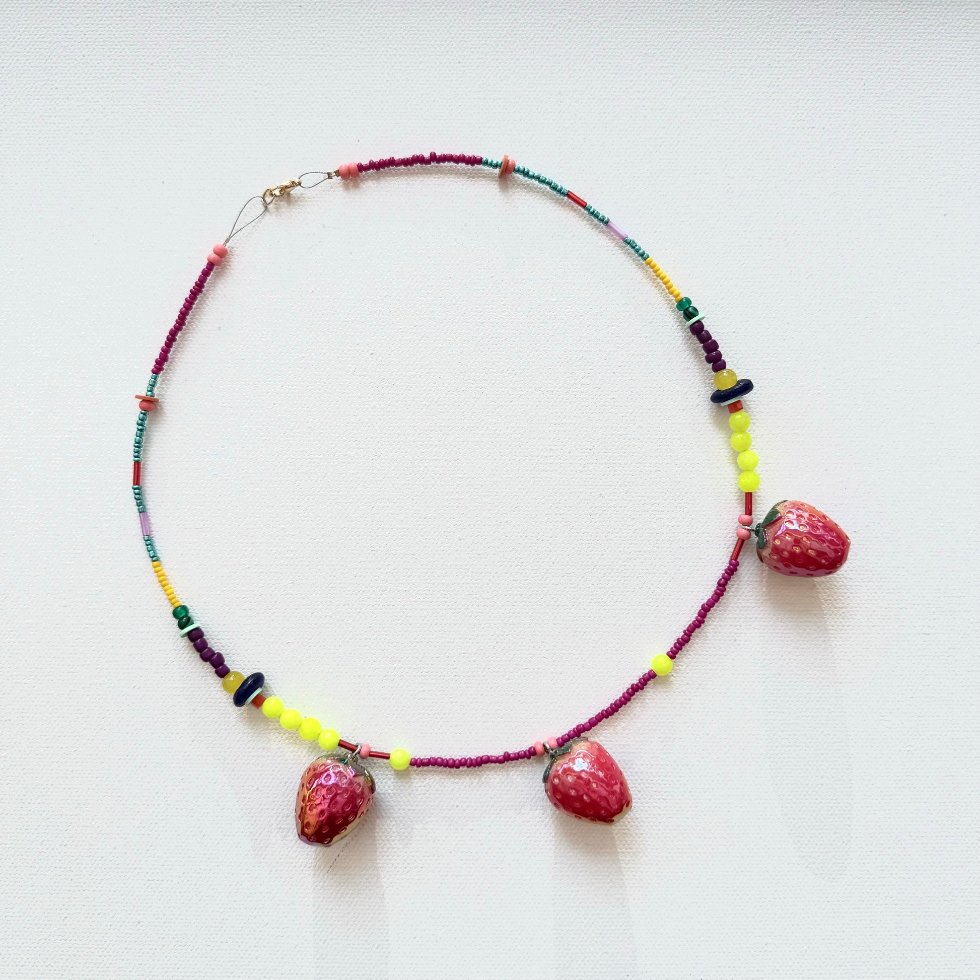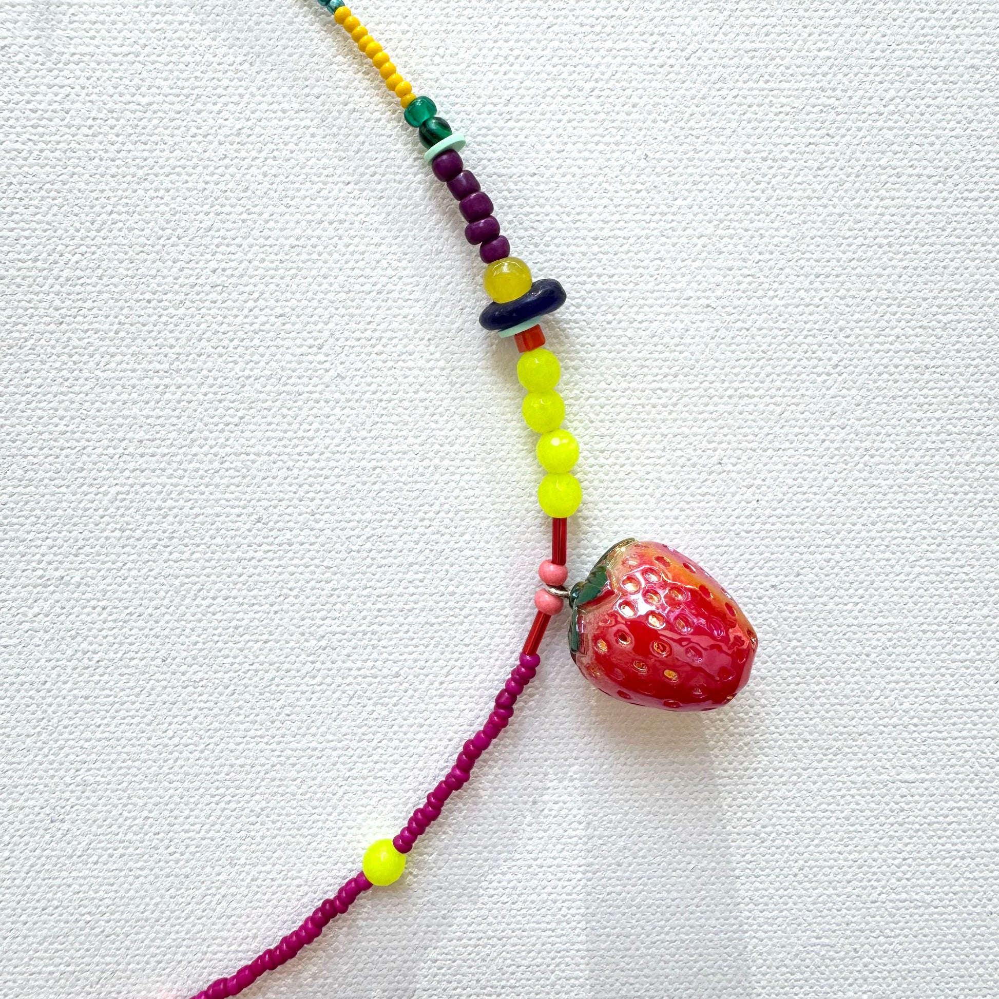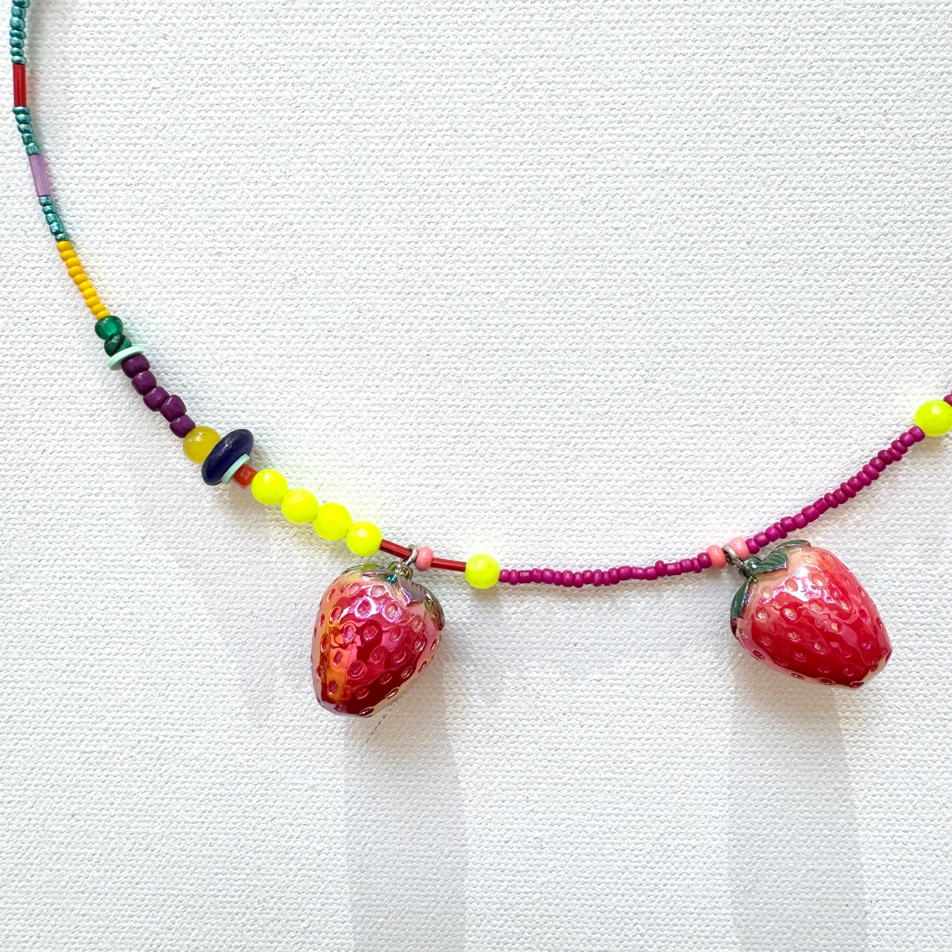 This playful handmade necklace comes in two lengths, featuring colorful beads and charming strawberry pendants that slightly vary in color, making each piece truly unique. Weighing 1.1 oz, it's a lightweight and fun accessory that adds a sweet, whimsical touch to any outfit. Perfect for those who love fruity, handcrafted jewelry with a pop of color.