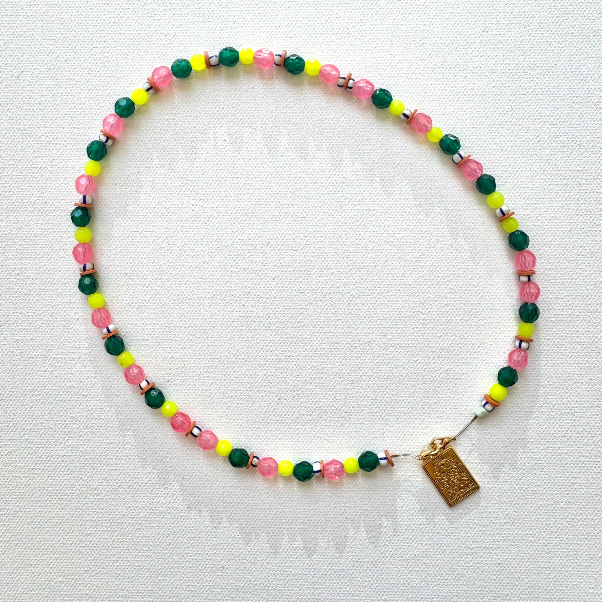 This vibrant handmade necklace features a mix of green, pink, yellow, and white beads, complemented by a bold sun charm. The playful color combination and unique charm make it a standout accessory, perfect for adding a touch of brightness to any look. Lightweight and stylish, it's an ideal piece for everyday wear.