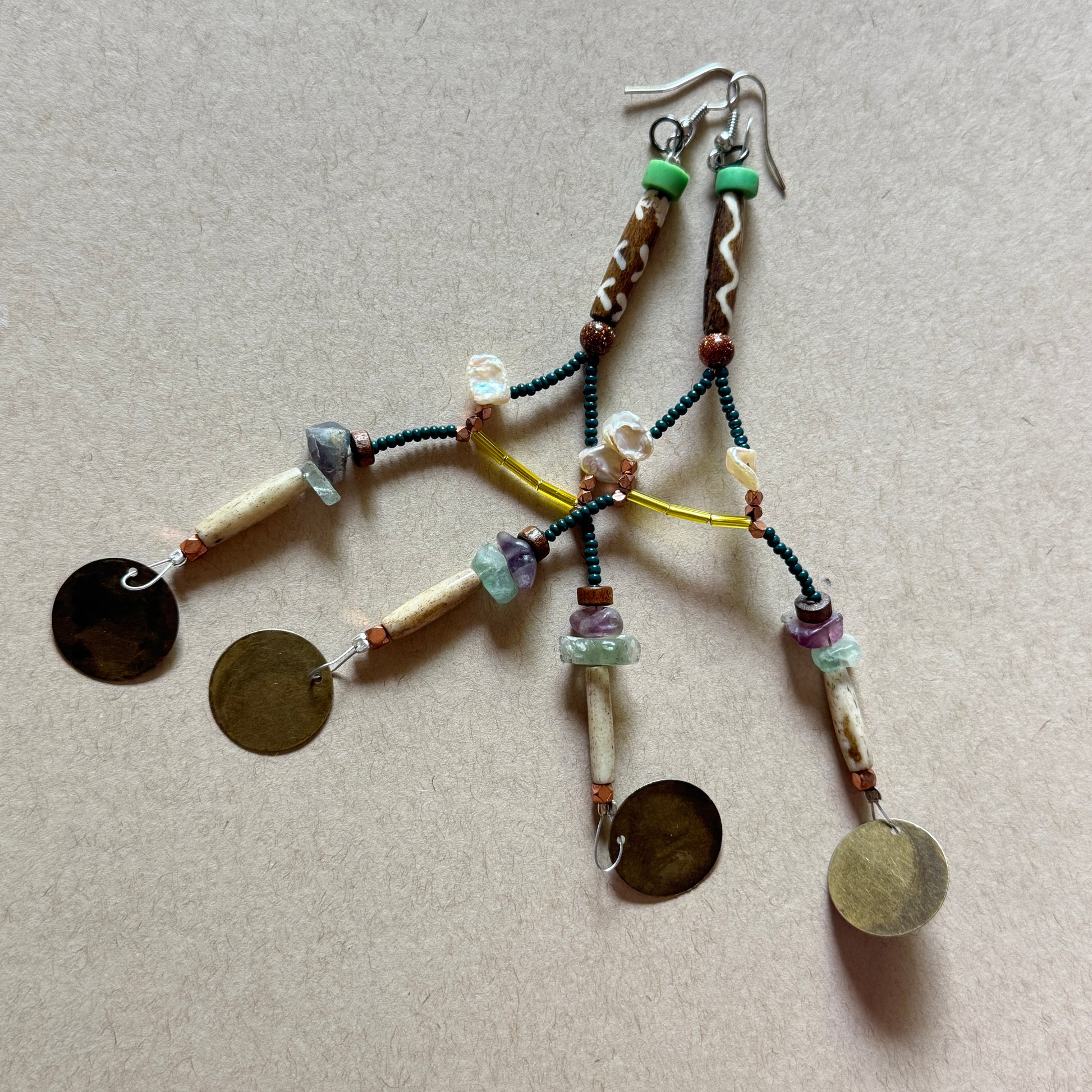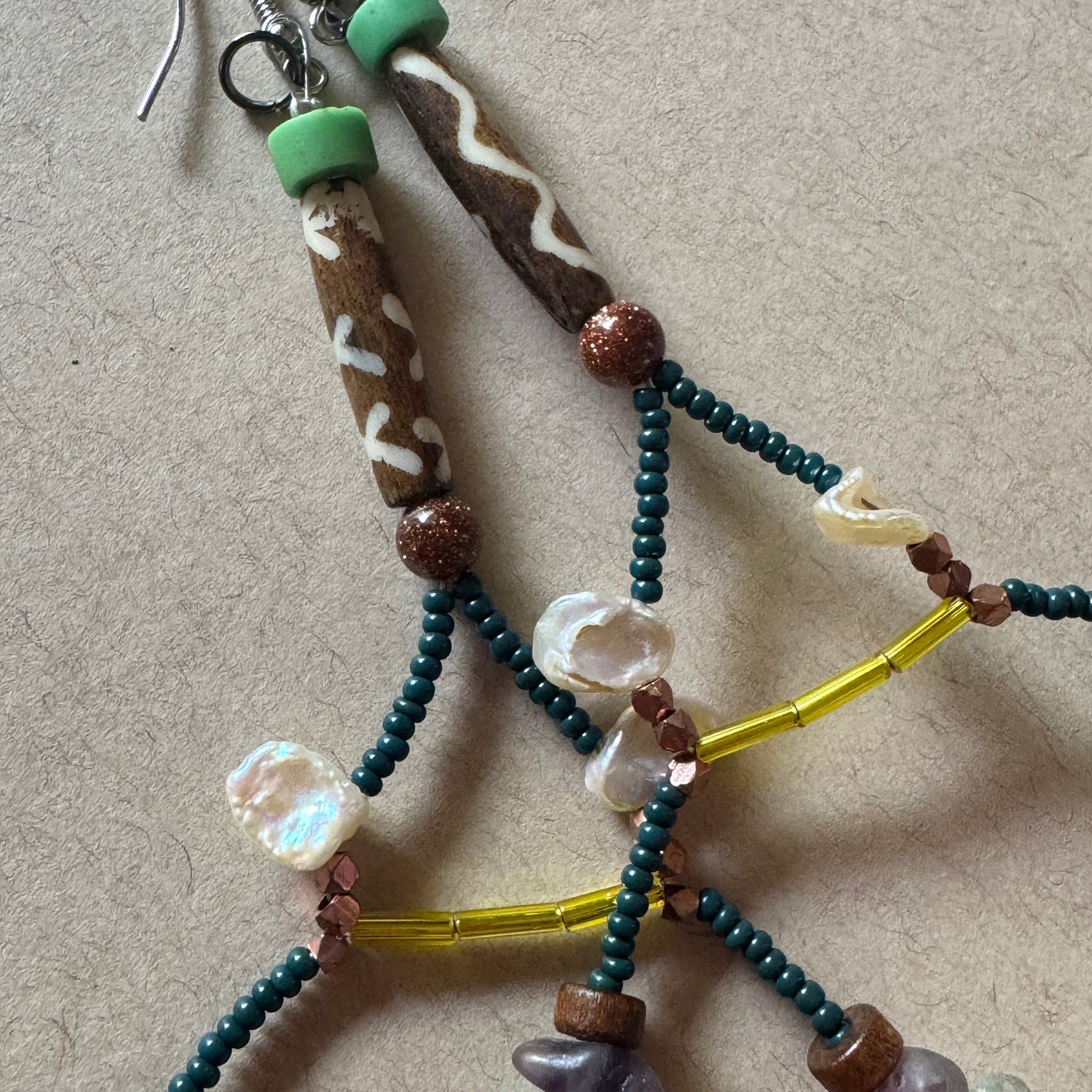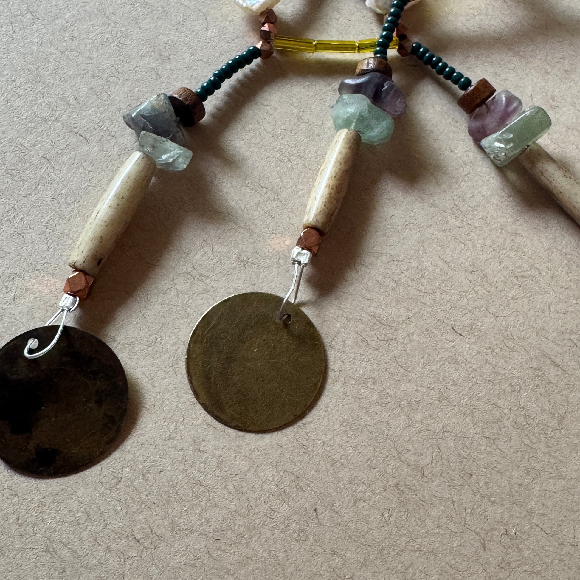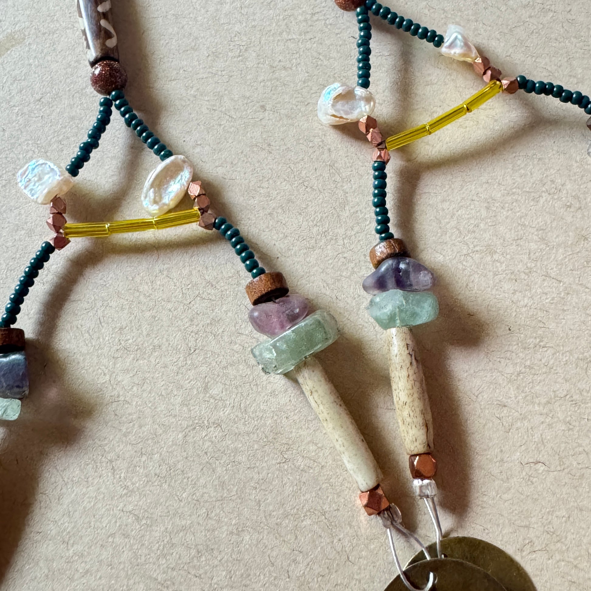 Materials: Bone, recycled glass, freshwater pearl, wood, fluorite, gold stone, brass, Czech beads