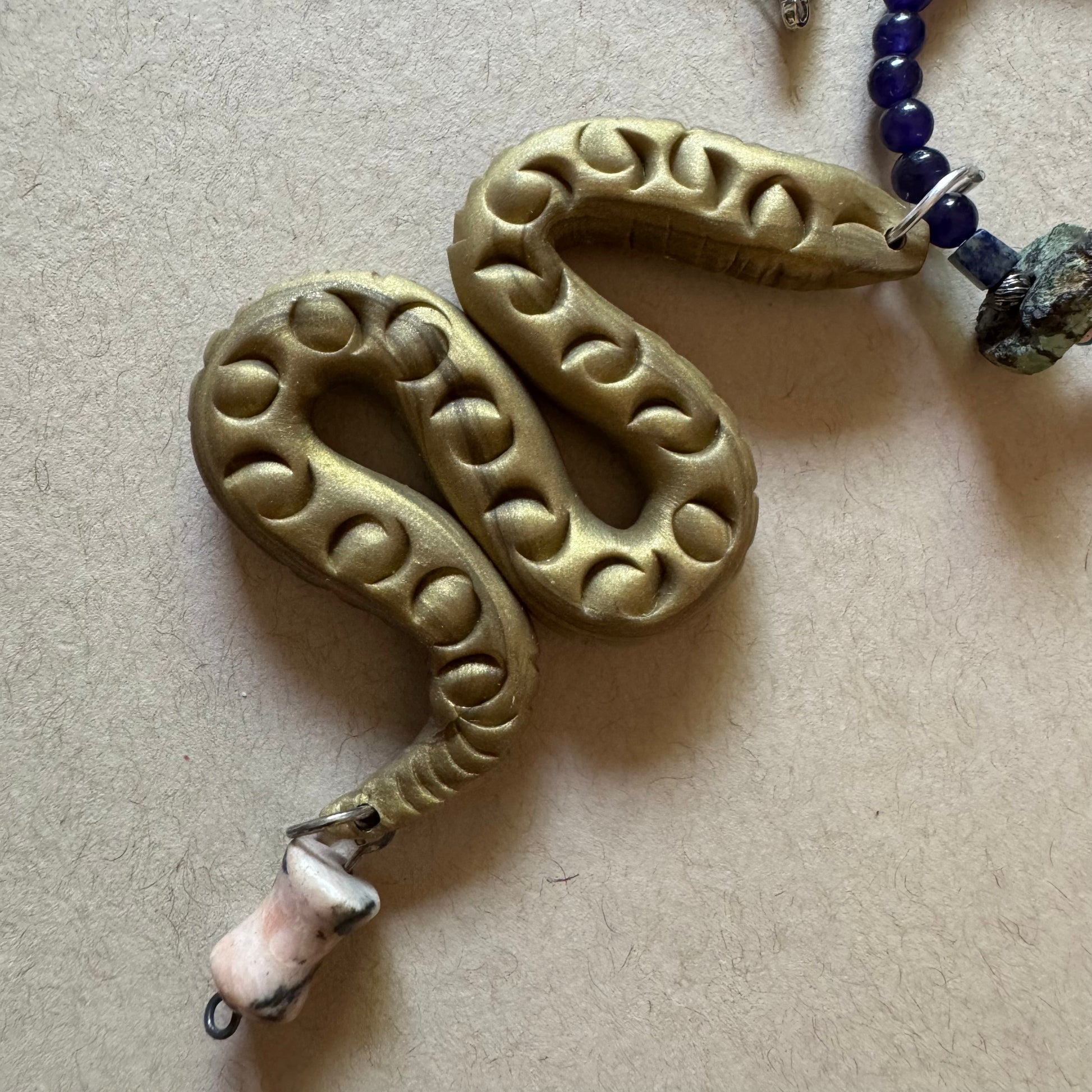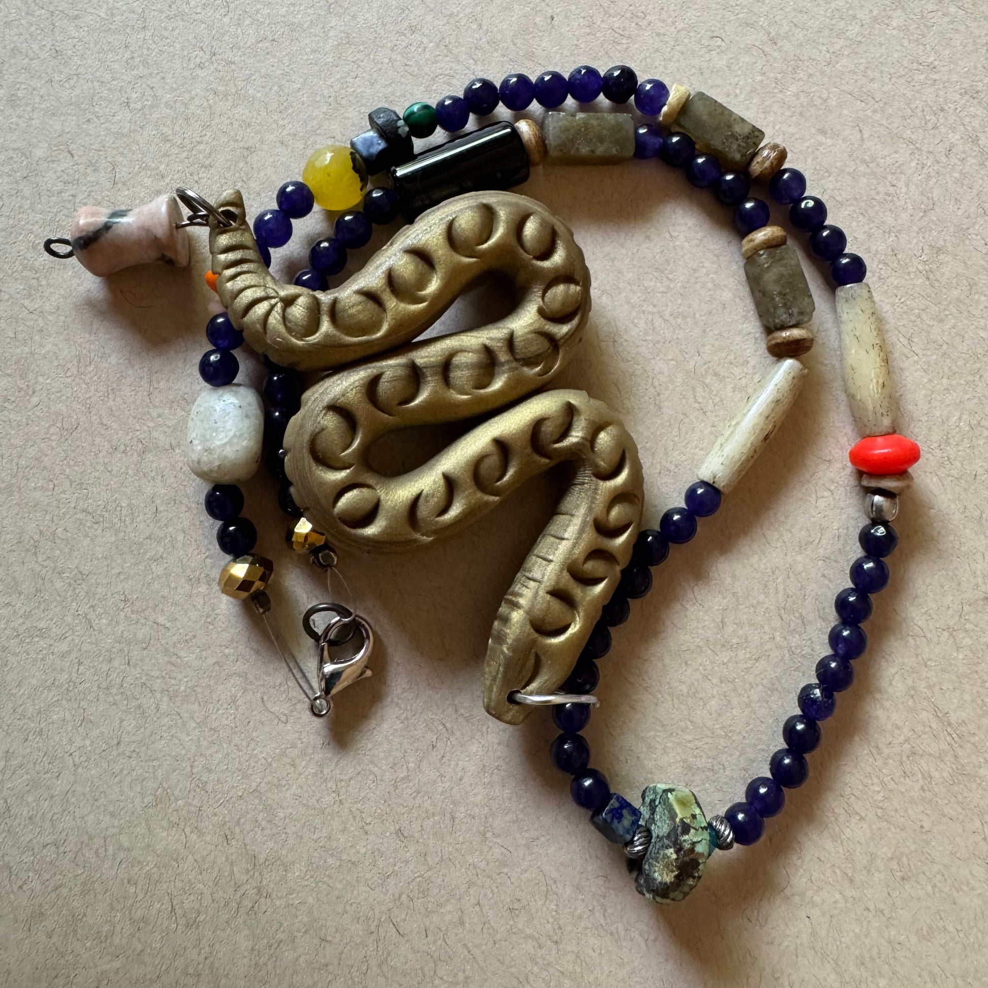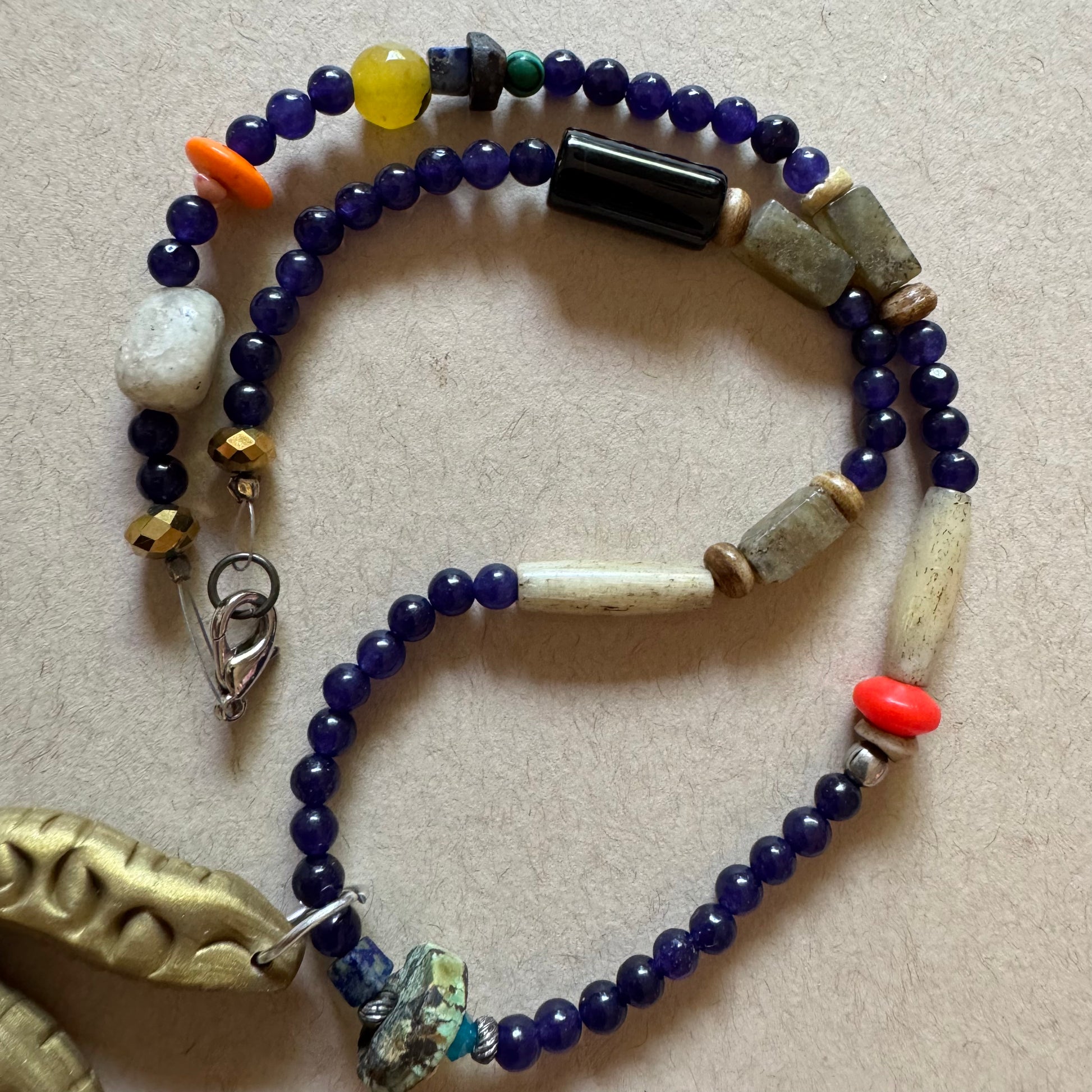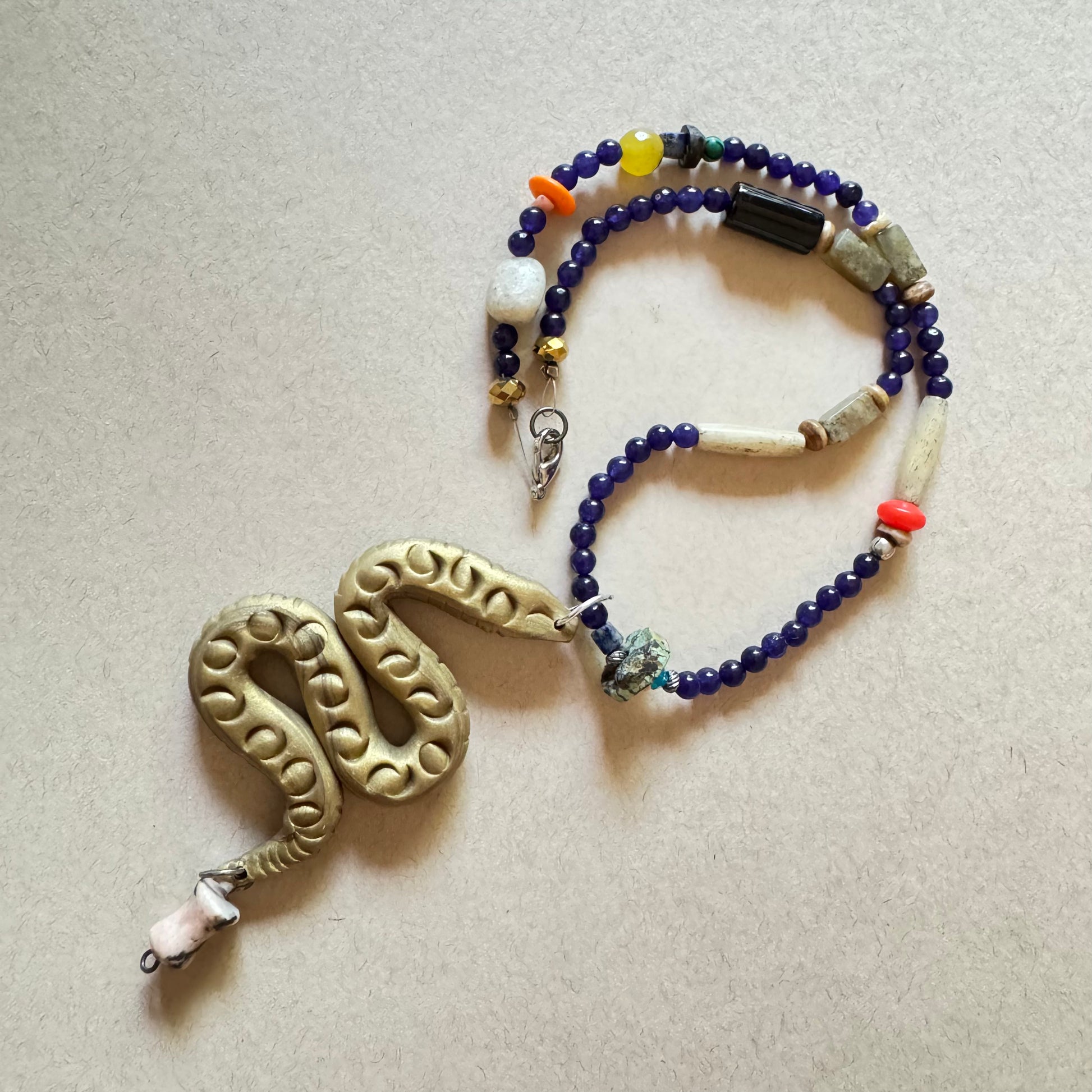 The Listener features a hand-sculpted serpent centerpiece — not coiled, not biting its tail, but watching. Anchored by deep indigo glass, coral, bone, and earth-toned stone, this 16.6" open necklace rests like an amulet across the collarbone. The snake becomes a symbol of attunement — to breath, to earth, to unseen frequencies.