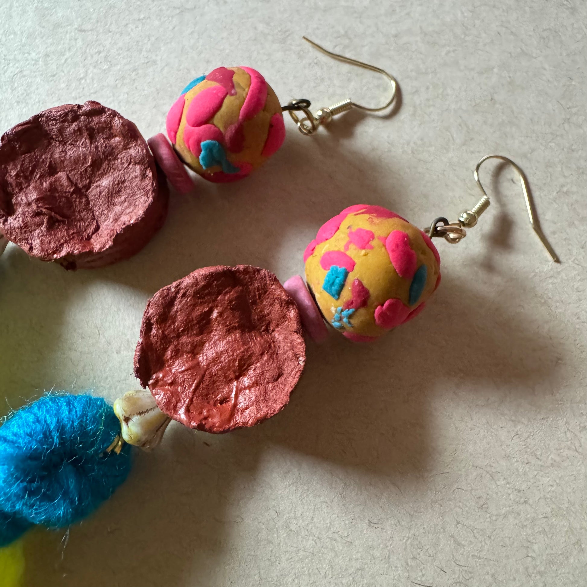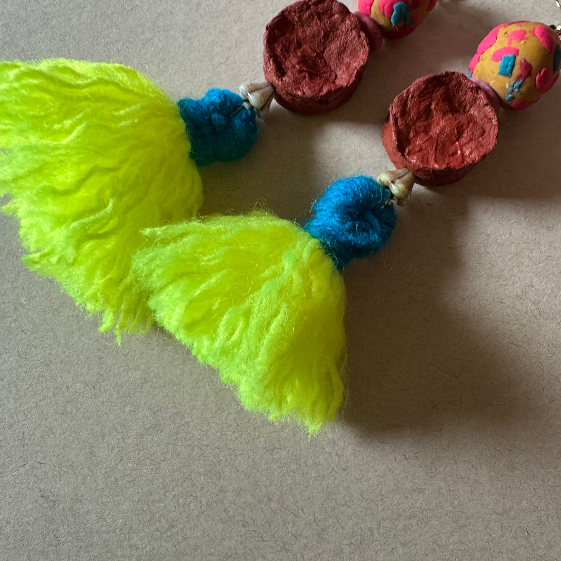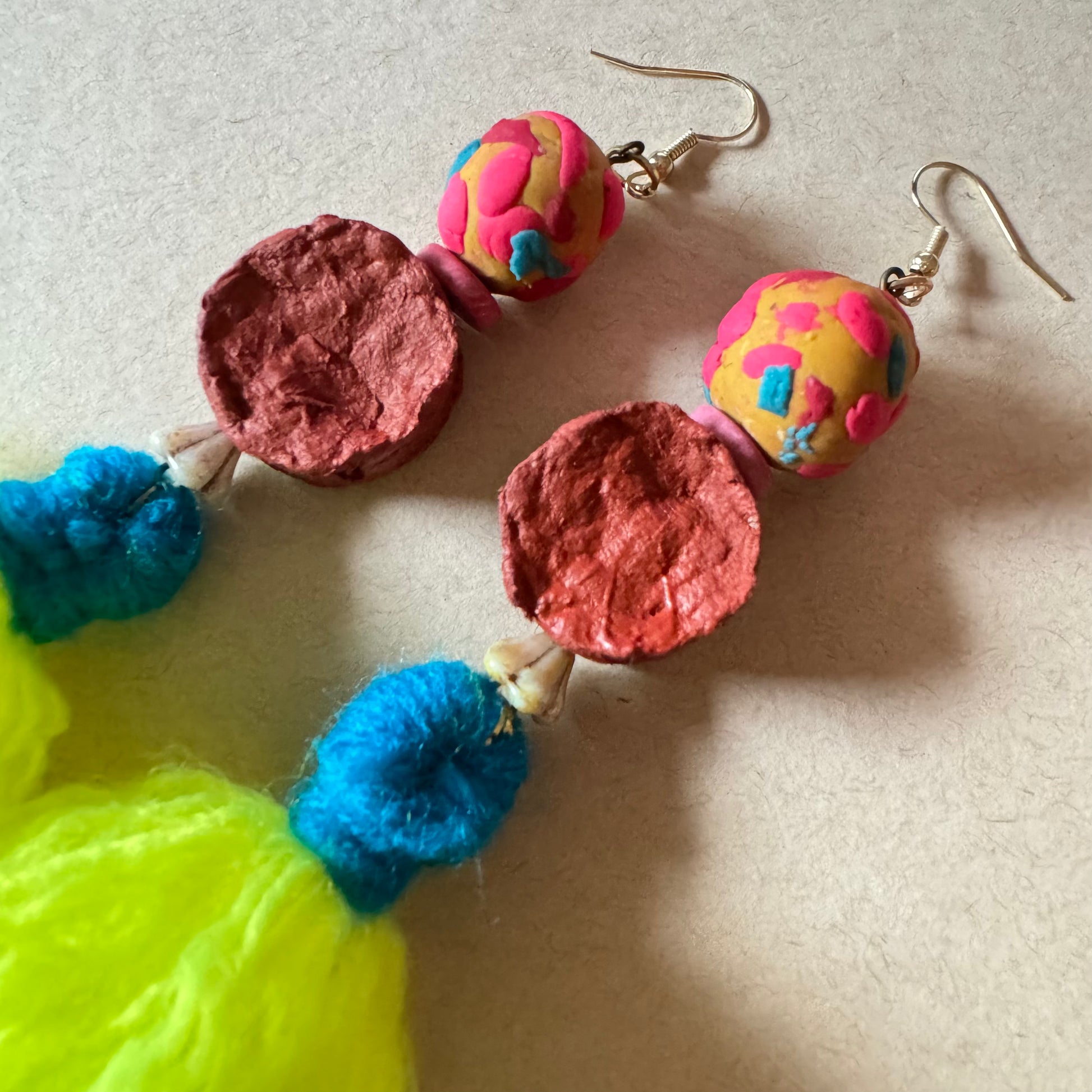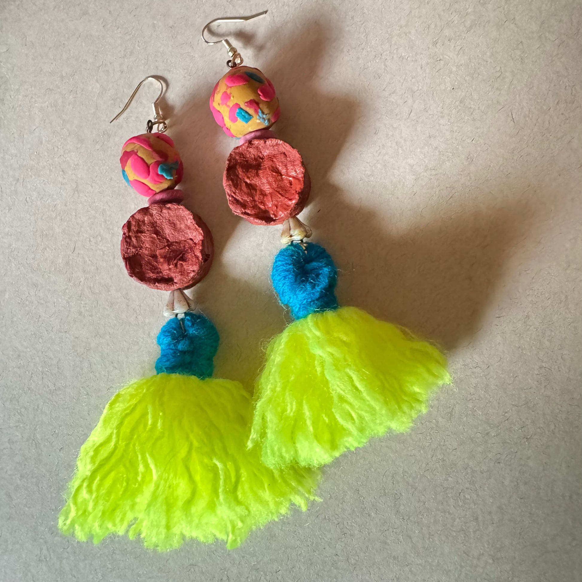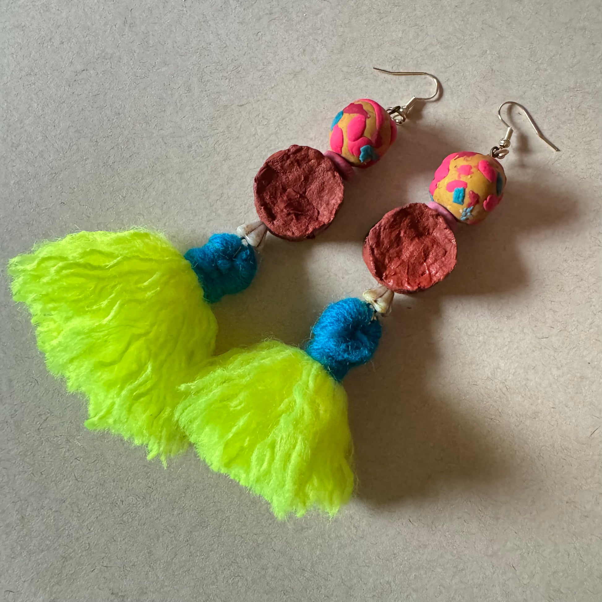 A joyful clash of texture and color—these one-of-a-kind earrings bring together hand-formed polymer clay beads, sun-baked papier-mâché discs, and vibrant yarn tassels in electric chartreuse and cerulean blue. Lightweight yet full of personality, they're playful, sculptural, and made to stand out in motion. Each pair is crafted with intention and a sense of celebration—like a little burst of color noise for your ears.